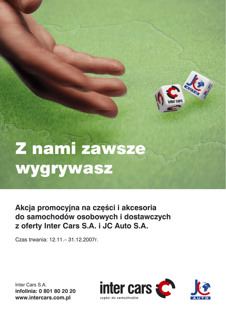Z nami zawsze wygrywasz Akcja promocyjna na części i akcesoria do samochodów osobowych i dostawczych z oferty Inter Cars S.A. i JC Auto S.A. Czas trwania: 12.11.– 31.12.2007r. Inter Cars S.A. infolinia: 0 801 80 20 20 www.intercars.com.pl W związku z połączeniem Inter Cars S.A. i JC Auto S.A. przygotowaliśmy konkurs dla wszystkich zarejestrowanych klientów tych firm. Kupuj części zamienne i akcesoria samochodowe w filiach Inter Cars S.A. i JC Auto S.A. W okresie od 12 listopada do 31 grudnia 2007 roku kupuj produkty do samochodów osobowych i dostawczych* w dowolnej filii Inter Cars S.A. lub JC Auto S.A. Sumuj wartość swoich zakupów. W okresie trwania promocji Twoje zakupy sumują się, a wielkość obrotu netto upoważnia do odbioru nagrody. Wygrywaj super atrakcyjne nagrody. obrót 6 000zł netto obrót 8 000zł netto obrót 16 000zł netto nasadki 1/2” Hans kombinezon warsztatowy 2-częściowy bluza + termos obrót 24 000zł netto radio samochodowe z CD i MP3 obrót 32 000zł netto + kurtka zimowa obrót 40 000zł netto nagrywarka DVD kuchenka mikrofalowa obrót 46 000zł netto obrót 52 000zł netto obrót 60 000zł netto zestaw kina domowego pralka zestaw muzyczny z MP3 obrót 70 000zł netto nawigacja samochodowa obrót 80 000zł netto obrót 100 000zł netto kamera cyfrowa telewizor LCD 26” Zaprezentowane zdjęcia nagród są poglądowe. *) promocja nie dotyczy zakupu opon, urządzeń i narzędzi warsztatowych. Wśród klientów, którzy w okresie trwania promocji dokonają zakupów za łączną kwotę nie mniejszą niż 80 000zł netto, rozlosowanych będzie 20 wycieczek dla 2 osób na narty w Alpy Filie INTER CARS S.A. Biała Podlaska Białystok Białystok Bielsko-Biała Błonie Bydgoszcz Ciechanów Częstochowa Czosnów Elbląg Ełk Gdańsk Gdynia Gliwice Głogów Gniezno Gorzów Wlkp. Grudziądz Inowrocław Jaworzno Jelenia Góra Kalisz Katowice Kielce Kłodzko Komorniki Konin Koszalin Kraków Kraków Kraków Krosno Kutno Legionowo Leszno Lublin Łódź Łódź ul. Brzeska 170a ul. Nar. Sił Zbrojnych 17a ul. Nowowarszawska 78 ul. Wajdeloty 2 ul. Modlińska 15 ul. Fordońska 44 ul. Płocka 15 ul. Równoległa 63c ul. Gdańska 15 ul. Grunwaldzka 2 ul. Kościuszki 26c ul. Chmielna 81/82 ul. Hutnicza 16 ul. Chorzowska 44 b ul. Przemysłowa 3 ul. Poznańska 104/106 ul. Słowiańska 59 ul. Włodka 16 ul. Górnicza 19 ul. Olszewskiego 2a ul. Flisaków 10 ul. Majkowska 34 ul. Obroki 77 ul. Wiejska 1 ul. Noworudzka 5a ul. Ks. Wawrzyniaka 2 ul. Zakładowa 16a ul. Gnieźnieńska 36 ul. Centralna 91 ul. Wielicka 44b ul. Żmujdzka 49 ul. Bieszczadzka 42g ul. Łąkoszyńska 127 ul. Zegrzyńska 4 ul. Święciechowska 55a ul. M. Rapackiego 14 ul. Dąbrowskiego 247/249 ul. Maratońska 111 Łódź Łódź Łódź Mrągowo Nowy Sącz Olsztyn Opole Ostrołęka Ostróda Ostrów Wlkp. Piekary Śląskie Piła Piotrków Tryb. Płock Poznań Poznań Pruszków Racibórz Radom Raszyn Rumia Rybnik Rzeszów Rzeszów Siedlce Skierniewice Słupsk Sosnowiec Stargard Szcz. Szczecin Szczecin Tarnów Toruń Tychy Wałcz Warszawa Warszawa Warszawa Warszawa Warszawa ul. Obywatelska 133 ul. Przybyszewskiego 199/205 ul. Zachodnia 12a ul. Olsztyńska 13 ul. Węgierska 147 ul. Leonharda 3 ul. Oleska 121 ul. I Armii W.P. 22 ul. Grunwaldzka 55a Al. J. Słowackiego 2 ul. Bytomska 288 ul. Boya-Żeleńskiego 127 ul. Słowackiego 209a ul. Graniczna 46 ul. Druskiennicka 8/10 ul. Św. Wincentego 7 Al. Jerozolimskie 451 ul. Rybnicka 42 ul. Kusocińskiego 18 ul. Graniczna 22, Janki ul. Górska 4 ul. Gajowa 4 Al. Wyzwolenia 4 ul. Dominikańska 25 ul. Warszawska 150/154 ul. Pomologiczna 3 ul. Przemysłowa 23/24 ul. Kresowa 6 ul. Usługowa 2 ul. Emilii Plater 7 ul. Marii Dąbrowskiej 34 ul. Chyszowska 12 ul. Grudziądzka 122a ul. Przemysłowa 55 ul. Bydgoska 86 ul. 11 Listopada 50 ul. Chełmżyńska 1, bud. 15 ul. Górczewska 228 ul. Jagiellońska 55 ul. Powsińska 64 Warszawa Wieliczka Włocławek Wodzisław Śl. Wrocław Wrocław Września Wyszków Zamość Zawiercie Zduńska Wola Zielona Góra Żyrardów ul. Waryńskiego 8 ul. Krakowska 56 ul. Wronia 28 ul. Łużycka 1 Al. Armii Krajowej 62 ul. Bystrzycka 69c ul. Koszarowa 4 ul. I Armii W.P. 175 ul. Młyńska 27 ul. Pogorzelska 5 ul. Szadkowska 3 ul. Dekoracyjna 8 ul. Piękna 15 Filie JC AUTO S.A. Bielsko-Biała Bielsko-Biała Częstochowa Gorzów Wlkp. Katowice Kielce Koszalin Kraków Lublin Nadarzyn Olsztyn Piaski Poznań Rzeszów Szczecin Tarnów Toruń Warszawa Warszawa Warszawa Wrocław ZielonaGóra ul. Hiacyntów 4 ul. Hałcnowska 194 ul. Krakowska 66 ul. Mościckiego 14 Al. Roździeńskiego 170 Al. Solidarności 12b ul. Boh. Warszawy 4a ul. Przewóz 2 ul. Wojciechowska 9 ul. Klonowa 48 ul. Lubelska 3 ul. Gostyńska 13 ul. Bełchatowska 28 ul. Reja 13 ul. Ku Słońcu 32 ul. Okrężna 1 ul. Polna 134/136 ul. Materii 6 ul. Surowieckiego 12 ul. Annopol 4a ul. Armii Krajowej 61 ul. Zacisze 22 Regulamin akcji promocyjnej „Z nami zawsze wygrywasz” 1. Akcja promocyjna twa od 12.11.2007r. do 31.12.2007r. 2. Organizatorami akcji są firmy Inter Cars S.A. i JC Auto S.A. 3. Akcja obejmuje klientów prowadzących działalność gospodarczą zarejestrowaną na terytorium Rzeczpospolitej Polskiej. 4. Akcja promocyjna dotyczy wszystkich produktów do samochodów osobowych i dostawczych z oferty Inter Cars S.A. i JC Auto S.A. z wyłączeniem opon, urządzeń i narzędzi warsztatowych. 5. W akcji promocyjnej mogą wziąć udział wszyscy klienci zarejestrowani w bazie Inter Cars S.A i JC Auto S.A., którzy w okresie promocji dokonają zakupów tylko filiach Inter Cars S.A oraz JC Auto. 6. Zakupy klientów w filiach Inter Cars S.A. i JC Auto S.A. na zakończenie promocji będą sumowane i suma zakupów netto klienta upoważnia go do odbioru nagrody. 7. Kategorie obrotów i nagród: a) 6 000 zł – kombinezon dwuczęściowy b) 8 000 zł – bluza polarowa (JC+INTER) + termos metalowy 1L c) 16 000 zł – HANS zestaw nasadek 1/2” + kurtka zimowa d) 24 000 zł – 