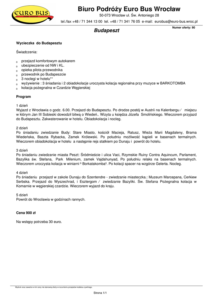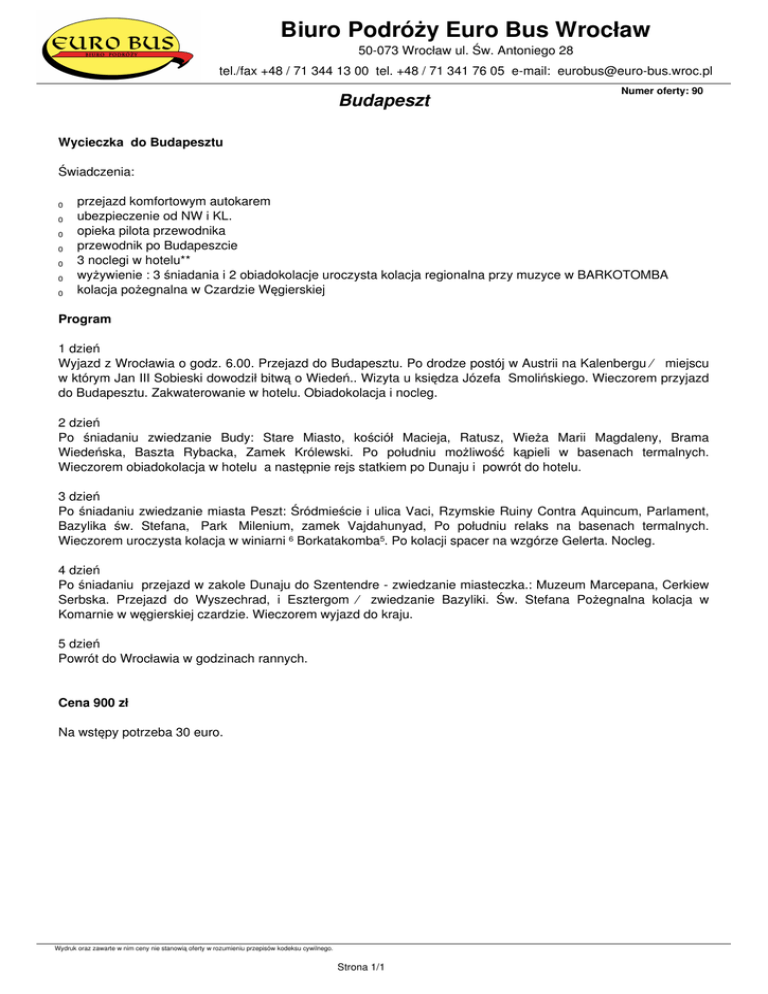 Biuro Podróży Euro Bus Wrocław 50-073 Wrocław ul. Św. Antoniego 28 tel./fax +48 / 71 344 13 00 tel. +48 / 71 341 76 05 e-mail: [email protected] Budapeszt Numer oferty: 90 Wycieczka do Budapesztu Świadczenia: • przejazd komfortowym autokarem • ubezpieczenie od NW i KL. • opieka pilota przewodnika • przewodnik po Budapeszcie • 3 noclegi w hotelu** • wyżywienie : 3 śniadania i 2 obiadokolacje uroczysta kolacja regionalna przy muzyce w BARKOTOMBA • kolacja pożegnalna w Czardzie Węgierskiej Program 1 dzień Wyjazd z Wrocławia o godz. 6.00. Przejazd do Budapesztu. Po drodze postój w Austrii na Kalenbergu – miejscu w którym Jan III Sobieski dowodził bitwą o Wiedeń.. Wizyta u księdza Józefa Smolińskiego. Wieczorem przyjazd do Budapesztu. Zakwaterowanie w hotelu. Obiadokolacja i nocleg. 2 dzień Po śniadaniu zwiedzanie Budy: Stare Miasto, kościół Macieja, Ratusz, Wieża Marii Magdaleny, Brama Wiedeńska, Baszta Rybacka, Zamek Królewski. Po południu możliwość kąpieli w basenach termalnych. Wieczorem obiadokolacja w hotelu a następnie rejs statkiem po Dunaju i powrót do hotelu. 3 dzień Po śniadaniu zwiedzanie miasta Peszt: Śródmieście i ulica Vaci, Rzymskie Ruiny Contra Aquincum, Parlament, Bazylika św. Stefana, Park Milenium, zamek Vajdahunyad, Po południu relaks na basenach termalnych. Wieczorem uroczysta kolacja w winiarni „ Borkatakomba”. Po kolacji spacer na wzgórze Gelerta. Nocleg. 4 dzień Po śniadaniu przejazd w zakole Dunaju do Szentendre - zwiedzanie miasteczka.: Muzeum Marcepana, Cerkiew Serbska. Przejazd do Wyszechrad, i Esztergom – zwiedzanie Bazyliki. Św. Stefana Pożegnalna kolacja w Komarnie w węgierskiej czardzie. Wieczorem wyjazd do kraju. 5 dzień Powrót do Wrocławia w godzinach rannych. Cena 900 zł Na wstępy potrzeba 30 euro. Wydruk oraz zawarte w nim ceny nie stanowią oferty w rozumieniu przepisów kodeksu cywilnego. Strona 1/1