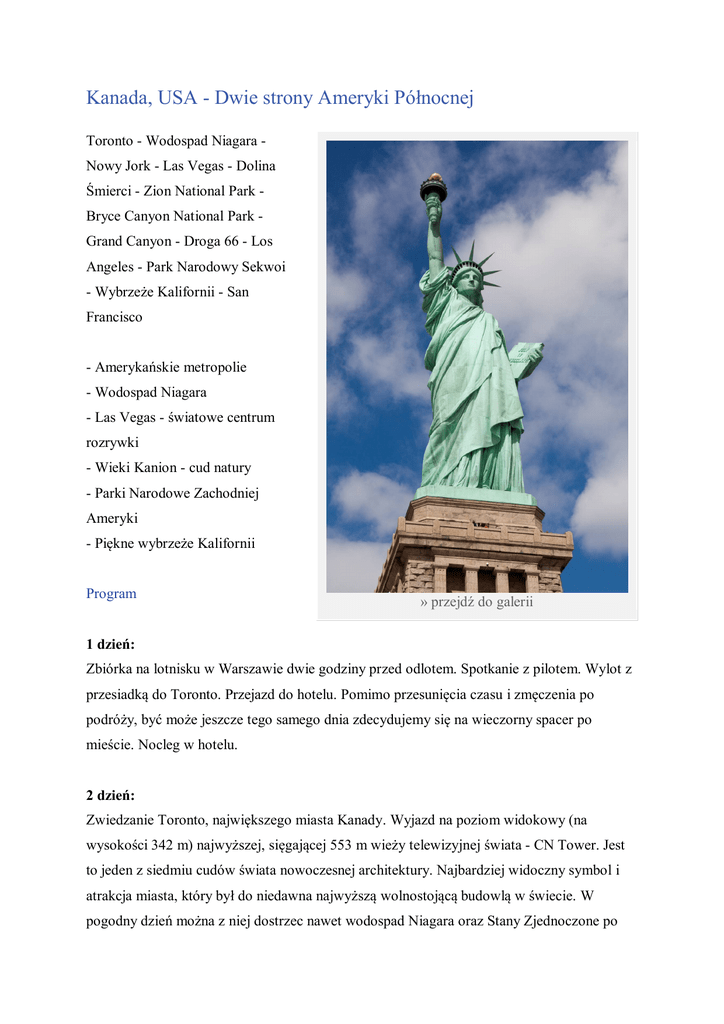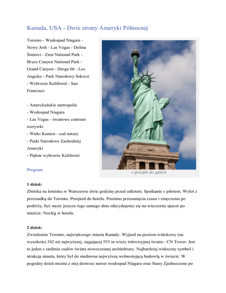 Kanada, USA - Dwie strony Ameryki Północnej Toronto - Wodospad Niagara Nowy Jork - Las Vegas - Dolina Śmierci - Zion National Park Bryce Canyon National Park Grand Canyon - Droga 66 - Los Angeles - Park Narodowy Sekwoi - Wybrzeże Kalifornii - San Francisco - Amerykańskie metropolie - Wodospad Niagara - Las Vegas - światowe centrum rozrywki - Wieki Kanion - cud natury - Parki Narodowe Zachodniej Ameryki - Piękne wybrzeże Kalifornii Program » przejdź do galerii 1 dzień: Zbiórka na lotnisku w Warszawie dwie godziny przed odlotem. Spotkanie z pilotem. Wylot z przesiadką do Toronto. Przejazd do hotelu. Pomimo przesunięcia czasu i zmęczenia po podróży, być może jeszcze tego samego dnia zdecydujemy się na wieczorny spacer po mieście. Nocleg w hotelu. 2 dzień: Zwiedzanie Toronto, największego miasta Kanady. Wyjazd na poziom widokowy (na wysokości 342 m) najwyższej, sięgającej 553 m wieży telewizyjnej świata - CN Tower. Jest to jeden z siedmiu cudów świata nowoczesnej architektury. Najbardziej widoczny symbol i atrakcja miasta, który był do niedawna najwyższą wolnostojącą budowlą w świecie. W pogodny dzień można z niej dostrzec nawet wodospad Niagara oraz Stany Zjednoczone po drugiej stronie jeziora Ontario. Po nasyceniu się widokiem zwiedzanie nowoczesnego Downtown i śmiało przebudowanej dzielnicy Distilery. Zobaczymy też budynek parlamentu prowincji oraz nowy i stary ratusz. Rejs małym statkiem po jeziorze Ontario, podczas którego będziemy mieli fantastyczną możliwość fotografowania Toronto z innej perspektywy. Powrót do hotelu na nocleg. 3 dzień: Przejazd (pociągiem lub autokarem) do Wodospadów Niagara, najsłynniejszych wodospadów Ameryki Północnej. Wodospady leżą na granicy USA, a różnych punktów widokowych można doskonale obserwować ten naturalny fenomen. Fakultatywnie i w miarę wolnych miejsc krótki rejs widokowy po rzece Niagara. Nocleg nieopodal wodospadów (po stronie USA). 4 dzień: Przejazd na lotnisko i wylot do Nowego Jorku. Po przylocie rozpoczynamy zwiedzanie tej niesamowitej metropolii, w której mówi się aż 800 językami. Rejs na wyspę na której znajduje się Statua Wolności, symbol miasta. To właśnie tędy przepływały statki z emigrantami marzącymi o nowym, lepszym życiu. Będzie można doskonale sfotografować statuę z pokładu statku. Nastepnie czeka nas eksploracja Dolnego Manhattanu, serca Nowego Jorku, gdzie znajduje się 9/11 Memorial. Tu stały wieże World Trade Center, a dzisiaj obok wybudowano One World Trade Center, najwyższy drapacz chmur miasta (541 m). Przechadzka po Wall Street z budynkiem giełdy - tą ulicą poruszają się rekiny światowej finansjery. Następnie będziemy podziwiać historyczne wieżowce z najsłynniejszym z wielkich drapaczy chmur lat XXX - Empire State Building. Wieczorem oglądamy pełen świateł Times Square. Nocleg w hotelu w Nowym Jorku. 5 dzień: Kolejny pełen wrażeń dzień w Nowym Jorku. Wyprawa do Brooklynu i spacer po ciekawej dzielnicy z XIX-wiecznymi domami. Jak na USA, są to już prawdziwe zabytki. Zobaczymy też panoramę Manhattanu z perspektywy innej dzielnicy i Mostu Brooklińskiego. Po powrocie na Manhattan czeka nas jeszcze spacer po Central Parku, podejście pod gmach Metropolitan Opera i zwiedzanie katedry św. Patryka. Wieczorem spacer po Broadwayu, gdzie mieści się mnóstwo teatrów i kabaretów. Dla chętnych, po wcześniejszym zgłoszeniu możliwość udziału w jednym ze spektakli (bilet płatny dodatkowo). Nocleg w hotelu w Nowym Jorku. 6 dzień: Przejazd na lotnisko i wylot daleko na zachód USA, do Las Vegas. Znajdujemy się w mieście hazardu i rozrywek w pustynnej, słonecznej Nevadzie. Zdumienie w nas wzbudzą największe atrakcje miasta - słynne hotele i przylegające do nich kasyna. Ten świat ułudy nabiera blasku po zmroku, gdy zapalają się tysiące neonów. Wtedy też w mieście odbywa się wiele koncertów i znakomitych spektakli. Z pewnością każdy, nawet najbardziej oszczędny, przeznaczy pewną sumę pieniędzy na przegranie w kasynie, aby sprawdzić czy czasami właśnie jemu nie sprzyja tego dnia wyjątkowe szczęście. Kolacja. Nocleg w Las Vegas. 7 dzień: Wcześnie rano wycieczka do najgorętszego miejsca kontynentu – Parku Narodowego Doliny Śmierci. Docieramy do Badwater, najniższej depresji Ameryki Północnej (86 m p.p.m.) – to tutaj notowano rekordowo wysokie temperatury. Zobaczymy księżycowe krajobrazy, gdzie życie niemal nie istnieje. (Uwaga, z powodów wysokich temperatur wjazd na dno doliny może być okresowo zamykany). Po powrocie do Las Vegas możliwość zakupów w jednym z outletów. To raj dla miłośników zakupów, można zaopatrzyć się tutaj w markowe ubrania po przystępnych cenach. Wieczorem zwiedzanie najsłynniejszych hoteli i kasyn. Jest tu hotel w kształcie egipskiej piramidy, Wieża Eiffel’a, ulice Paryża pod dachem, a nawet kanały Wenecji z Pałacem Dożów. Nocleg w Las Vegas. 8 dzień: Śniadanie. Wyruszamy z miasta, aby podziwiać naturalne dzieła sztuki. Kierujemy się w kierunku Wyżyny Kolorado do Zion National Park, bardzo ciekawego parku narodowego w stanie Utah. Podróżujemy przez kraj Mormonów, świątynie wyznawców tej religii mijamy w każdym miasteczku po drodze. W Zion podziwianie przepięknych form skalnych stworzonych przez naturę, Kanionu Rzeki Dziewiczej i typowej dla Zachodu roślinności. Kolejnym parkiem narodowym na trasie jest Bryce Canyon National Park, uznawany za prawdziwy klejnot krajobrazowy Stanów Zjednoczonych. Powodem jest przepiękna sceneria wysokich, stromych skał o fantastycznych kształtach. Z każdego miejsca ukazuje się inny, wspaniały widok na wyjątkowe, mieniące się kolorami formy skalne i piękne krajobrazy. Wjedziemy do najwyższego punktu, a po drodze zobaczymy m.in. naturalny most - piękny łuk skalny. Nocleg w motelu. 9 dzień: Wyjazd ze stanu Utah do Arizony. Postój w miasteczku Page nad rzeką Kolorado. Z