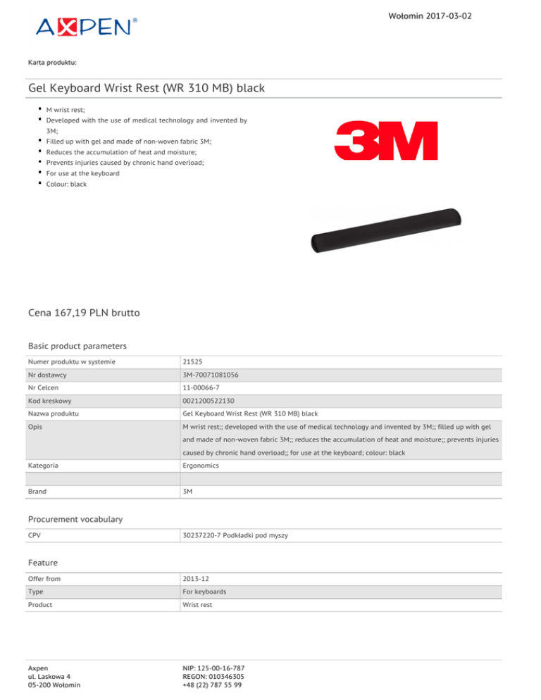 Wołomin 2017-03-02 Karta produktu: Gel Keyboard Wrist Rest (WR 310 MB) black M wrist rest; Developed with the use of medical technology and invented by 3M; Filled up with gel and made of non-woven fabric 3M; Reduces the accumulation of heat and moisture; Prevents injuries caused by chronic hand overload; For use at the keyboard Colour: black Cena 167,19 PLN brutto Basic product parameters Numer produktu w systemie 21525 Nr dostawcy 3M-70071081056 Nr Celcen 11-00066-7 Kod kreskowy 0021200522130 Nazwa produktu Gel Keyboard Wrist Rest (WR 310 MB) black Opis M wrist rest;; developed with the use of medical technology and invented by 3M;; filled up with gel and made of non-woven fabric 3M;; reduces the accumulation of heat and moisture;; prevents injuries caused by chronic hand overload;; for use at the keyboard; colour: black Kategoria Ergonomics Brand 3M Procurement vocabulary CPV 30237220-7 Podkładki pod myszy Feature Offer from 2013-12 Type For keyboards Product Wrist rest Axpen ul. Laskowa 4 05-200 Wołomin NIP: 125-00-16-787 REGON: 010346305 +48 (22) 787 55 99 Wołomin 2017-03-02 Karta katalogowa produktu cd. Gel Keyboard Wrist Rest (WR 310 MB) black Certifications New product Standard Hit Standard Colour Colour Black Serdecznie zapraszamy do współpracy Axpen zespół. Axpen ul. Laskowa 4 05-200 Wołomin NIP: 125-00-16-787 REGON: 010346305 +48 (22) 787 55 99