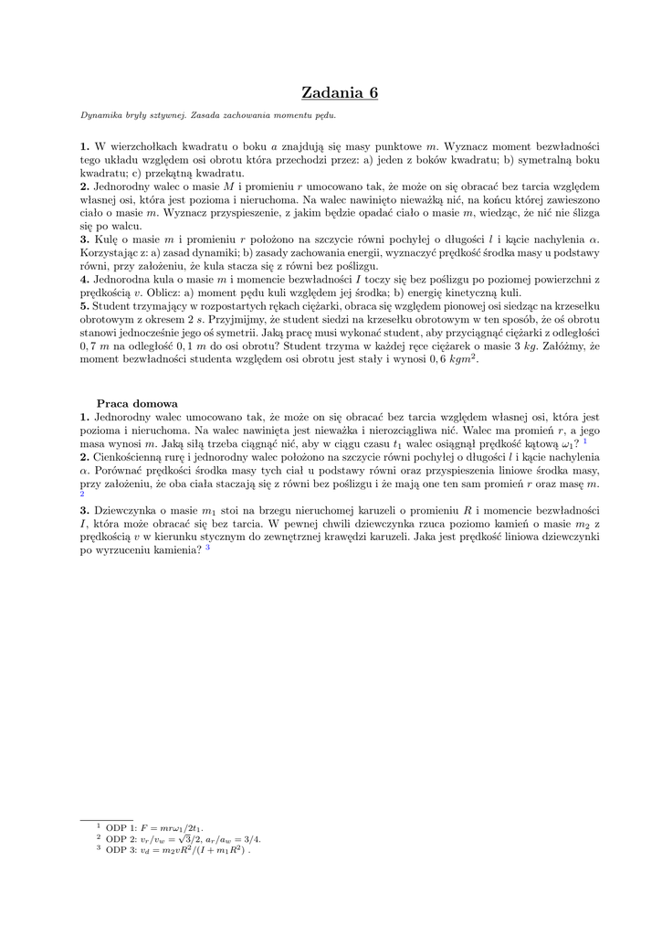 Zadania 6 Dynamika bryły sztywnej. Zasada zachowania momentu pędu. 1. W wierzchołkach kwadratu o boku a znajdują się masy punktowe m. Wyznacz moment bezwładności tego układu względem osi obrotu która przechodzi przez: a) jeden z boków kwadratu; b) symetralną boku kwadratu; c) przekątną kwadratu. 2. Jednorodny walec o masie M i promieniu r umocowano tak, że może on się obracać bez tarcia względem własnej osi, która jest pozioma i nieruchoma. Na walec nawinięto nieważką nić, na końcu której zawieszono ciało o masie m. Wyznacz przyspieszenie, z jakim będzie opadać ciało o masie m, wiedząc, że nić nie ślizga się po walcu. 3. Kulę o masie m i promieniu r położono na szczycie równi pochyłej o długości l i kącie nachylenia α. Korzystając z: a) zasad dynamiki; b) zasady zachowania energii, wyznaczyć prędkość środka masy u podstawy równi, przy założeniu, że kula stacza się z równi bez poślizgu. 4. Jednorodna kula o masie m i momencie bezwładności I toczy się bez poślizgu po poziomej powierzchni z prędkością v. Oblicz: a) moment pędu kuli względem jej środka; b) energię kinetyczną kuli. 5. Student trzymający w rozpostartych rękach ciężarki, obraca się względem pionowej osi siedząc na krzesełku obrotowym z okresem 2 s. Przyjmijmy, że student siedzi na krzesełku obrotowym w ten sposób, że oś obrotu stanowi jednocześnie jego oś symetrii. Jaką pracę musi wykonać student, aby przyciągnąć ciężarki z odległości 0, 7 m na odległość 0, 1 m do osi obrotu? Student trzyma w każdej ręce ciężarek o masie 3 kg. Załóżmy, że moment bezwładności studenta względem osi obrotu jest stały i wynosi 0, 6 kgm2 . Praca domowa 1. Jednorodny walec umocowano tak, że może on się obracać bez tarcia względem własnej osi, która jest pozioma i nieruchoma. Na walec nawinięta jest nieważka i nierozciągliwa nić. Walec ma promień r, a jego masa wynosi m. Jaką siłą trzeba ciągnąć nić, aby w ciągu czasu t1 walec osiągnął prędkość kątową ω1 ? 1 2. Cienkościenną rurę i jednorodny walec położono na szczycie równi pochyłej o długości l i kącie nachylenia α. Porównać prędkości środka masy tych ciał u podstawy równi oraz przyspieszenia liniowe środka masy, przy założeniu, że oba ciała staczają się z równi bez poślizgu i że mają one ten sam promień r oraz masę m. 2 3. Dziewczynka o masie m1 stoi na brzegu nieruchomej karuzeli o promieniu R i momencie bezwładności I, która może obracać się bez tarcia. W pewnej chwili dziewczynka rzuca poziomo kamień o masie m2 z prędkością v w kierunku stycznym do zewnętrznej krawędzi karuzeli. Jaka jest prędkość liniowa dziewczynki po wyrzuceniu kamienia? 3 1 2 3 ODP 1: F = mrω√ 1 /2t1 . ODP 2: vr /vw = 3/2, ar /aw = 3/4. ODP 3: vd = m2 vR2 /(I + m1 R2 ) .