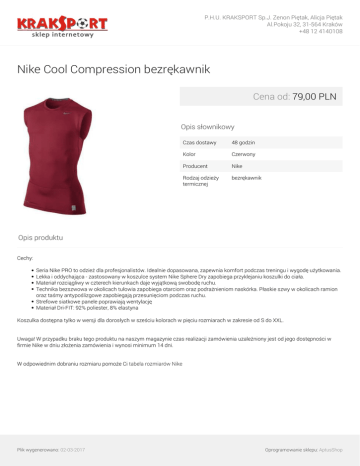 P.H.U. KRAKSPORT Sp.J. Zenon Piętak, Alicja Piętak Al.Pokoju 32, 31-564 Kraków +48 12 4140108 Nike Cool Compression bezrękawnik Cena od: 79,00 PLN Opis słownikowy Czas dostawy 48 godzin Kolor Czerwony Producent Nike Rodzaj odzieży termicznej bezrękawnik Opis produktu Cechy: Seria Nike PRO to odzież dla profesjonalistów. Idealnie dopasowana, zapewnia komfort podczas treningu i wygodę użytkowania. Lekka i oddychająca - zastosowany w koszulce system Nike Sphere Dry zapobiega przyklejaniu koszulki do ciała. Materiał rozciągliwy w czterech kierunkach daje wyjątkową swobodę ruchu. Technika bezszwowa w okolicach tułowia zapobiega otarciom oraz podrażnieniom naskórka. Płaskie szwy w okolicach ramion oraz taśmy antypoślizgowe zapobiegają przesunięciom podczas ruchu. Strefowe siatkowe panele poprawiają wentylację Materiał Dri-FIT: 92% poliester, 8% elastyna Koszulka dostępna tylko w wersji dla dorosłych w sześciu kolorach w pięciu rozmiarach w zakresie od S do XXL. Uwaga! W przypadku braku tego produktu na naszym magazynie czas realizacji zamówienia uzależniony jest od jego dostępności w firmie Nike w dniu złożenia zamówienia i wynosi minimum 14 dni. W odpowiednim dobraniu rozmiaru pomoże Ci tabela rozmiarów Nike Plik wygenerowano: 02-03-2017 Oprogramowanie sklepu: AptusShop P.H.U. KRAKSPORT Sp.J. Zenon Piętak, Alicja Piętak Al.Pokoju 32, 31-564 Kraków +48 12 4140108 Warianty produktu S 79,00 PLN Galeria Plik wygenerowano: 02-03-2017 Powered by TCPDF (www.tcpdf.org) Oprogramowanie sklepu: AptusShop
