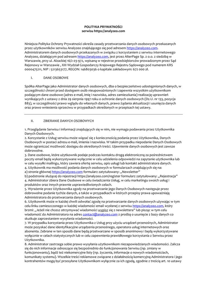 POLITYKA PRYWATNOŚCI serwisu https://analyzeo.com Niniejsza Polityka Ochrony Prywatności określa zasady przetwarzania danych osobowych przekazanych przez użytkowników serwisu Analyzeo znajdującego się pod adresem https://analyzeo.com. Administratorem danych osobowych przekazanych w związku z korzystaniem z serwisu internetowego Analyzeo, działającym pod adresem https://analyzeo.com, jest przez AlterPage Sp. z o.o. z siedzibą w Warszawie, przy ul. Alzackiej 16/2 03-972, wpisaną w rejestrze przedsiębiorców prowadzonym przez Sąd Rejonowy w Warszawie , XIII Wydział Gospodarczy Krajowego Rejestru Sądowego pod numerem KRS 0000475211, NIP : 5213653177, REGON: 146803036 o kapitale zakładowym: 672 000 zł. I. DANE OSOBOWE Spółka AlterPage jako Administrator danych osobowych, dba o bezpieczeństwo udostępnionych danych, w szczególności chroni przed dostępem osób nieupoważnionych i zapewnia wszystkim użytkownikom podającym dane osobowe (adres e-mail, imię i nazwisko, adres zamieszkania) realizację uprawnień wynikających z ustawy z dnia 29 sierpnia 1997 roku o ochronie danych osobowych (Dz.U. nr 133, pozycja 883), w szczególności prawo wglądu do własnych danych, prawo żądania aktualizacji i usunięcia danych oraz prawo wniesienia sprzeciwu w przypadkach określonych w przepisach tej ustawy. II. ZBIERANIE DANYCH OSOBOWYCH 1. Przeglądanie Serwisu i informacji znajdujących się w nim, nie wymaga podawania przez Użytkownika Danych Osobowych. 2. Korzystanie z Usług serwisu może wiązać się z koniecznością podania przez Użytkownika, Danych Osobowych w postaci adresu e-mail, imienia i nazwiska. W takim przypadku niepodanie Danych Osobowych może ograniczać możliwość dostępu do określonych treści. Ujawnienie danych osobowych jest zawsze dobrowolne. 3. Dane osobowe, które użytkownik podaje podczas kontaktu drogą elektroniczną za pośrednictwem poczty email będą wykorzystywane wyłącznie w celu udzielenia odpowiedzi na zapytanie użytkownika lub w celu wysyłki mailingu, który zawiera ofertę serwisu, opis usługi lub kontakt administratora danych. 4. Użytkownik ma możliwość podania danych osobowych w formularzach znajdujących się na: a) stronie głównej https://analyzeo.com formularz zatytułowany: „Newsletter” b) podstronie służącej do rejestracji https://analyzeo.com/register formularz zatytułowany: „Rejestracja” 4. Administrator zbiera Dane Osobowe w celu świadczenia Usług, w celu marketingu swoich usług i produktów oraz innych prawnie usprawiedliwionych celach. 5. Wyrażenie przez Użytkownika zgody na przetwarzanie jego Danych Osobowych następuje przez dobrowolne podanie tychże danych, a także w przypadkach w których przepisy prawa upoważniają Administratora do przetwarzania danych osobowych. 6. Użytkownik może w każdej chwili odwołać zgodę na przetwarzanie danych osobowych używając w tym celu linku zamieszczonego w każdej wiadomości email wysłanej z serwisu https://analyzeo.com, który brzmi: „Jeżeli nie chcesz otrzymywać wiadomości wypisz się z newslettera” lub pisząc w tym celu wiadomość do Administratora na adres [email protected] z prośbą o usunięcie z bazy danych co skutkuje zaprzestaniem wysyłania wiadomości. 7. W przypadku korzystania przez Użytkownika z Usług przy użyciu urządzeń przenośnych, Administrator może pozyskać dane identyfikacyjne urządzenia przenośnego, operatora usług internetowych oraz abonenta. Zebrane w ten sposób dane będą przetwarzane w sposób anonimowy i będą wykorzystywane wyłącznie w celach statystycznych lub w celu zapewnienia prawidłowego korzystania z Serwisu przez Użytkownika. 8. Administrator zastrzega sobie prawo wysyłania użytkownikom niezapowiedzianych wiadomości. Zalicza się do nich informacje odnoszące się bezpośrednio do funkcjonowania Serwisu (np. zmiany w funkcjonowaniu), bądź też niekomercyjne listy (np. życzenia, informacje o nowych wiadomościach, komunikaty systemu). Wszelkie treści reklamowe związane z działalnością komercyjną Administratora i jego kontrahentów mogą być przesyłane Użytkownikom wyłącznie za ich zgodą, zgodnie z treścią art. 10 ustawy z dnia 18 lipca 2002 roku o świadczeniu usług drogą elektroniczną (Dz. U. 2002, Nr 144, poz. 1204, z późn. zm.). 9. Administrator może przetwarzać Dane Osobowe w celu ulepszenia Usług, a także w celu dostosowania wyświetlanych w Serwisie reklam, materiałów lub rekomendacji do preferencji lub zainteresowań Użytkownika, pod warunkiem, że Użytkownik wyraził na to zgodę. III. DANE ZWIĄZANE Z UŻYTKOWANIEM SERWISU 1.Administrator serwisu Analyzeo zbiera informacje związane z przeglądaniem Serwisu przez Użytkowników. Do danych tych należą liczby i źródło wizyt w Serwisie, czas sesji, przeglądane treści, liczba i rodzaj otwieranych podstron, wykorzystane odesłania, numer IP komputera, wykonane kliki. Informacje te nie są w żaden sposób skorelowane z Danymi Osobowymi Użytkownika i nie są wykorzystywane do identyfikacji. Dopuszcza się identyfikowanie użytkowników tylko w przypadkach gdy jest to niezbędne dla prawidłowego świadczenia Usługi. 2. Administrator wykorzystuje informacje, o których mowa w ust. 1 powyżej, wyłącznie w celach związanych z badaniem rynku i ruchu internetowego w ramach Serwisu, w celach statystycznych, w szczególności dla oceny zainteresowania treściami zamieszczanymi w Serwisie oraz ulepszaniem zawartości Serwisu i jakości świadczonych usług. 3. Administrator stosuje pliki typu cookie lub podobne. Użytkownik informowany jest o tym przy wizycie w serwisie. W tym celu wyświetla się okno pop-up zawierające skrócony opis polityki cookies wraz z odwołaniem do pełnej informacji o plikach cookies do serwisu www.wszystkoociasteczkach.pl. Pliki tego typu umożliwiają Administratorowi, w szczególności, lepsze dostosowanie witryny internetowej Serwisu do indywidualnych zainteresow