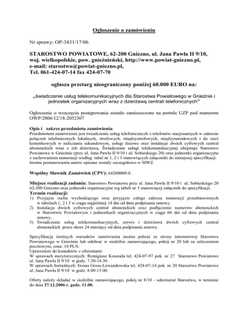 Ogłoszenie o zamówieniu Nr sprawy: OP-3431/17/06 STAROSTWO POWIATOWE, 62-200 Gniezno, ul. Jana Pawła II 9/10, woj. wielkopolskie, pow. gnieźnieński, http://www.powiat-gniezno.pl, e-mail: [email protected], Tel. 061-424-07-14 fax 424-07-70 ogłasza przetarg nieograniczony poniŜej 60.000 EURO na: „świadczenie usług telekomunikacyjnych dla Starostwa Powiatowego w Gnieźnie i jednostek organizacyjnych wraz z dzierŜawą centrali telefonicznych” Ogłoszenie o wszczęciu postępowania zostało zamieszczone na portalu UZP pod numerem OWP/2006/12/18-2052307 Opis i zakres przedmiotu zamówienia: Przedmiotem zamówienia jest świadczenie usług telefonicznych z telefonów stacjonarnych w zakresie połączeń telefonicznych lokalnych, strefowych, międzystrefowych, międzynarodowych i do sieci komórkowych w naliczaniu sekundowym, usługi faxowe oraz instalacje dwóch cyfrowych central abonenckich wraz z ich dzierŜawą. Świadczenie usługi telekomunikacyjnej obejmuje Starostwo Powiatowe w Gnieźnie (przy ul. Jana Pawła II 9/10 i ul. Sobieskiego 20) oraz jednostki organizacyjne z zachowaniem numeracji według tabel nr 1, 2 i 3 stanowiących załączniki do niniejszej specyfikacji. Istotne postanowienia umów opisane zostały szczegółowo w SIWZ. Wspólny Słownik Zamówień (CPV): 64200000-8. Miejsce realizacji zadania: Starostwo Powiatowe przy ul. Jana Pawła II 9/10 i ul. Sobieskiego 20 62-200 Gniezno oraz jednostki organizacyjne wg tabeli nr 3 stanowiącej załącznik do specyfikacji. Termin realizacji: 1) Przyjęcie ruchu wychodzącego oraz przyjęcie całego zakresu numeracji przedstawionych w tabelach 1, 2 i 3 w ciągu najpóźniej 14 dni od dnia podpisania umowy. 2) Instalacja dwóch cyfrowych central abonenckich oraz podłączenie numerów abonenckich w Starostwie Powiatowym i jednostkach organizacyjnych w ciągu 60 dni od dnia podpisania umowy. 3) Świadczenie usług telekomunikacyjnych, serwis i dzierŜawa dwóch cyfrowych central abonenckich przez okres 24 miesięcy od dnia podpisania umowy. Specyfikację istotnych warunków zamówienia moŜna pobrać ze strony internetowej Starostwa Powiatowego w Gnieźnie lub odebrać w siedzibie zamawiającego, pokój nr 20 lub za zaliczeniem pocztowym, cena: 10 PLN. Uprawnieni do kontaktów z oferentami: W sprawach merytorycznych: Remigiusz Kosmala tel. 424-07-97 pok. nr 27 Starostwo Powiatowe ul. Jana Pawła II 9/10 w godz. 7.30-14.30. W sprawach formalnych: Iwona Gross-Lewandowska tel. 424-07-14 pok. nr 20 Starostwo Powiatowe ul. Jana Pawła II 9/10 w godz. 8.00-15.00. Oferty naleŜy składać w siedzibie zamawiającego, pokój nr 8/10 - sekretariat Starostwa, w terminie do dnia 27.12.2006 r. godz. 11.00. Otwarcie ofert nastąpi dnia 27.12.2006 r. o godz. 12:00 w siedzibie zamawiającego przy ul. Jana Pawła II 9/10 pokój nr 7 - sala konferencyjna, I piętro. Nie dopuszcza się składania oferty wariantowej. Oferta winna obejmować całość zamówienia nie dopuszcza się składania ofert częściowych. Termin związania ofertą wynosi 30 dni od ostatecznego terminu składania ofert. Zamawiający przewiduje moŜliwość udzielenia zamówień uzupełniających, w wypadku wystąpienia konieczności dołączenia do grupy „bezpłatnych połączeń” dodatkowych końcowych linii abonenckich z zachowaniem warunków przedstawionych w ofercie. W postępowaniu nie przewiduje się zawarcia umowy ramowej, ustanowienia dynamicznego systemu zakupów, wyboru najkorzystniejszej oferty z zastosowaniem aukcji elektronicznej. W przetargu mogą wziąć udział wykonawcy nie wykluczeni na podstawie art. 22 ust. 1 oraz art. 24 ust.1 i 2 prawa zamówień publicznych i spełniający pozostałe warunki wymienione w SIWZ m.in zapewnić realizację zadania zgodnie ze SIWZ, zapewnić serwis, zrealizują 2 zadania odpowiadające swoim rodzajem i wartością przedmiotowi zamówienia potwierdzone wykonaniem ich z naleŜytą starannością. Ocena warunków udziału w postępowaniu odbywać się będzie na podstawie dokumentów przewidzianych w ustawie Prawo Zamówień Publicznych i Rozporządzeniu Prezesa Rady Ministrów z dnia 19 maja 2006r. w sprawie rodzaju dokumentów, jakich moŜe Ŝądać zamawiający od wykonawcy oraz form w jakich te dokumenty mogą być składane. Zamawiający wymaga wniesienia wadium w wysokości 4.000 zł, w terminie do dnia 27.12.2006 r. do godz. 11:00. Kryteria wyboru ofert i ich znaczenie: 1. cena za 1 abonament miesięczny – 25 % 2. cena za 1 min. połączeń lokalnych – 15 % 3. cena za 1 min. połączeń międzystrefowych – 10 % 4. cena za 1 min. połączeń międzynarodowych – 3 % 5. cena za 1 min. połączeń komórkowych – 7 % 6. cena za serwis – 10 % 7. cena za dzierŜawę central – 20 % 8. cena za instalację central (w tym dostarczenie 10 aparatów cyfrowych) – 10 %