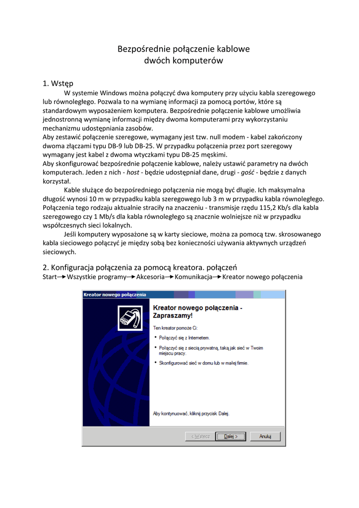 Bezpośrednie połączenie kablowe dwóch komputerów 1. Wstęp W systemie Windows można połączyć dwa komputery przy użyciu kabla szeregowego lub równoległego. Pozwala to na wymianę informacji za pomocą portów, które są standardowym wyposażeniem komputera. Bezpośrednie połączenie kablowe umożliwia jednostronną wymianę informacji między dwoma komputerami przy wykorzystaniu mechanizmu udostępniania zasobów. Aby zestawić połączenie szeregowe, wymagany jest tzw. null modem - kabel zakończony dwoma złączami typu DB-9 lub DB-25. W przypadku połączenia przez port szeregowy wymagany jest kabel z dwoma wtyczkami typu DB-25 męskimi. Aby skonfigurować bezpośrednie połączenie kablowe, należy ustawić parametry na dwóch komputerach. Jeden z nich - host - będzie udostępniał dane, drugi - gość - będzie z danych korzystał. Kable służące do bezpośredniego połączenia nie mogą być długie. Ich maksymalna długość wynosi 10 m w przypadku kabla szeregowego lub 3 m w przypadku kabla równoległego. Połączenia tego rodzaju aktualnie straciły na znaczeniu - transmisje rzędu 115,2 Kb/s dla kabla szeregowego czy 1 Mb/s dla kabla równoległego są znacznie wolniejsze niż w przypadku współczesnych sieci lokalnych. Jeśli komputery wyposażone są w karty sieciowe, można za pomocą tzw. skrosowanego kabla sieciowego połączyć je między sobą bez konieczności używania aktywnych urządzeń sieciowych. 2. Konfiguracja połączenia za pomocą kreatora. połączeń Start Wszystkie programy Akcesoria Komunikacja Kreator nowego połączenia Wybieramy połączenie zaawansowane Wybieramy opcję bezpośrednie połączenie przez port COM1, LPT1 lub IRDy Zaznaczamy opcję Host, a na drugim komputerze opcjęGość Wybieramy port odpowiadający temu do którego podłączony jest kabel. Zaznaczenie uprawnionego użytkownika do łączenia się z tym komputerem Zakończenie konfiguracji za pomocą kreatora