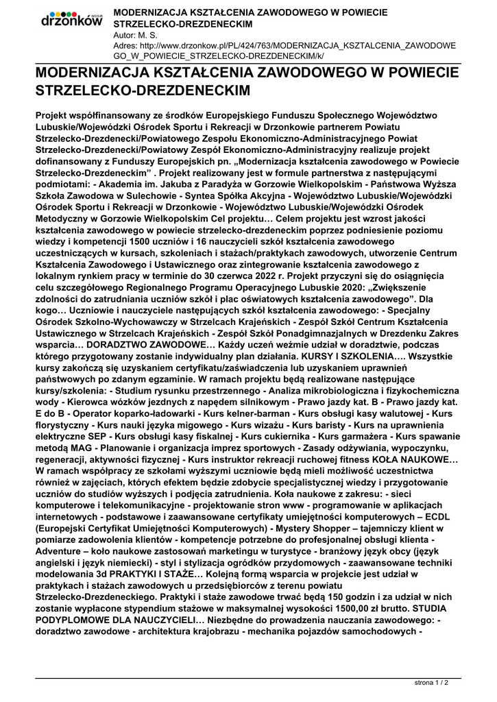 MODERNIZACJA KSZTAŁCENIA ZAWODOWEGO W POWIECIE STRZELECKO-DREZDENECKIM Autor: M. S. Adres: http://www.drzonkow.pl/PL/424/763/MODERNIZACJA_KSZTALCENIA_ZAWODOWE GO_W_POWIECIE_STRZELECKO-DREZDENECKIM/k/ MODERNIZACJA KSZTAŁCENIA ZAWODOWEGO W POWIECIE STRZELECKO-DREZDENECKIM Projekt współfinansowany ze środków Europejskiego Funduszu Społecznego Województwo Lubuskie/Wojewódzki Ośrodek Sportu i Rekreacji w Drzonkowie partnerem Powiatu Strzelecko-Drezdenecki/Powiatowego Zespołu Ekonomiczno-Administracyjnego Powiat Strzelecko-Drezdenecki/Powiatowy Zespół Ekonomiczno-Administracyjny realizuje projekt dofinansowany z Funduszy Europejskich pn. „Modernizacja kształcenia zawodowego w Powiecie Strzelecko-Drezdeneckim” . Projekt realizowany jest w formule partnerstwa z następującymi podmiotami: - Akademia im. Jakuba z Paradyża w Gorzowie Wielkopolskim - Państwowa Wyższa Szkoła Zawodowa w Sulechowie - Syntea Spółka Akcyjna - Województwo Lubuskie/Wojewódzki Ośrodek Sportu i Rekreacji w Drzonkowie - Województwo Lubuskie/Wojewódzki Ośrodek Metodyczny w Gorzowie Wielkopolskim Cel projektu… Celem projektu jest wzrost jakości kształcenia zawodowego w powiecie strzelecko-drezdeneckim poprzez podniesienie poziomu wiedzy i kompetencji 1500 uczniów i 16 nauczycieli szkół kształcenia zawodowego uczestniczących w kursach, szkoleniach i stażach/praktykach zawodowych, utworzenie Centrum Kształcenia Zawodowego i Ustawicznego oraz zintegrowanie kształcenia zawodowego z lokalnym rynkiem pracy w terminie do 30 czerwca 2022 r. Projekt przyczyni się do osiągnięcia celu szczegółowego Regionalnego Programu Operacyjnego Lubuskie 2020: „Zwiększenie zdolności do zatrudniania uczniów szkół i plac oświatowych kształcenia zawodowego”. Dla kogo… Uczniowie i nauczyciele następujących szkół kształcenia zawodowego: - Specjalny Ośrodek Szkolno-Wychowawczy w Strzelcach Krajeńskich - Zespół Szkół Centrum Kształcenia Ustawicznego w Strzelcach Krajeńskich - Zespół Szkół Ponadgimnazjalnych w Drezdenku Zakres wsparcia… DORADZTWO ZAWODOWE… Każdy uczeń weźmie udział w doradztwie, podczas którego przygotowany zostanie indywidualny plan działania. KURSY I SZKOLENIA…. Wszystkie kursy zakończą się uzyskaniem certyfikatu/zaświadczenia lub uzyskaniem uprawnień państwowych po zdanym egzaminie. W ramach projektu będą realizowane następujące kursy/szkolenia: - Studium rysunku przestrzennego - Analiza mikrobiologiczna i fizykochemiczna wody - Kierowca wózków jezdnych z napędem silnikowym - Prawo jazdy kat. B - Prawo jazdy kat. E do B - Operator koparko-ładowarki - Kurs kelner-barman - Kurs obsługi kasy walutowej - Kurs florystyczny - Kurs nauki języka migowego - Kurs wizażu - Kurs baristy - Kurs na uprawnienia elektryczne SEP - Kurs obsługi kasy fiskalnej - Kurs cukiernika - Kurs garmażera - Kurs spawanie metodą MAG - Planowanie i organizacja imprez sportowych - Zasady odżywiania, wypoczynku, regeneracji, aktywności fizycznej - Kurs instruktor rekreacji ruchowej fitness KOŁA NAUKOWE… W ramach współpracy ze szkołami wyższymi uczniowie będą mieli możliwość uczestnictwa również w zajęciach, których efektem będzie zdobycie specjalistycznej wiedzy i przygotowanie uczniów do studiów wyższych i podjęcia zatrudnienia. Koła naukowe z zakresu: - sieci komputerowe i telekomunikacyjne - projektowanie stron www - programowanie w aplikacjach internetowych - podstawowe i zaawansowane certyfikaty umiejętności komputerowych – ECDL (Europejski Certyfikat Umiejętności Komputerowych) - Mystery Shopper – tajemniczy klient w pomiarze zadowolenia klientów - kompetencje potrzebne do profesjonalnej obsługi klienta Adventure – koło naukowe zastosowań marketingu w turystyce - branżowy język obcy (język angielski i język niemiecki) - styl i stylizacja ogródków przydomowych - zaawansowane techniki modelowania 3d PRAKTYKI I STAŻE… Kolejną formą wsparcia w projekcie jest udział w praktykach i stażach zawodowych u przedsiębiorców z terenu powiatu Strzelecko-Drezdeneckiego. Praktyki i staże zawodowe trwać będą 150 godzin i za udział w nich zostanie wypłacone stypendium stażowe w maksymalnej wysokości 1500,00 zł brutto. STUDIA PODYPLOMOWE DLA NAUCZYCIELI… Niezbędne do prowadzenia nauczania zawodowego: doradztwo zawodowe - architektura krajobrazu - mechanika pojazdów samochodowych - strona 1 / 2 MODERNIZACJA KSZTAŁCENIA ZAWODOWEGO W POWIECIE STRZELECKO-DREZDENECKIM Autor: M. S. Adres: http://www.drzonkow.pl/PL/424/763/MODERNIZACJA_KSZTALCENIA_ZAWODOWE GO_W_POWIECIE_STRZELECKO-DREZDENECKIM/k/ logistyka KURSY I SZKOLENIA DLA NAUCZYCIELI… Kursy i szkolenia zawodowe z zakresu: kurs diagnosty pojazdów samochodowych - kurs florystyki - kurs kelner – barman - kurs menedżer hotelarstwa - kurs marketingu internetowego - kurs baristy - kurs sommeliera - kurs concierge - kurs carvingu - kurs w zakresie obsługi oprogramowania Subiekt - kurs programowania obrabiarek sterowanych numerycznie - kurs egzaminatora OKE PRAKTYKI I STAŻE DLA NAUCZYCIELI… Nauczyciele biorąc udział w praktykach i stażach zawodowych będą mieli możliwość poszerzyć zakres swoich praktycznych umiejętności oraz poznają oczekiwania pracodawców wobec potencjalnych pracowników – absolwentów szkół kształcenia zawodowego. MODERNIZACJA KSZTAŁCENIA ZAWODOWEGO… W ramach projektu zostaną doposażone warsztaty i pracownie kształcenia zawodowego w Specjalnym Ośrodku Szkolno-Wychowawczym, w Zespole Szkół Centrum Kształcenia Ustawicznego w Strzelcach Kraj. oraz w Zespole Szkół Ponadgimnazjalnych w Drezdenku. CENTRUM KSZTAŁCENIA ZAWODOWEGO I USTAWICZNEGO…. Zespół Szkół Centrum Kształcenia Ustawicznego w Strzelcach Krajeńskich zostanie przekształcony w Centrum Kształcenia Zawodowego i Ustawicznego w Strzelcach Krajeńskich. Oferta kształcenia szkoły zostanie poszerzona o kształcenie zawodowe osób dorosłych. Oferta Ce