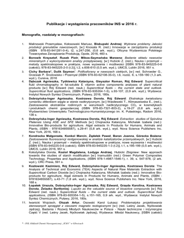 Publikacje i wystąpienia pracowników INS w 2016 r. Monografie, rozdziały w monografiach: Malinowski Przemysław, Kołosowski Mariusz, Biskupski Andrzej: Wybrane problemy Jakości produkcji granulatów nawozowych, [w:] Knosala R. (red.) Innowacje w zarządzaniu produkcji (ISBN 978-83-941281-0-4), t2, s.247-256, (0,6 ark. wyd.), Oficyna Wydawnicza Polskiego Towarzystwa Zarządzania Produkcją, Opole, 2016, 460 s. 2. Borowik Krzysztof, Rusek Piotr, Mikos-Szymańska Marzena: Badanie składu nawozów mineralnych z wykorzystaniem analizy przepływowej, [w:] Hubicki Z. (red.), Nauka i przemysł – metody spektroskopowe w praktyce, nowe wyzwania i możliwości [ISBN 978-83-945225-0-6 (całość); 978-83-945225-2-0 (t.2)], t.2, s.606-610 (0,5 ark. wyd.), UMCS, Lublin 2016, 951 s. * 3. Cichy Barbara*, Dulik Szymon : Polifosforany w nawozach ciekłych, [w:] red. Schroeder G., Grzesiak P. Środowisko i Przemysł (ISBN 978-83-62108-35-0), t.6, rozdz. 6, s.159-180 (1,3 ark. wyd.), Cursiva, 2016 4. Dębczak Agnieszka, Tyśkiewicz Katarzyna, Gieysztor Roman, Rój Edward: Supercritical fluid chromatography in fat-soluble E vitamin active components analyses of plant natural products [w:] Rój Edward (red. nauk.) Supercritical fluids – the current state and outlook. Supercritical fluid applications, (ISBN 978-83-935354-1-5), s.93-107, (0,9 ark. wyd.), Wydawca: Instytut Nowych Syntez Chemicznych, Puławy, 2016, 180s. 5. Dobrzyńska-Inger Agnieszka, Kostrzewa Dorota, Rój Edward: Ekstrakcja kwiatostanu rumianku ditlenkiem węgla w stanie nadkrytycznym, [w:] Wasilewski T., Klimaszewska E., (red.), Zastosowanie ekstraktów roślinnych w warunkach nadkrytycznego CO2 w kosmetykach i produktach chemii gospodarczej (ISBN 978-83-7321-803-2), s.19-27 (0,6 ark. wyd.), Wydawnictwo Uniwersytetu Technologiczno-Humanistycznego im. K. Pułaskiego, Radom 2016, 136 s. 6. Dobrzyńska-Inger Agnieszka, Kostrzewa Dorota, Rój Edward: Extraction studies of Spirulina Platensis Using ASE and SFE Methods [w:] Chojnacka Katarzyna, Michalak Izabela (red.): Innovative Bio-products for agriculture. Algal extracts In Products for Humans, Animals and Plants, (ISBN - 9781634855587), s.29-41 (0,8 ark. wyd.), wyd. Nova Science Publishers Inc. New York, 2016, 168 s. 7. Kondracka Małgorzata, Konkol Marcin, Żądełek Paweł, Baran Joanna, Górecka Bożena: Zastosowanie fluorescencji rentgenowskiej w analizie katalizatorów przemysłowych, [w:] Hubicki Z. (red.), Nauka i przemysł – metody spektroskopowe w praktyce, nowe wyzwania i możliwości [ISBN 978-83-945225-0-6 (całość); ISBN 978-83-945225-1-3 (t.2)], t.1, s.195-199 (0,5 ark. wyd.), UMCS, Lublin 2016, 951 s. 8. Kołodyńska Dorota, Kozioł Magdalena, Łodyga Andrzej, Hubicki Zbigniew: New approach towards the studies of starch modification [w:] Inamuddin (red.) Green Polymer Composites Technology. Properties and Applications, (ISBN 978-1-4987-1546-1), r. 39, s. 547-578, (2 ark. wyd.), CRC Press, 591 s. 9. Kozłowski Kazimierz, Rój Edward, Dobrzyńska-Inger Agnieszka, Kostrzewa Dorota: The Analysis of Technical and Economic (TEA) Aspects of Natural Raw Materials Extraction with Supercritical Carbon Dioxide [w:] Chojnacka Katarzyna, Michalak Izabela (red.): Innovative Bioproducts for agriculture. Algal extracts In Products for Humans, Animals and Plants, (ISBN 9781634855587), s.43-71 (1,8 ark. wyd.), wyd. Nova Science Publishers Inc. New York, 2016, 168 s. 10. Łopatek Urszula, Dobrzyńska-Inger Agnieszka, Rój Edward, Grzęda Karolina, Kostrzewa Dorota, Żelazko Bartłomiej: Lupulin as the valuable source of bioactive compounds [w:] Rój Edward (red. nauk.) Supercritical fluids – the current state and outlook. Supercritical fluid applications, (ISBN 978-83-935354-1-5), s.151-165, 0,9 ark. wyd., Wydawca: Instytut Nowych Syntez Chemicznych, Puławy, 2016, 180s. 11. Iwanicki Wojciech, Olszak Artur, Osowski Karol Łukasz: Problematyka projektowania sterowanych sprzęgieł z cieczami magneto reologicznymi [w:] (red. Leśny Jacek, Nyćkowiak Jędrzej), Badania i Rozwój Młodych Naukowców w Polsce - Nauki techniczne i inżynieryjne Część V (red. Leśny Jacek, Nyćkowiak Jędrzej), Wydawca: Młodzi Naukowcy, [ISBN (całość) 1. * - INS, Oddział Chemii Nieorganicznej „IChN” w Gliwicach 12. 13. 14. 15. 16. 17. 18. 19. 20. 978-83-65362-13-1, ISBN (wydanie online) 978-83-65362-74-2, ISBN (wydanie drukowane) 97883-65677-03-7], s.21-27 (0,5 ark. wyd.), Poznań 2016, 110 s. Miłkowska Edyta, Migus Marcin, Olszak Artur: Zastosowanie materiałów inteligentnych w nowoczesnych konstrukcjach mechanicznych [w:] (red. Leśny Jacek, Nyćkowiak Jędrzej) Badania i Rozwój Młodych Naukowców w Polsce – Nauki techniczne i inżynieryjne Część VII, s.49-57 (0,7 ark. wyd.), ISBN (całość) 978-83-65362-13-1, ISBN (wydanie online) 978-83-6536275-9, ISBN (wydanie drukowane) 978-83-65677-04-4, Poznań 2016, 100 s. Piątek Kamila, Kozioł Magdalena, Ostrowska Justyna, Bogusz Jakub, Tyński Piotr, Sadurski Waldemar: Spektroskopia IR jako narzędzie do oceny wpływu temperatury i wilgotności na zmiany w strukturze chemicznej granulatów biopolimerowych, [w:] Hubicki Z. (red.), Nauka i przemysł – metody spektroskopowe w praktyce, nowe wyzwania i możliwości [ISBN 978-83-945225-0-6 (całość); 978-83-945225-2-0 (t.2)], t.2, s.525-529, (0,5 ark. wyd.), UMCS, Lublin 2016, 951 s. Rój Edward (red. nauk.) Supercritical fluids – the current state and outlook. Supercritical fluid applications, (ISBN 978-83-935354-1-5), Wydawca: Instytut Nowych Syntez Chemicznych, Puławy, 2016, 180s. Rój Edward, Dobrzyńska-Inger Agnieszka, Kostrzewa Dorota: Ekstrakcja nadkrytyczna chmielu z dwustopniową separacją produktu, [w:] Ekokosmetyki (ISBN 978-83-7242-878-3), s.716 (ok. 0,6 ark. wyd.), Wydawnictwo Politechniki Krakowskiej, Kraków, 2016, 134 s. Rój Edward, Dobrzyńska-Inger Agnieszka, Kostrzewa Dorota: Optymalizacja czasu ekstrakcji chmielu w nadkrytycznym CO2, [w:] Wasilewski T., Klimaszewsk