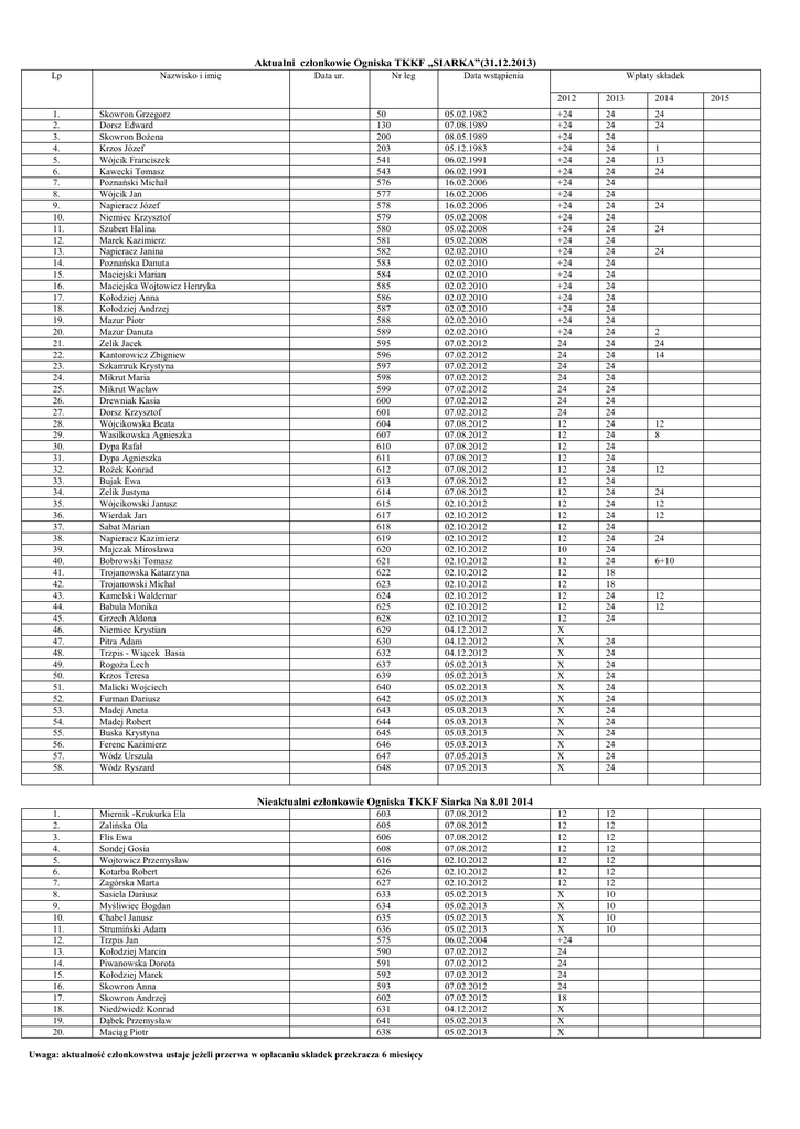 Aktualni członkowie Ogniska TKKF „SIARKA”(31.12.2013) Lp Nazwisko i imię 1. 2. 3. 4. 5. 6. 7. 8. 9. 10. 11. 12. 13. 14. 15. 16. 17. 18. 19. 20. 21. 22. 23. 24. 25. 26. 27. 28. 29. 30. 31. 32. 33. 34. 35. 36. 37. 38. 39. 40. 41. 42. 43. 44. 45. 46. 47. 48. 49. 50. 51. 52. 53. 54. 55. 56. 57. 58. Skowron Grzegorz Dorsz Edward Skowron Bożena Krzos Józef Wójcik Franciszek Kawecki Tomasz Poznański Michał Wójcik Jan Napieracz Józef Niemiec Krzysztof Szubert Halina Marek Kazimierz Napieracz Janina Poznańska Danuta Maciejski Marian Maciejska Wojtowicz Henryka Kołodziej Anna Kołodziej Andrzej Mazur Piotr Mazur Danuta Zelik Jacek Kantorowicz Zbigniew Szkamruk Krystyna Mikrut Maria Mikrut Wacław Drewniak Kasia Dorsz Krzysztof Wójcikowska Beata Wasilkowska Agnieszka Dypa Rafał Dypa Agnieszka Rożek Konrad Bujak Ewa Zelik Justyna Wójcikowski Janusz Wierdak Jan Sabat Marian Napieracz Kazimierz Majczak Mirosława Bobrowski Tomasz Trojanowska Katarzyna Trojanowski Michał Kamelski Waldemar Babula Monika Grzech Aldona Niemiec Krystian Pitra Adam Trzpis - Wiącek Basia Rogoża Lech Krzos Teresa Malicki Wojciech Furman Dariusz Madej Aneta Madej Robert Buska Krystyna Ferenc Kazimierz Wódz Urszula Wódz Ryszard 1. 2. 3. 4. 5. 6. 7. 8. 9. 10. 11. 12. 13. 14. 15. 16. 17. 18. 19. 20. Miernik -Krukurka Ela Zalińska Ola Flis Ewa Sondej Gosia Wojtowicz Przemysław Kotarba Robert Zagórska Marta Sasiela Dariusz Myśliwiec Bogdan Chabel Janusz Strumiński Adam Trzpis Jan Kołodziej Marcin Piwanowska Dorota Kołodziej Marek Skowron Anna Skowron Andrzej Niedźwiedź Konrad Dąbek Przemysław Maciąg Piotr Data ur. Nr leg 50 130 200 203 541 543 576 577 578 579 580 581 582 583 584 585 586 587 588 589 595 596 597 598 599 600 601 604 607 610 611 612 613 614 615 617 618 619 620 621 622 623 624 625 628 629 630 632 637 639 640 642 643 644 645 646 647 648 Data wstąpienia 05.02.1982 07.08.1989 08.05.1989 05.12.1983 06.02.1991 06.02.1991 16.02.2006 16.02.2006 16.02.2006 05.02.2008 05.02.2008 05.02.2008 02.02.2010 02.02.2010 02.02.2010 02.02.2010 02.02.2010 02.02.2010 02.02.2010 02.02.2010 07.02.2012 07.02.2012 07.02.2012 07.02.2012 07.02.2012 07.02.2012 07.02.2012 07.08.2012 07.08.2012 07.08.2012 07.08.2012 07.08.2012 07.08.2012 07.08.2012 02.10.2012 02.10.2012 02.10.2012 02.10.2012 02.10.2012 02.10.2012 02.10.2012 02.10.2012 02.10.2012 02.10.2012 02.10.2012 04.12.2012 04.12.2012 04.12.2012 05.02.2013 05.02.2013 05.02.2013 05.02.2013 05.03.2013 05.03.2013 05.03.2013 05.03.2013 07.05.2013 07.05.2013 Wpłaty składek 2012 2013 2014 +24 +24 +24 +24 +24 +24 +24 +24 +24 +24 +24 +24 +24 +24 +24 +24 +24 +24 +24 +24 24 24 24 24 24 24 24 12 12 12 12 12 12 12 12 12 12 12 10 12 12 12 12 12 12 X X X X X X X X X X X X X 24 24 24 24 24 24 24 24 24 24 24 24 24 24 24 24 24 24 24 24 24 24 24 24 24 24 24 24 24 24 24 24 24 24 24 24 24 24 24 24 18 18 24 24 24 24 24 12 12 12 12 12 12 12 X X X X +24 24 24 24 24 18 X X X 12 12 12 12 12 12 12 10 10 10 10 24 24 24 24 24 24 24 24 24 24 24 24 Nieaktualni członkowie Ogniska TKKF Siarka Na 8.01 2014 603 605 606 608 616 626 627 633 634 635 636 575 590 591 592 593 602 631 641 638 Uwaga: aktualność członkowstwa ustaje jeżeli przerwa w opłacaniu składek przekracza 6 miesięcy 07.08.2012 07.08.2012 07.08.2012 07.08.2012 02.10.2012 02.10.2012 02.10.2012 05.02.2013 05.02.2013 05.02.2013 05.02.2013 06.02.2004 07.02.2012 07.02.2012 07.02.2012 07.02.2012 07.02.2012 04.12.2012 05.02.2013 05.02.2013 1 13 24 24 24 24 2 24 14 12 8 12 24 12 12 24 6+10 12 12 2015