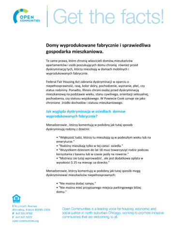Domy wyprodukowane fabrycznie i sprawiedliwa gospodarka mieszkaniowa. Te same prawa, które chronią wlascicieli domów,mieszkańców apartamentów i osób poszukujących domu chronią również przed dyskryminacją tych, którzy mieszkają w domach mobilnych i wyprodukowanych fabrycznie. Federal Fair Housing Act zabrania dyskryminacji w oparciu o niepełnosprawność, rasę, kolor skóry, pochodzenie, wyznanie, płeć, czy status rodzinny. Ponadto, Illinois chroni osoby przed dyskryminacją mieszkaniową na podstawie wieku, stanu cywilnego, orientacji seksualnej, pochodzenia, czy statusu wojskowego .W Powiecie Cook uznaje sie jako chronione źródło dochodów i statusu mieszkaniowego. Jak wygląda dyskryminacja w osiedlach domow wyprodukowanych fabrycznie? Menadzerowie , którzy komentują w podobny jak tutaj sposob dyskryminują rodziny z dziećmi: • "Większość ludzi, którzy tu mieszkają są w podeszłym wieku lub na emeryturze." • "Rodziny mieszkają tylko w tej czesci osiedla." • "Wszystkiem dzieciom do lat 18 musi towarzyszyć rodzic podczas korzystania z basenu lub w czasie jazdy na rowerze." • "Możnesz sie tutaj wprowadzić , ale jest dodatkowa opłata w wysokości $ 25 na miesiąc za dziecko." Menadzerowie, którzy komentują w podobny jak tutaj sposób mogą dyskryminować mieszkańców niepełnosprawnych: • "Nie można dodać rampy." • "Nie można mieć przypisanego miejsca parkingowego bliżej domu." • "Nie zezwalamy na psy przewodniki i zwierzeta usługowe." Jeśli można ustalić za pomocą dowodów medycznych, że zwierzę jest wymagane ze względów zdrowotnych, masz prawo do utrzymania zwierzęcia nawet we wspólnocie z przepisem „zakaz zwierząt”.. • "Musisz zapłacić dodatkowy czynsz, ponieważ potrzebujesz osoby asystującej mieszkającej z tobą." • "Musisz wykupić ubezpieczenie od odpowiedzialności cywilnej, lub uiścić dodatkową kaucję, ponieważ korzystasz z wózka inwalidzkiego lub skutera.". Menadzerowie , którzy komentuja w podobny jak zalaczony tutaj sposob mogą dyskryminowac na podstawie pochodzenia i narodowości: • "Jaki jest twój status imigracyjny?" Jeśli menedżer ,lub właściciel osiedla wybiera zapytać o twój status imigracyjny, musi on traktować wszystkich wynajmujących w ten sam sposób i poprosić wszystkie osoby ubiegające się o dowód obywatelstwa lub statusu imigracyjnego. • "Jeśli będziesz ponownie narzekać , mam zamiar zgłosić cię do urzedu imigracyjnego." Co mogę zrobić, jeśli byłem dyskryminowany? Skontaktuj sie z Open Communities na telefon 847-501-5760, jeśli uważasz, że jesteś ofiarą dyskryminacji mieszkaniowej. Usługa ta jest bezpłatna i poufna. Stworzony przez Open Sztab Open Communities 11/12. Prace, które stały się podstawą tej publikacji zostały wsparte w części z grantu Departamentu Mieszkalnictwa i Rozwoju Miast.Treść i ustalenia pracy podane są do publicznej wiadomości. Autor i wydawca jest wyłącznie odpowiedzialny za prawidłowość oświadczeń i interpretacji zawartych w niniejszej publikacji. Takie interpretacje nie muszą odzwierciedlać poglądów rządu federalnego. Niniejsza broszura nie jest przeznaczona do zastąpienia porady adwokata. What can I do if I have been discriminated against? If you believe you are the victim of housing discrimination, or would simply like to gain a better understanding of your fair housing rights and responsibilities, contact Open Communities at (847) 501-5760 or email [email protected]. This service is free and confidential. The work that provided the basis for this publication was supported in part by a grant from the U. S. Department of Housing and Urban Development. The substance and findings of the work are dedicated to the public. The author and publisher are solely responsible for the accuracy of the statements and interpretations contained in this publication. Such interpretations do not necessarily reflect the views of the Federal Government. This pamphlet is not intended to replace the advice of an attorney. (December 2012 – Mobile Homes – Polish)