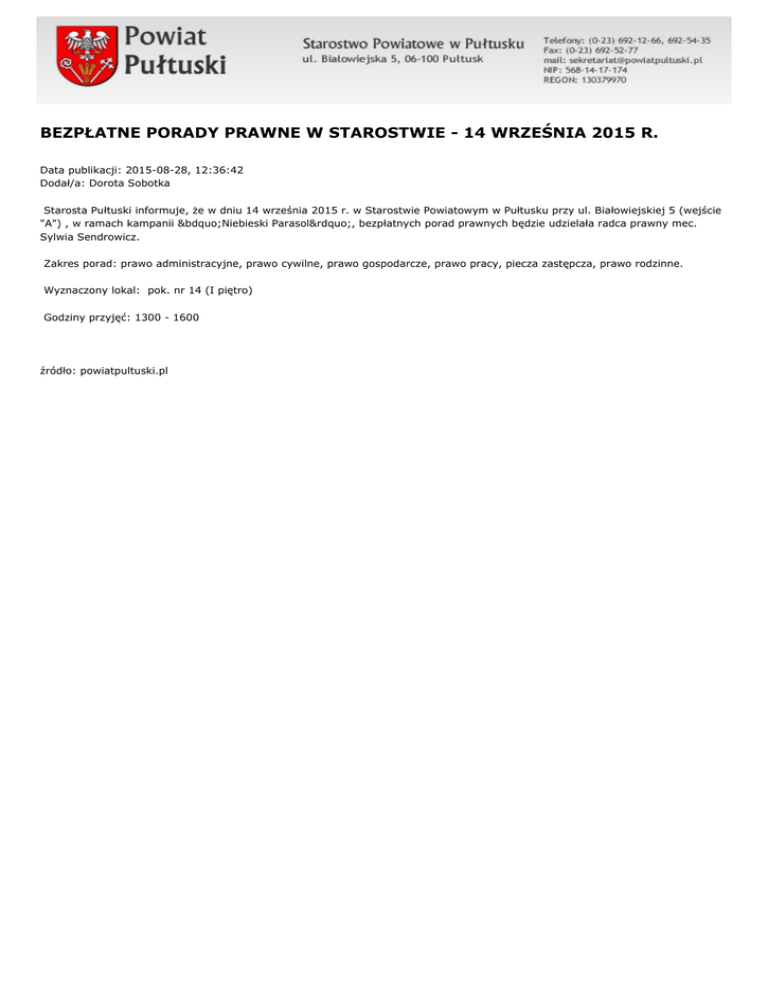 BEZPŁATNE PORADY PRAWNE W STAROSTWIE - 14 WRZEŚNIA 2015 R. Data publikacji: 2015-08-28, 12:36:42 Dodał/a: Dorota Sobotka Starosta Pułtuski informuje, że w dniu 14 września 2015 r. w Starostwie Powiatowym w Pułtusku przy ul. Białowiejskiej 5 (wejście "A") , w ramach kampanii „Niebieski Parasol”, bezpłatnych porad prawnych będzie udzielała radca prawny mec. Sylwia Sendrowicz. Zakres porad: prawo administracyjne, prawo cywilne, prawo gospodarcze, prawo pracy, piecza zastępcza, prawo rodzinne. Wyznaczony lokal: pok. nr 14 (I piętro) Godziny przyjęć: 1300 - 1600 źródło: powiatpultuski.pl