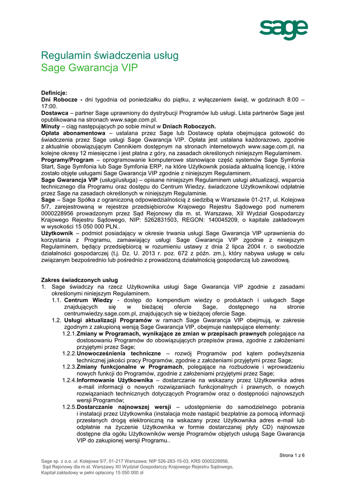 Regulamin świadczenia usług Sage Gwarancja VIP Definicje: Dni Robocze - dni tygodnia od poniedziałku do piątku, z wyłączeniem świąt, w godzinach 8:00 – 17:00. Dostawca – partner Sage uprawniony do dystrybucji Programów lub usługi. Lista partnerów Sage jest opublikowana na stronach www.sage.com.pl. Minuty – ciąg następujących po sobie minut w Dniach Roboczych. Opłata abonamentowa – ustalana przez Sage lub Dostawcę opłata obejmująca gotowość do świadczenia przez Sage usługi Sage Gwarancja VIP. Opłata jest ustalana każdorazowo, zgodnie z aktualnie obowiązującym Cennikiem dostępnym na stronach internetowych www.sage.com.pl, na kolejne okresy 12 miesięczne i jest płatna z góry, na zasadach określonych niniejszym Regulaminem. Programy/Program – oprogramowanie komputerowe stanowiące część systemów Sage Symfonia Start, Sage Symfonia lub Sage Symfonia ERP, na które Użytkownik posiada aktualną licencję, i które zostało objęte usługami Sage Gwarancja VIP zgodnie z niniejszym Regulaminem. Sage Gwarancja VIP (usługi/usługa) – opisane niniejszym Regulaminem usługi aktualizacji, wsparcia technicznego dla Programu oraz dostępu do Centrum Wiedzy, świadczone Użytkownikowi odpłatnie przez Sage na zasadach określonych w niniejszym Regulaminie. Sage – Sage Spółka z ograniczoną odpowiedzialnością z siedzibą w Warszawie 01-217, ul. Kolejowa 5/7, zarejestrowaną w rejestrze przedsiębiorców Krajowego Rejestru Sądowego pod numerem 0000228956 prowadzonym przez Sąd Rejonowy dla m. st. Warszawa, XII Wydział Gospodarczy Krajowego Rejestru Sądowego, NIP: 5262831503, REGON: 140045209, o kapitale zakładowym w wysokości 15 050 000 PLN.. Użytkownik – podmiot posiadający w okresie trwania usługi Sage Gwarancja VIP uprawnienia do korzystania z Programu, zamawiający usługi Sage Gwarancja VIP zgodnie z niniejszym Regulaminem, będący przedsiębiorcą w rozumieniu ustawy z dnia 2 lipca 2004 r. o swobodzie działalności gospodarczej (t.j. Dz. U. 2013 r. poz. 672 z późn. zm.), który nabywa usługę w celu związanym bezpośrednio lub pośrednio z prowadzoną działalnością gospodarczą lub zawodową. Zakres świadczonych usług 1. Sage świadczy na rzecz Użytkownika usługi Sage Gwarancja VIP zgodnie z zasadami określonymi niniejszym Regulaminem. 1.1. Centrum Wiedzy - dostęp do kompendium wiedzy o produktach i usługach Sage znajdujących się w bieżącej ofercie Sage, dostępnego na stronie centrumwiedzy.sage.com.pl, znajdujących się w bieżącej ofercie Sage. 1.2. Usługi aktualizacji Programów w ramach Sage Gwarancja VIP obejmują, w zakresie zgodnym z zakupioną wersją Sage Gwarancja VIP, obejmuje następujące elementy: 1.2.1.Zmiany w Programach, wynikające ze zmian w przepisach prawnych polegające na dostosowaniu Programów do obowiązujących przepisów prawa, zgodnie z założeniami przyjętymi przez Sage; 1.2.2.Unowocześnienia techniczne – rozwój Programów pod kątem podwyższenia technicznej jakości pracy Programów, zgodnie z założeniami przyjętymi przez Sage; 1.2.3.Zmiany funkcjonalne w Programach, polegające na rozbudowie i wprowadzeniu nowych funkcji do Programów, zgodnie z założeniami przyjętymi przez Sage; 1.2.4.Informowanie Użytkownika – dostarczanie na wskazany przez Użytkownika adres e-mail informacji o nowych rozwiązaniach funkcjonalnych i prawnych, o nowych rozwiązaniach technicznych dotyczących Programów oraz o dostępności najnowszych wersji Programów; 1.2.5.Dostarczanie najnowszej wersji – udostępnienie do samodzielnego pobrania i instalacji przez Użytkownika (instalacja może nastąpić bezpłatnie za pomocą informacji przesłanych drogą elektroniczną na wskazany przez Użytkownika adres e-mail lub odpłatnie na życzenie Użytkownika w formie dostarczanej płyty CD) najnowsze dostępne dla ogółu Użytkowników wersje Programów objętych usługą Sage Gwarancja VIP do zakupionej wersji Programu.. Strona 1 z 6 Sage sp. z o.o. ul. Kolejowa 5/7, 01-217 Warszawa; NIP 526-283-15-03, KRS 0000228956, Sąd Rejonowy dla m.st. Warszawy XII Wydział Gospodarczy Krajowego Rejestru Sądowego, Kapitał zakładowy w pełni opłacony 15 050 000 zł 2. 3. 4. 5. 1.3. Usługi wsparcia technicznego dla Programów w ramach Sage Gwarancja VIP obejmują następujące elementy: 1.3.1.Udzielanie Użytkownikowi konsultacji w procesie instalacji Programów w środowisku Użytkownika, 1.3.2.Udzielanie Użytkownikowi konsultacji, związanych z korzystaniem z Programów zgodnie z zasadami ustalanymi przez Sage, 1.3.3.Usługę oddzwonienia na życzenie, 1.3.4.Usługę konsultacji zdalnych. 1.4. Usługi oddzwonienia na życzenie w ramach Usług wsparcia technicznego obejmują skorzystanie z usługi oddzwonienia w przypadku, gdy Użytkownik w automatycznym systemie obsługi zgłosi takie życzenie. 1.5. Usługi konsultacji zdalnych w ramach Usług wsparcia technicznego obejmują świadczenie konsultacji z wykorzystaniem przekazanego przez Użytkownika konsultantowi Sage dostępu do pulpitu komputera udostępnionego przez Użytkownika, za pośrednictwem łączy internetowych wraz z jednoczesnym połączeniem telefonicznym z Użytkownikiem. Usługa świadczona jest w postaci jednej, w danym miesięcznym okresie trwania umowy, sesji konsultacyjnej dla jednego wskazanego przez Użytkownika Programu, trwającej do 30 minut, przez okres trwania umowy. W razie przekroczenia powyższego limitu, istnieje możliwość zakupienia dalszych konsultacji zdalnych. W razie przekroczenia limitu 30 minut podczas konsultacji zdalnych, Użytkownik zostanie poinformowany o tym fakcie i od tej chwili, w razie gdy nie przerwie on połączenia, dokona zamówienia usługi dodatkowej, a dalsze minuty naliczane będą według aktualnie obowiązującego Cennika dostępnego na stronach internetowych www.sage.com.pl. Niewykorzystane konsultacje w ramach przysługującego Użytkownikowi limitu miesięcznego nie przechodzą na kolej