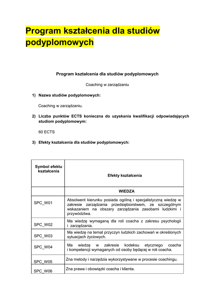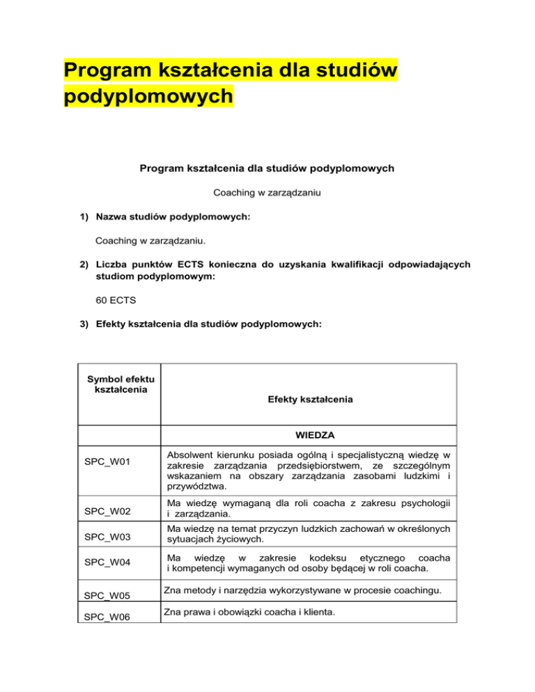 Program kształcenia dla studiów podyplomowych Program kształcenia dla studiów podyplomowych Coaching w zarządzaniu 1) Nazwa studiów podyplomowych: Coaching w zarządzaniu. 2) Liczba punktów ECTS konieczna do uzyskania kwalifikacji odpowiadających studiom podyplomowym: 60 ECTS 3) Efekty kształcenia dla studiów podyplomowych: Symbol efektu kształcenia Efekty kształcenia WIEDZA SPC_W01 Absolwent kierunku posiada ogólną i specjalistyczną wiedzę w zakresie zarządzania przedsiębiorstwem, ze szczególnym wskazaniem na obszary zarządzania zasobami ludzkimi i przywództwa. SPC_W02 Ma wiedzę wymaganą dla roli coacha z zakresu psychologii i zarządzania. SPC_W03 Ma wiedzę na temat przyczyn ludzkich zachowań w określonych sytuacjach życiowych. SPC_W04 Ma wiedzę w zakresie kodeksu etycznego coacha i kompetencji wymaganych od osoby będącej w roli coacha. SPC_W05 SPC_W06 Zna metody i narzędzia wykorzystywane w procesie coachingu. Zna prawa i obowiązki coacha i klienta. SPC_W07 Zna psychologiczne, społeczne i ekonomiczne podstawy funkcjonowania człowieka w organizacji. UMIEJĘTNOŚCI SPC_U01 SPC_U02 SPC_U03 SPC_U04 SPC_U05 SPC_U06 SPC_U07 Absolwent kierunku potrafi zastosować poznane koncepcje i metody zarządzania zasobami ludzkimi. Potrafi stosować efektywną komunikację podczas sesji coachingowej i podczas realizacji zadań menedżerskich. Jasno przedstawia cele coachingu, program spotkania, cele wykorzystywanych ćwiczeń Zadaje pytania świadczące o aktywnym słuchaniu i rozumieniu klienta. Potrafi budować atmosferę wzajemnego szacunku i zaufania w relacji z klientem. Pomaga klientowi skoncentrować się na określonych sprawach i możliwościach, które mają kluczowe znaczenie dla uzgodnienia osiągania stawianych celów. Potrafi wykorzystać zdobytą wiedzę w obszarze kompetencji coacha i narzędzi wykorzystywanych w coachingu do usprawnienia funkcji i zadań menedżerskich KOMPETENCJE SPOŁECZNE SPC_K01 SPC_K02 SPC_K03 SPC_K04 SPC_K05 Absolwent kierunku posiada rozwinięte umiejętności komunikacji interpersonalnej. Jest przygotowany do aktywnego uczestnictwa w grupach i organizacjach jako przedstawiciel grupy zawodowej coachów. Jest świadomy konieczności współpracy z innymi ludźmi dla osiągnięcia celów coachingowych w przedsiębiorstwach. Potrafi posługiwać się zdobytą wiedzą w pracy zawodowej przy zachowaniu zasad etycznych Ma świadomość poziomu swojej wiedzy i umiejętności i rozumie potrzebę ustawicznego jej aktualizowania. Sposób weryfikacji i dokumentacji efektów kształcenia: Studia Podyplomowe kończą się międzynarodowym egzaminem VCC. Uzyskanie pozytywnego wyniku egzaminu jest warunkiem zaliczenia studiów. 4) Sylwetka absolwenta Zakłada się, że absolwent studiów podyplomowych będzie posiadał wysokie kwalifikacje menedżerskie, poparte obszerną wiedzą i umiejętnościami z obszaru kompetencji coacha. Znajomość narzędzi i technik wykorzystywanych w coachingu zwiększy efektywność realizowanych przez niego zadań, zaangażowanie, współpracę w grupie i inne obszary istotne z perspektywy roli menedżera w przedsiębiorstwie. Absolwent studiów będzie również przygotowany do pełnienia roli coacha. Uzyskanie certyfikatu VCC potwierdza posiadanie kompetencji w tym zakresie. 5) Wykaz wszystkich przedmiotów wraz z przypisanymi do każdego przedmiotu zakładanymi efektami kształcenia i przykładową literaturą 1. Współczesne koncepcje zarządzania. (UAM) Po zakończeniu przedmiotu i potwierdzeniu osiągnięcia efektów kształcenia słuchacz potrafi: (podział efektów wg grup) wiedza a) ma wiedzę z zakresu współczesnych koncepcji zarządzania wywierających największy wpływ na standardy zachowań organizacyjnych – SPC_W01, SPC_W02, SPC_W03, SPC_W07 b) zna wzajemne powiązania występujące pomiędzy poszczególnymi koncepcjami i metodami zarządzania - SPC_W01, SPC_W02, SPC_W03, SPC_W07 umiejętności a) potrafi scharakteryzować możliwe sposoby zastosowania koncepcji w praktyce organizacji biznesowych oraz publicznych – SPC_U01, SPC_U02 kompetencje społeczne a) posiada kompetencje budowania spójnego systemu koncepcji i metod zarzadzania oraz ich komplementarnego wspomagania się - SPC_K03 Literatura 1. K. Perechuda, Zarządzanie przedsiębiorstwem przyszłości, Wydawnictwo Naukowe difin, Warszawa, wydanie bieżące. 2. Czerska, Rutka, Współczesne koncepcje zarządzania, PWN, wydanie bieżące. Sposób weryfikacji efektów kształcenia: zaliczenie pisemne z oceną – test. 2. Metody zarządzania zasobami ludzkimi. (UAM) Po zakończeniu przedmiotu i potwierdzeniu osiągnięcia efektów kształcenia słuchacz potrafi: (podział efektów wg grup) wiedza a) ma wiedzę na temat standardów zachowań organizacyjnych – SPC_W01, SPC_W02, SPC_W03, SPC_W07 b) zna wzajemne powiązania występujące pomiędzy poszczególnymi koncepcjami i metodami zarządzania oraz ZZL - SPC_W01, SPC_W02, SPC_W03, SPC_W07 umiejętności a) potrafi omówić sposoby zastosowania ZZL w praktyce organizacji biznesowych oraz publicznych - SPC_U01 b) potrafi wskazać zasady budowania spójnego systemu koncepcji i metod zarządzania oraz ich komplementarnego wspomagania się w aspekcie współczesnego ZZL SPC_U01 kompetencje społeczne a) posiada kompetencje w zakresie w zakresie organizacji i zarządzania zasobami ludzkimi w organizacji biznesowej i publicznej - SPC_K01 - 05 Literatura: 1.M. Armstrong,, Zarządzanie zasobami ludzkimi, Wydawnictwo Naukowe PWN, Warszawa, wydanie bieżące. 2.J. Lisztwan, zarządzanie zasobami ludzkimi we współczesnych organizacjach, PWN, Warszawa, wydanie bieżące. Sposób weryfikacji efektów kształcenia: zaliczenie pisemne z oceną – test. 3. Przywództwo. (UAM) Po zakończeniu przedmiotu i potwierdzeniu osiągnięcia efektów kształcenia słuchacz potrafi: (podział efektów wg grup) wiedza a) zna podstawowe założenia współczesnego ZZL - SPC_W01, SPC_W02, SPC_W03, SPC_W07 b) ma 