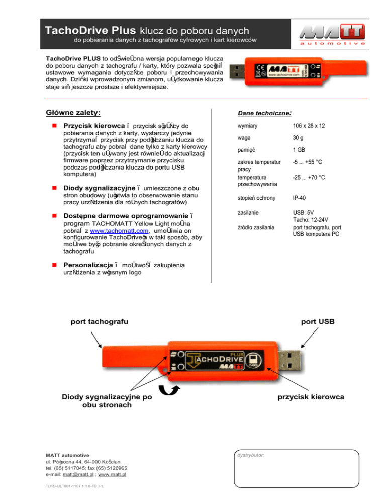 TachoDrive Plus klucz do poboru danych do pobierania danych z tachografów cyfrowych i kart kierowców TachoDrive PLUS to odświeżona wersja popularnego klucza do poboru danych z tachografu / karty, który pozwala spełnić ustawowe wymagania dotyczące poboru i przechowywania danych. Dzięki wprowadzonym zmianom, użytkowanie klucza staje się jeszcze prostsze i efektywniejsze. Główne zalety: n Przycisk kierowca – przycisk służący do pobierania danych z karty, wystarczy jedynie przytrzymać przycisk przy podłączaniu klucza do tachografu aby pobrać dane tylko z karty kierowcy (przycisk ten używany jest również do aktualizacji firmware poprzez przytrzymanie przycisku podczas podłączania klucza do portu USB komputera) n Diody sygnalizacyjne – umieszczone z obu stron obudowy (ułatwia to obserwowanie stanu pracy urządzenia dla różnych tachografów) n Dostępne darmowe oprogramowanie – program TACHOMATT Yellow Light można pobrać z www.tachomatt.com, umożliwia on konfigurowanie TachoDrive’a w taki sposób, aby możliwe było pobranie określonych danych z tachografu Dane techniczne: wymiary 106 x 28 x 12 waga 30 g pamięć 1 GB zakres temperatur pracy temperatura przechowywania -5 ... +55 °C stopień ochrony IP-40 zasilanie USB: 5V Tacho: 12-24V port tachografu, port USB komputera PC źródło zasilania -25 ... +70 °C n Personalizacja – możliwość zakupienia urządzenia z własnym logo port tachografu port USB Diody sygnalizacyjne po obu stronach MATT automotive ul. Północna 44, 64-000 Kościan tel. (65) 5117045; fax (65) 5126965 e-mail: [email protected] ; www.matt.pl TD1S-ULT001-1107.1.1.0-TD_PL przycisk kierowca dystrybutor: