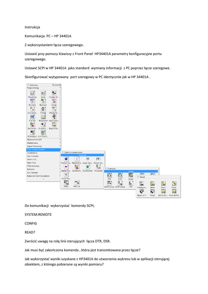 Instrukcja Komunikacja PC – HP 34401A Z wykorzystaniem łącza szeregowego. Ustawić przy pomocy klawiszy z Front Panel HP34401A parametry konfiguracyjne portu szeregowego. Ustawić SCPI w HP 34401A jako standard wymiany informacji z PC poprzez łącze szeregowe. Skonfigurować wytypowany port szeregowy w PC identycznie jak w HP 34401A . Do komunikacji wykorzystać komendy SCPI; SYSTEM:REMOTE CONFIG READ? Zwrócić uwagę na rolę linii sterujących łącza DTR, DSR. Jak musi być zakończona komenda , która jest transmitowana przez łącze? Jak wykorzystać wyniki uzyskane z HP3401A do utworzenia wykresu lub w aplikacji sterującej obiektem, z którego pobierane są wyniki pomiaru? Manual HP34401A jest dostępny: http://web.mit.edu/8.13/8.13d/manuals/agilent-34401a-multimeter-users-guide-242pages.pdf https://www.physics.rutgers.edu/ugrad/327/HP34401.pdf wersja skrócona ftp://ftp.scv.si/vss/joze_lukanc/Tehniski%20podatki%20merilnih%20instrumentov/Multimeter_HP34 401A.pdf