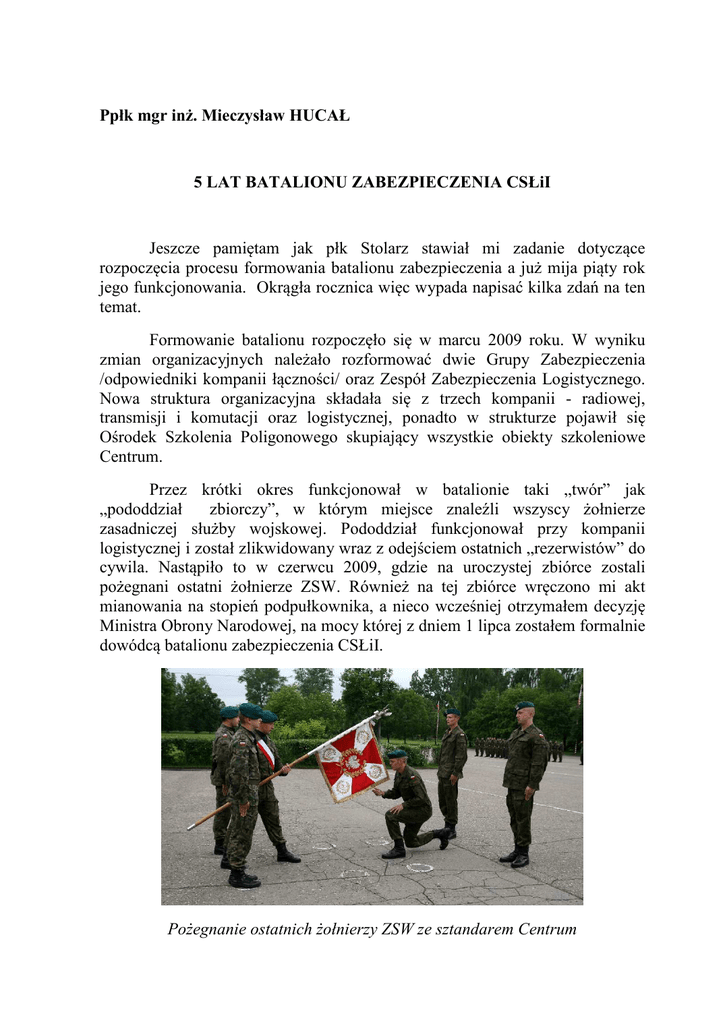 Ppłk mgr inż. Mieczysław HUCAŁ 5 LAT BATALIONU ZABEZPIECZENIA CSŁiI Jeszcze pamiętam jak płk Stolarz stawiał mi zadanie dotyczące rozpoczęcia procesu formowania batalionu zabezpieczenia a już mija piąty rok jego funkcjonowania. Okrągła rocznica więc wypada napisać kilka zdań na ten temat. Formowanie batalionu rozpoczęło się w marcu 2009 roku. W wyniku zmian organizacyjnych należało rozformować dwie Grupy Zabezpieczenia /odpowiedniki kompanii łączności/ oraz Zespół Zabezpieczenia Logistycznego. Nowa struktura organizacyjna składała się z trzech kompanii - radiowej, transmisji i komutacji oraz logistycznej, ponadto w strukturze pojawił się Ośrodek Szkolenia Poligonowego skupiający wszystkie obiekty szkoleniowe Centrum. Przez krótki okres funkcjonował w batalionie taki „twór” jak „pododdział zbiorczy”, w którym miejsce znaleźli wszyscy żołnierze zasadniczej służby wojskowej. Pododdział funkcjonował przy kompanii logistycznej i został zlikwidowany wraz z odejściem ostatnich „rezerwistów” do cywila. Nastąpiło to w czerwcu 2009, gdzie na uroczystej zbiórce zostali pożegnani ostatni żołnierze ZSW. Również na tej zbiórce wręczono mi akt mianowania na stopień podpułkownika, a nieco wcześniej otrzymałem decyzję Ministra Obrony Narodowej, na mocy której z dniem 1 lipca zostałem formalnie dowódcą batalionu zabezpieczenia CSŁiI. Pożegnanie ostatnich żołnierzy ZSW ze sztandarem Centrum Nieco wcześniej, bo z dniem 1 kwietnia zaczęły oficjalnie funkcjonować pozostałe pododdziały batalionu, również w tym dniu ukazał się rozkaz numer jeden dowódcy batalionu. Dlatego też datę 1 kwietnia przyjęliśmy jako dzień, w którym będziemy obchodzić rocznice powstania naszego pododdziału. W czasie tych pięciu lat przeżyliśmy kilka mniejszych lub większych reorganizacji. Między innymi zlikwidowany został Ośrodek Szkolenia Poligonowego /nazwa nieco „na wyrost” w stosunku do tego co posiadał/ a w jego miejsce powstał drugi pluton zabezpieczenia w kompanii logistycznej, który przejął jego mienie i zadania. Z chwilą powstania Wojskowych Oddziałów Gospodarczych, oddaliśmy do zegrzyńskiego 26 WOG-u stołówkę wraz z personelem i większość magazynów. W międzyczasie przejęliśmy po likwidowanej 1 Dywizji Zmechanizowanej strzelnicę w Kątach Węgierskich, która przez kilka lat była w remoncie. W tym roku padły już na niej pierwsze strzały, co usprawniło nam znacznie proces szkolenia. Natomiast jeśli chodzi o sprzęt to niestety „rewolucji” nie było. Praktycznie te egzemplarze, które były na początku istnienia batalionu są do dnia dzisiejszego. Jedynie kompania logistyczna nieco „odświeżyła” swój park pojazdów. Część sprzętu łączności przeszła drobne modernizacje ale nie otrzymaliśmy ani jednego egzemplarza sprzętu nowej generacji. Szczególnie zauważalne jest to w plutonie walki elektronicznej kompanii radiowej, sprzęt tam występujący można potraktować jako jeżdżące „muzeum”. Miejmy nadzieję, że najbliższy czas to zmieni. Sprzęt się nie zmienił ale za to dość istotnej poprawie uległy warunki jego przechowywania. Szczególnie cieszą dwie inwestycje - przebudowa garażu kompanii transmisji i komutacji co umożliwiło „schowanie” wielkogabarytowych, najnowszych aparatowni Jaśmin, gdy stały pod „chmurką”, zwłaszcza zimą to serce „krwawiło”. Druga inwestycja to kapitalny remont garażu kompanii radiowej połączony z wymianą okien i bram garażowych. Pierwszy garaż o stanie przystającym na XXI wiek. Mam nadzieję, że kolejne w najbliższych latach również zmienią swoje „oblicze”. Poprawa warunków „bytowania” dotyczy zarówno pojazdów jak i żołnierzy batalionu. Przez cztery lata naszą siedzibą był budynek numer 8. Budynek nie przystający do obecnych standardów, duże pomieszczenia kancelaryjne, piony sanitarne mające czasy swojej świetności dawno za sobą. Podłogi i ściany wymagające kapitalnego remontu. W listopadzie ubiegłego roku decyzją Komendanta Centrum płk. Ireneusza Fury batalion został przeniesiony do budynku numer 6, który oferuje zdecydowanie lepsze warunki socjalne. Budynek odnowiony, kancelarie bardziej funkcjonalne, piony sanitarne tuż po kapitalnym remoncie. Wszyscy poczynając od szeregowych a kończąc na mnie byli zadowoleni z tej „zamiany”. Niezmiennie głównym zadaniem batalionu zabezpieczenia jest zabezpieczenie szkolenia specjalistycznego w sprzęt mobilny oraz zabezpieczenie funkcjonowania Centrum Szkolenia Łączności i Informatyki od strony logistycznej. Prócz tych zasadniczych realizujemy również szereg zadań równie ważnych zwłaszcza dla wizerunku Centrum jak i Sił Zbrojnych. Z batalionu wywodzi się Kompania Honorowa Centrum. Uczestniczymy we wszystkich uroczystościach na terenie CSŁiI oraz w większości na terenie Garnizonu Zegrze. Żadna oficjalna uroczystość państwowa czy lokalna nie odbywa się bez naszego udziału. Wraz z likwidacją 1 Dywizji teren naszego działania rozszerzył się również na Legionowo, które zostało włączone w granice Garnizonu Zegrze. Staramy się aby nasze „występy” były coraz atrakcyjniejsze. Z mojej inicjatywy we wrześniu 2012 roku Kompania Honorowa została „wyposażona” w apaszki w barwach łączności. Kompania Honorowa z apaszkami w barwach „łącznościowców” Dużo więcej zabiegów i cierpliwości wymagało wyposażenie pododdziału w broń białą. Jeszcze w roku 2012 zainicjowałem działania mające na celu wyposażenie Kompanii Honorowej w szable. Na początku szło to opornie ale dzięki zdecydowanemu wsparciu Komendanta Centrum płk. Ireneusza Fury nasze starania zakończyły się sukcesem. W lipcu 2013 roku po raz pierwszy dowódca Kompani Honorowej oraz poczet sztandarowy wystąpili z szablami. Wymagało to kilku tygodni ciężkich treningów ale efekt końcowy był znakomity. Tren