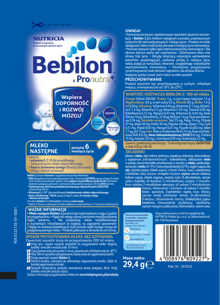 UWAGA! • Karmienie piersią jest najwłaściwszym sposobem żywienia niemowlęcia. • Bebilon 2 jest mlekiem następnym w proszku, przeznaczonym wyłącznie dla niemowląt powyżej 6. miesiąca życia. • Produkt nie może zastępować mleka matki przez pierwsze 6 miesięcy życia niemowlęcia. • Powinien stanowić tylko część zróżnicowanej diety niemowlęcia. • Dla zdrowia dziecka ważna jest urozmaicona i zbilansowana dieta oraz zdrowy tryb życia. • Decyzję dotyczącą rozpoczęcia wprowadzania pokarmów uzupełniających, zwłaszcza poniżej 6. miesiąca życia, należy podjąć po konsultacji z lekarzem, uwzględniając indywidualne zapotrzebowanie niemowlęcia. • Niewłaściwe przygotowanie i przechowywanie może stanowić zagrożenie dla zdrowia dziecka. Najlepiej spożyć przed: patrz data na dole saszetki Ekspert w żywieniu we wczesnym okresie życia PRZECHOWYWANIE Produkt powinien być przechowywany w suchym, chłodnym miejscu, w temperaturze od 10ºC do 25ºC. WARTOŚĆ ODŻYWCZA BEBILON 2: 100 ml mleka Wspiera ODPORNOŚĆ i ROZWÓJ MÓZGU* GOS/FOS DHA/ALA (omega 3) Witaminy A, C i D MLEKO NASTĘPNE 6 powyżej . miesiąca życia * zawiera: • witaminy A, C i D dla prawidłowego funkcjonowania układu odpornościowego • kwas α-linolenowy (omega 3) ważny dla rozwoju mózgu i tkanek nerwowych 2 PDS 0122135-01-0001 Bebilon 2 zawiera Pronutra+ wyjątkową mieszankę składników: • DHA (długołańcuchowy wielonienasycony kwas tłuszczowy (LCPUFA) z grupy omega 3) w ilości 0,3% kwasów tłuszczowych ogółem, który wpływa na prawidłowy rozwój wzroku. Korzystne działanie występuje, gdy wraz z urozmaiconą dietą dziecko spożywa 100 mg DHA dziennie • Opatentowaną, klinicznie przebadaną kompozycję oligosacharydów (GOS/FOS) w ilości 0,8 g/100 ml • Witaminy A, C i D** dla prawidłowego funkcjonowania układu odpornościowego • Kwas α-linolenowy** (ALA) z grupy omega 3, ważny dla rozwoju mózgu i tkanek nerwowych. Ponadto Bebilon 2 z Pronutra+ zawiera nukleotydy. **Bebilon 2 z Pronutra+, podobnie jak inne mleka modyfikowane, zawiera witaminy A, C i D oraz kwas α-linolenowy (ALA). WAŻNE INFORMACJE • Mleko następne Bebilon 2 powinno być wykorzystane w ciągu 2 godzin po przygotowaniu. • Nigdy nie należy używać ponownie niewykorzystanej części pokarmu. • Nie podgrzewaj mleka modyfikowanego w kuchenkach mikrofalowych ze względu na zagrożenie oparzeniem. • Nigdy nie dodawaj dodatkowych ilości proszku bądź niczego innego do przygotowywanego mleka. • Produkt pakowany w atmosferze ochronnej. SPOSÓB PRZYGOTOWANIA MLEKA: BEZ GOTOWANIA Zawartość saszetki służy do przygotowania 200 ml mleka. 1 Umyj ręce i wyparz naczynia potrzebne do przygotowania mleka. Wygotuj butelkę i smoczek w wodzie przez 10 minut. 2 Gotuj świeżą wodę pitną przez 5 minut; pozostaw do schłodzenia (do ok. 40°C). 3 Wlej 180 ml uprzednio przegotowanej ciepłej wody do wygotowanej butelki. 4 Dodaj zawartość saszetki Bebilon 2. 5 Zamknij butelkę i potrząśnij do całkowitego rozpuszczenia proszku. Załóż na butelkę wygotowany smoczek. 6 Sprawdź temperaturę produktu wewnętrzną stroną przegubu dłoni. Umyj butelkę i smoczek zaraz po użyciu. Zobacz instrukcję przygotowania mleka na: www.bebiprogram.pl/produkty Energia kJ/kcal 285/68; Tłuszcz 3 g, w tym kwasy nasycone 1,2 g; Węglowodany: 8,6 g, w tym cukry 6,5 g, Błonnik 0,6 g, Białko 1,4 g. Sól 0,06 g; Witaminy: Witamina A 66 μg, Witamina D 1,4 μg, Witamina E 1,4 mg, Witamina K 5 μg, Witamina C 9,9 mg, Tiamina 0,05 mg, Ryboflawina 0,12 mg, Niacyna 0,43 mg, Witamina B6 0,04 mg, Kwas foliowy 16 μg, Witamina B12 0,18 μg, Biotyna 1,4 μg, Kwas pantotenowy 0,34 mg, Składniki mineralne: Sód 23 mg, Potas 74 mg, Chlorek 47 mg, Wapń 65 mg, Fosfor 36 mg, Magnez 4,8 mg, Żelazo 1 mg, Cynk 0,51 mg, Miedź 0,04 mg, Mangan 0,01 mg, Fluorek ≤0,003 mg, Selen 1,7 μg, Jod 13 μg, Inne: Kwas α-linolenowy (ALA) 74 mg, Kwas arachidonowy (AA) 8,6 mg, Kwas dokozaheksaenowy (DHA) 8,6 mg, Cholina 10 mg, Inozytol 3,6 mg, L-Karnityna 0,95 mg, Nukleotydy 3,2 mg. Zawiera galaktooligosacharydy i fruktooligosacharydy (GOS/FOS) w ilości 0,8 g/100 ml. SKŁADNIKI laktoza z mleka, oleje roślinne (palmowy, rzepakowy, kokosowy, słonecznikowy, z organizmów jednokomórkowych), maltodekstryna, odtłuszczone mleko w proszku, koncentrat białka serwatkowego w proszku (z mleka), galaktooligosacharydy z mleka (8,14%), fruktooligosacharydy (0,57%), węglan wapnia, olej rybi, cytrynian potasu, chlorek wapnia, chlorek choliny, kwas L-askorbinowy, L-askorbinian sodu, tauryna, emulgator: lecytyna sojowa, siarczan żelazawy, fosforan wapnia, chlorek magnezu, inozytol, octan DL-alfa-tokoferolu, siarczan cynku, L-tryptofan, sól disodowa 5'-monofosforanu urydyny, 5'-monofosforan cytydyny, 5'-monofosforan adenozyny, sól sodowa 5'-monofosforanu inozyny, nikotynamid, L-karnityna, sól sodowa 5'-monofosforanu guanozyny, D-pantotenian wapnia, kwas foliowy, siarczan miedzi, palmitynian retinylu, DL-alfa-tokoferol, D-biotyna, chlorowodorek tiaminy, cholekalcyferol, cyjanokobalamina, chlorowodorek pirydoksyny, ryboflawina, siarczan manganu, jodek potasu, fitomenadion, selenin sodu. Chcesz porozmawiać o rozwoju i żywieniu Twojego dziecka? Wyprodukowano w Unii Europejskiej dla: NUTRICIA Polska Sp. z o.o., ul. Bobrowiecka 6, 00-728 Warszawa Skontaktuj się z Ekspertkami Bebilon: Zadzwoń: 801 16 55 55 (opłata tylko za 1 impuls) lub wejdź na www.bebiprogram.pl i porozmawiaj na czacie lub wyślij wiadomość Masa netto: 29,4 g Mat. Nr.: 257022