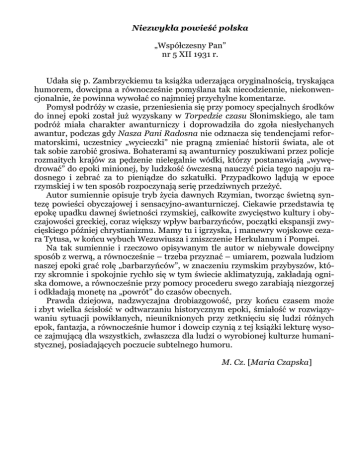 Niezwykła powieść polska „Współczesny Pan” nr 5 XII 1931 r. Udała się p. Zambrzyckiemu ta książka uderzająca oryginalnością, tryskająca humorem, dowcipna a równocześnie pomyślana tak niecodziennie, niekonwencjonalnie, że powinna wywołać co najmniej przychylne komentarze. Pomysł podróży w czasie, przeniesienia się przy pomocy specjalnych środków do innej epoki został już wyzyskany w Torpedzie czasu Słonimskiego, ale tam podróż miała charakter awanturniczy i doprowadziła do zgoła niesłychanych awantur, podczas gdy Nasza Pani Radosna nie odznacza się tendencjami reformatorskimi, uczestnicy „wycieczki” nie pragną zmieniać historii świata, ale ot tak sobie zarobić grosiwa. Bohaterami są awanturnicy poszukiwani przez policje rozmaitych krajów za pędzenie nielegalnie wódki, którzy postanawiają „wywędrować” do epoki minionej, by ludzkość ówczesną nauczyć picia tego napoju radosnego i zebrać za to pieniądze do szkatułki. Przypadkowo lądują w epoce rzymskiej i w ten sposób rozpoczynają serię przedziwnych przeżyć. Autor sumiennie opisuje tryb życia dawnych Rzymian, tworząc świetną syntezę powieści obyczajowej i sensacyjno-awanturniczej. Ciekawie przedstawia tę epokę upadku dawnej świetności rzymskiej, całkowite zwycięstwo kultury i obyczajowości greckiej, coraz większy wpływ barbarzyńców, początki ekspansji zwycięskiego później chrystianizmu. Mamy tu i igrzyska, i manewry wojskowe cezara Tytusa, w końcu wybuch Wezuwiusza i zniszczenie Herkulanum i Pompei. Na tak sumiennie i rzeczowo opisywanym tle autor w niebywale dowcipny sposób z werwą, a równocześnie – trzeba przyznać – umiarem, pozwala ludziom naszej epoki grać rolę „barbarzyńców”, w znaczeniu rzymskim przybyszów, którzy skromnie i spokojnie rychło się w tym świecie aklimatyzują, zakładają ogniska domowe, a równocześnie przy pomocy procederu swego zarabiają niezgorzej i odkładają monetę na „powrót” do czasów obecnych. Prawda dziejowa, nadzwyczajna drobiazgowość, przy końcu czasem może i zbyt wielka ścisłość w odtwarzaniu historycznym epoki, śmiałość w rozwiązywaniu sytuacji powikłanych, nieuniknionych przy zetknięciu się ludzi różnych epok, fantazja, a równocześnie humor i dowcip czynią z tej książki lekturę wysoce zajmującą dla wszystkich, zwłaszcza dla ludzi o wyrobionej kulturze humanistycznej, posiadających poczucie subtelnego humoru. M. Cz. [Maria Czapska]