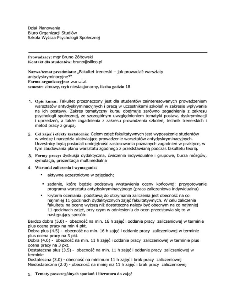 Dział Planowania Biuro Organizacji Studiów Szkoła Wyższa Psychologii Społecznej Prowadzący: mgr Bruno Żółtowski Kontakt dla studentów: [email protected] Nazwa/temat przedmiotu: „Fakultet trenerski – jak prowadzić warsztaty antydyskryminacyjne?” Forma organizacyjna: warsztat semestr: zimowy, tryb niestacjonarny, liczba godzin 18 1. Opis kursu: Fakultet przeznaczony jest dla studentów zainteresowanych prowadzeniem warsztatów antydyskryminacyjnych i pracą w uczestnikami szkoleń w zakresie wpływania na ich postawy. Zakres tematyczny kursu obejmuje zarówno zagadnienia z zakresu psychologii społecznej, ze szczególnym uwzględnieniem tematyki postaw, dyskryminacji i uprzedzeń, a także zagadnienia z zakresu prowadzenia szkoleń, technik trenerskich i metod pracy z grupą. 2. Cel zajęć i efekty kształcenia: Celem zajęć fakultatywnych jest wyposażenie studentów w wiedzę i narzędzia ułatwiające prowadzenie warsztatów antydyskryminacyjnych. Uczestnicy będą posiadali umiejętność zastosowania poznanych zagadnień w praktyce, w tym zbudowania planu warsztatu zgodnego z przedstawianą podczas fakultetu teorią. 3. Formy pracy: dyskusja dydaktyczna, ćwiczenia indywidualne i grupowe, burza mózgów, symulacja, prezentacja multimedialna 4. Warunki zaliczenia i wymagania: § aktywne uczestnictwo w zajęciach; § zadanie, które będzie podstawą wystawienia oceny końcowej: przygotowanie programu warsztatu antydyskryminacyjnego (praca zaliczeniowa indywidualna) § kryteria oceniania: podstawą do otrzymania zaliczenia jest obecność na co najmniej 11 godzinach dydaktycznych zajęć fakultatywnych. W celu zaliczenia fakultetu na ocenę wyższą niż dostateczna należy być obecnym na co najmniej 11 godzinach zajęć, przy czym w odniesieniu do ocen przedstawia się to w następujący sposób: Bardzo dobra (5.0) - obecność na min. 16 h zajęć i oddanie pracy zaliczeniowej w terminie plus ocena pracy na min 4 pkt. Dobra plus (4.5) - obecność na min. 16 h zajęć i oddanie pracy zaliczeniowej w terminie plus ocena pracy na 3 pkt. Dobra (4.0) - obecność na min. 11 h zajęć i oddanie pracy zaliczeniowej w terminie plus ocena pracy na 3 pkt. Dostateczna plus (3.5) - obecność na min. 11 h zajęć i oddanie pracy zaliczeniowej w terminie Dostateczna (3.0) - obecność na minimum 11 h zajęć i brak pracy zaliczeniowej Niedostateczna (2.0) - obecność na mniej niż 11 h zajęć i brak pracy zaliczeniowej 5. Tematy poszczególnych spotkań i literatura do zajęć A. Edukacja antydyskryminacyjna – świadomość trenera Teresa Worobiej, Superwizja w pracy trenera, [w:] Agnieszka Borek, Katarzyna Lipka-Szostak (red.), Sto procent jakości, szkolenia w sektorze pozarządowym, Stowarzyszenie Trenerów Organizacji Pozarządowych, Warszawa 2009, B. Tożsamość społeczna i postrzeganie społeczne Jerzy Nikitorowicz, Pogranicze. Tożsamość. Edukacja międzykulturowa, Transhumana, Białystok 1995, Paweł Boski, Kulturowe ramy zachowań społecznych. Podręcznik psychologii międzykulturowej, Wydawnictwo Naukowe PWN, Academica Wydawnictwo SWPS, Warszawa 2009 C. Stereotypy, uprzedzenia i dyskryminacja Neil Macrae, Charles Stangor, Miles Hewstone, (red.), Stereotypy i uprzedzenia. Najnowsze ujęcie, GWP, Gdańsk 1999 D.Rodzaje dyskryminacji, przeciwdziałanie dyskryminacji - konstruowanie programu warsztatowego Bogusława Budrowska, Danuta Duch, Anna Titkow, Szklany sufit: bariery i ograniczenia karier polskich kobiet. Raport z badań jakościowych, Instytut Spraw Publicznych, Warszawa 2003, http://www.isp.org.pl/files/18928511860411162001134735655.pdf. Bertram Verhaag (reżyseria i scenariusz), Niebieskoocy, Niemcy/USA 1996 (filmowy zapis warsztatu antydyskryminacyjnego prowadzonego przez Jane Elliott). 6. Biogram prowadzącego zajęcia Psycholog, trener, akredytowany coach ICF. Pracuje głównie z dorosłymi, zarówno indywidualnie jak i z grupami. Uczy nowych kompetencji, wspiera w podejmowaniu decyzji, pomaga wprowadzać zmiany. Wykorzystuje doświadczenia zawodowe zdobyte w pracy psychologa, trenera biznesu, wykładowcy i przedsiębiorcy, co pomaga mu syntetyzować wiedzę i skuteczniej rozumieć problemy jego klientów. W pracy stosuje tylko metody potwierdzone naukowo. Pasjonat psychologii społecznej. Ukończył: • Studia magisterskie i doktoranckie z zakresu psychologii na Uniwersytecie Śląskim, • Szkołę Trenerów Biznesu Moderator, • Szkołę coachingu i akredytację ACC International Coach Federation, • Szereg szkoleń dla trenerów.