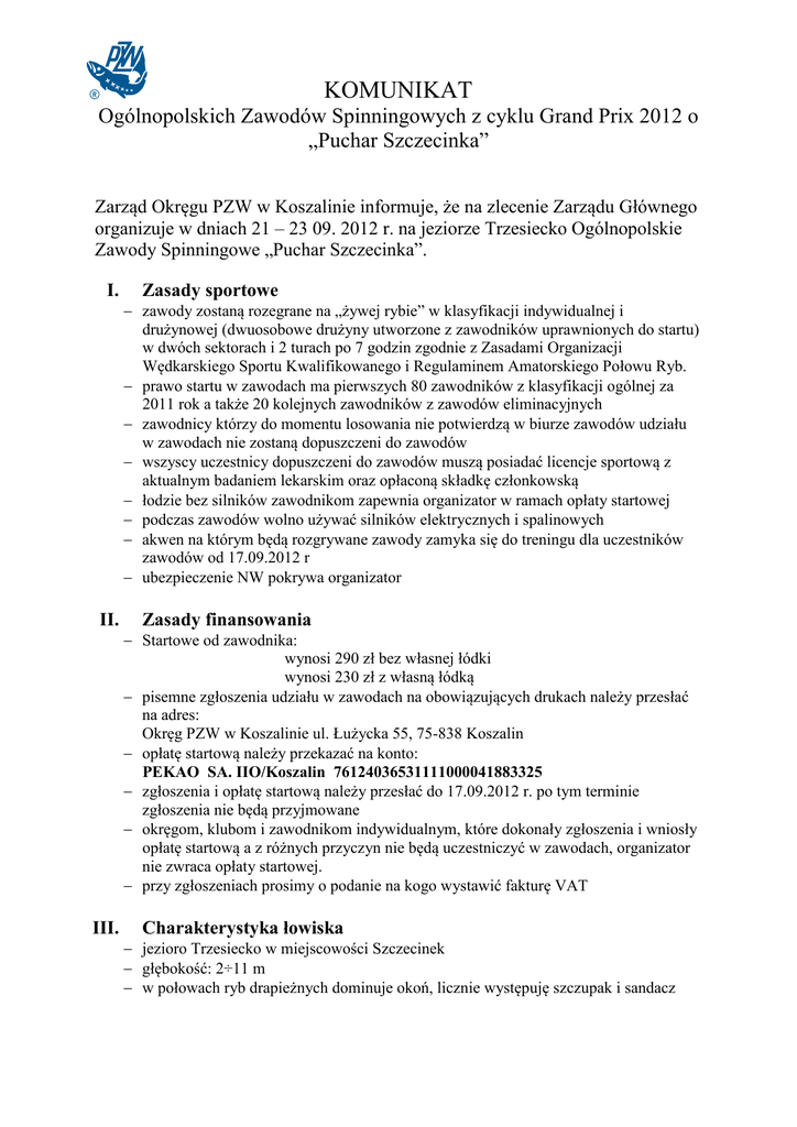 KOMUNIKAT Ogólnopolskich Zawodów Spinningowych z cyklu Grand Prix 2012 o „Puchar Szczecinka” Zarząd Okręgu PZW w Koszalinie informuje, że na zlecenie Zarządu Głównego organizuje w dniach 21 – 23 09. 2012 r. na jeziorze Trzesiecko Ogólnopolskie Zawody Spinningowe „Puchar Szczecinka”. I. II. III. Zasady sportowe − zawody zostaną rozegrane na „żywej rybie” w klasyfikacji indywidualnej i drużynowej (dwuosobowe drużyny utworzone z zawodników uprawnionych do startu) w dwóch sektorach i 2 turach po 7 godzin zgodnie z Zasadami Organizacji Wędkarskiego Sportu Kwalifikowanego i Regulaminem Amatorskiego Połowu Ryb. − prawo startu w zawodach ma pierwszych 80 zawodników z klasyfikacji ogólnej za 2011 rok a także 20 kolejnych zawodników z zawodów eliminacyjnych − zawodnicy którzy do momentu losowania nie potwierdzą w biurze zawodów udziału w zawodach nie zostaną dopuszczeni do zawodów − wszyscy uczestnicy dopuszczeni do zawodów muszą posiadać licencje sportową z aktualnym badaniem lekarskim oraz opłaconą składkę członkowską − łodzie bez silników zawodnikom zapewnia organizator w ramach opłaty startowej − podczas zawodów wolno używać silników elektrycznych i spalinowych − akwen na którym będą rozgrywane zawody zamyka się do treningu dla uczestników zawodów od 17.09.2012 r − ubezpieczenie NW pokrywa organizator Zasady finansowania − Startowe od zawodnika: wynosi 290 zł bez własnej łódki wynosi 230 zł z własną łódką − pisemne zgłoszenia udziału w zawodach na obowiązujących drukach należy przesłać na adres: Okręg PZW w Koszalinie ul. Łużycka 55, 75-838 Koszalin − opłatę startową należy przekazać na konto: PEKAO SA. IIO/Koszalin 76124036531111000041883325 − zgłoszenia i opłatę startową należy przesłać do 17.09.2012 r. po tym terminie zgłoszenia nie będą przyjmowane − okręgom, klubom i zawodnikom indywidualnym, które dokonały zgłoszenia i wniosły opłatę startową a z różnych przyczyn nie będą uczestniczyć w zawodach, organizator nie zwraca opłaty startowej. − przy zgłoszeniach prosimy o podanie na kogo wystawić fakturę VAT Charakterystyka łowiska − jezioro Trzesiecko w miejscowości Szczecinek − głębokość: 2÷11 m − w połowach ryb drapieżnych dominuje okoń, licznie występuję szczupak i sandacz IV. V. Zakwaterowanie − zakwaterowanie i wyżywienie zawodnicy organizują we własnym zakresie − biuro zawodów będzie się mieścić w Samorządowej Agencji Promocji i Kultury przy ulicy Kilińskiego 1 w Szczecinku − sugerowane miejsce noclegowe: Schronisko Młodzieżowe w Szczecinku ul. Kościuszki 47-49 , tel. 094 3740113 (dostępnych 130 miejsc w cenie 30-40 zł w zależności od standardu i ilości osób w pokoju), całodzienne wyżywienie w tym schronisku (śniadanie, obiad, kolacja) to koszt 30 zł kontakt : pani Ewa Umińska tel. 609 425 318 − odległość od schroniska do przystani 300 m. Komisja Sędziowska Józef Jeziorski Artur Kalinowski Marek Andreasik Ryszard Dąbała VI. - Sędzia Główny - Sekretarz - Sędzia sektorowy - Sędzia Sektorowy Program zawodów Piątek 21.09.2012 r 1100 - 1700 otwarcie sekretariatu, przyjmowanie ekip 00 17 uroczyste otwarcie zwodów (Samorządowa Agencja Promocji i kultury – 150 m od schroniska) 30 odprawa kierowników, losowanie sektorów, numerów 17 startowych i łodzi Sobota 22.09.2012 r 700 730 800 - 1500 1700 zbiórka na przystani wypłynięcie na łowisko I tura zawodów ogłoszenie wyników I tury Niedziela 23.09.2012 r 700 zbiórka na przystani 30 7 wypłynięcie na łowisko 800 - 1500 II tura zawodów 1700 ogłoszenie wyników zawodów, zakończenie zawodów W sprawach organizacyjnych proszę się kontaktować: Mariusz Getka – prezes koła Jesiotr w Szczecinku – gospodarz zawodów tel. 604 167 726 Ryszard Dzikiewicz – wiceprezes ds. sportu ZO PZW Koszalin tel. 609 139 254 Alina Dąbała – biura ZO PZW Koszalin tel. 094 342 50 66 Zał. - karta zgłoszenia - mapka jeziora Wiceprezes ds. sportu ZO PZW w Koszalinie Ryszard Dzikiewicz
