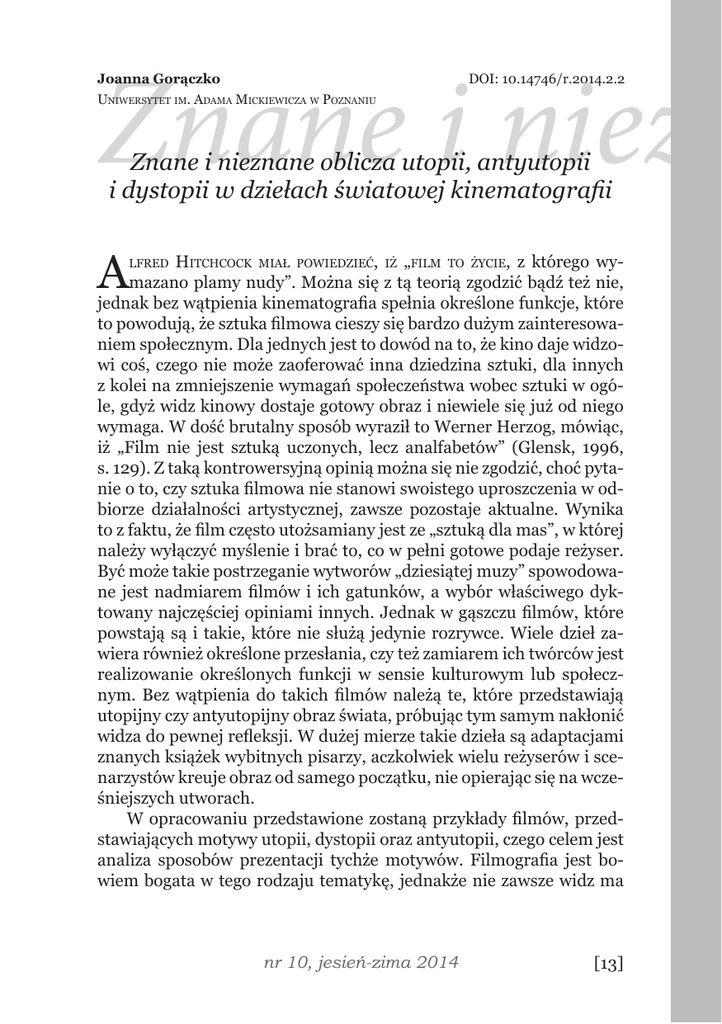 Znane i niez Joanna Gorączko Uniwersytet im. Adama Mickiewicza w Poznaniu DOI: 10.14746/r.2014.2.2 Znane i nieznane oblicza utopii, antyutopii i dystopii w dziełach światowej kinematografii A Hitchcock miał powiedzieć, iż „film to życie, z którego wymazano plamy nudy”. Można się z tą teorią zgodzić bądź też nie, jednak bez wątpienia kinematografia spełnia określone funkcje, które to powodują, że sztuka filmowa cieszy się bardzo dużym zainteresowaniem społecznym. Dla jednych jest to dowód na to, że kino daje widzowi coś, czego nie może zaoferować inna dziedzina sztuki, dla innych z kolei na zmniejszenie wymagań społeczeństwa wobec sztuki w ogóle, gdyż widz kinowy dostaje gotowy obraz i niewiele się już od niego wymaga. W dość brutalny sposób wyraził to Werner Herzog, mówiąc, iż „Film nie jest sztuką uczonych, lecz analfabetów” (Glensk, 1996, s. 129). Z taką kontrowersyjną opinią można się nie zgodzić, choć pytanie o to, czy sztuka filmowa nie stanowi swoistego uproszczenia w odbiorze działalności artystycznej, zawsze pozostaje aktualne. Wynika to z faktu, że film często utożsamiany jest ze „sztuką dla mas”, w której należy wyłączyć myślenie i brać to, co w pełni gotowe podaje reżyser. Być może takie postrzeganie wytworów „dziesiątej muzy” spowodowane jest nadmiarem filmów i ich gatunków, a wybór właściwego dyktowany najczęściej opiniami innych. Jednak w gąszczu filmów, które powstają są i takie, które nie służą jedynie rozrywce. Wiele dzieł zawiera również określone przesłania, czy też zamiarem ich twórców jest realizowanie określonych funkcji w sensie kulturowym lub społecznym. Bez wątpienia do takich filmów należą te, które przedstawiają utopijny czy antyutopijny obraz świata, próbując tym samym nakłonić widza do pewnej refleksji. W dużej mierze takie dzieła są adaptacjami znanych książek wybitnych pisarzy, aczkolwiek wielu reżyserów i scenarzystów kreuje obraz od samego początku, nie opierając się na wcześniejszych utworach. W opracowaniu przedstawione zostaną przykłady filmów, przedstawiających motywy utopii, dystopii oraz antyutopii, czego celem jest analiza sposobów prezentacji tychże motywów. Filmografia jest bowiem bogata w tego rodzaju tematykę, jednakże nie zawsze widz ma lfred nr 10, jesień-zima 2014 [13] Joanna Gorączko pełną świadomość jaką rolę odgrywa zastosowany motyw. Szczególnie ważną funkcję pełni korzystanie przez twórców z dystopii, co ma przestrzegać przed określonymi postawami, działaniami czy stanowi odbicie pewnych obaw. Celem zaprezentowania danych motywów jest zatem próba odpowiedzi na pytanie jak są one wykorzystywane przez filmowców w różnego rodzaju dziełach i czy rzeczywiście niosą ze sobą określone przesłanie. Zanim jednak zostaną nakreślone przykłady owych filmów, warto odnieść się do samego zagadnienia utopii i antyutopii. Pojęcie utopii, dystopii i antyutopii W 1516 r. Tomasz More opublikował dzieło zatytułowane Utopia, w którym przedstawił wizję idealnego świata. Akcja toczy się właśnie na wyspie o nazwie Utopia, gdzie panuje porządek i ład prawny. Mieszkańcy wydają się zadowoleni ze swojego losu, gdyż obowiązujące prawo jest sprawiedliwe i równe wobec wszystkich. Oprócz samej fabuły utworu interesująca jest etymologia nazwy. Otóż słowo utopia pochodzi najprawdopodobniej z greki i może posiadać dwa znaczenia, które wywodzą się od słów: outopos i eutopia. Pierwsze z nich tłumaczy się jako „miejsce, którego nie ma”, z kolei drugie jako „dobre miejsce”. Wielu badaczy przyjmuje, że taka niejednoznaczność była przez More’a w pełni zamierzona (Szacki, 2000, s. 11 – 12). Biorąc pod uwagę powyższe informacje, można stwierdzić, że utopia jest wyobrażeniem świata idealnego, w którym panuje porządek i ogólna szczęśliwość obywateli. Co ciekawe, świat ten często lokalizowany jest na „wyspach szczęśliwych”, czyli innymi słowy w miejscu, które nie istnieje, a które stanowi odzwierciedlenie ludzkich dążeń. Jednak i takie rozumienie utopii zawiera w sobie pewną sprzeczność, gdyż ogólny porządek i ład może wiązać się z naruszeniem czyjegoś dążenia do anarchicznej wizji świata, a więc tym samym ogólna szczęśliwość wydaje się fikcją. Zgodnie ze stwierdzeniem Władysława Tatarkiewicza, że „aby wszystkich ludzi uczynić doskonałymi, trzeba wielu z nich odebrać wolność, zastosować wobec nich przymus, a nie zdaje się, aby ludzie mogli być szczęśliwi pod przymusem” (Tatarkiewicz, 1990, s. 465). Według teorii sformułowanej przez Karla Mannheima utopia jest niejako „życzeniowym wyobrażeniem”, pragnieniem funkcjonowania w określonej rzeczywistości (Claeys, 2013, s. 150). Jeśli istnienie utopii jest niemożliwe, to być może możliwym jest zaistnienie takiego stanu, który będzie stanowił całkowite przeciwieństwo krainy wiecznej i powszechnej szczęśliwości. W literaturze [14] refleksje Znane i nieznane oblicza utopii, antyutopii i dystopii... nierzadko przedstawiane było społeczeństwo w pełni zniewolone, poddane władzy silniejszych – czy to jednostek, czy całego systemu – społeczeństwo ogarnięte terrorem i przesiąknięte nieufnością oraz strachem i podejrzliwością. Miejsca, w których rządziły wszechogarniający lęk, przymus i przemoc, określane są mianem antyutopii bądź też dystopii. Pojęcia te często uważane są za synonimicznie, jest to jednak błędne podejście. Otóż antyutopia funkcjonuje na podłożu utopii, czyli najpierw kreator danego stanu rzeczy, a więc np. autor tworzący obraz pewnej rzeczywistości, powinien założyć, jakie cechy (jego zdaniem) charakteryzują idealne społeczeństwo i porządek świata, a następnie tworzonej wizji przypisać dokładnie przeciwne cechy. Jedna z definicji antyutopii mówi, iż „jes