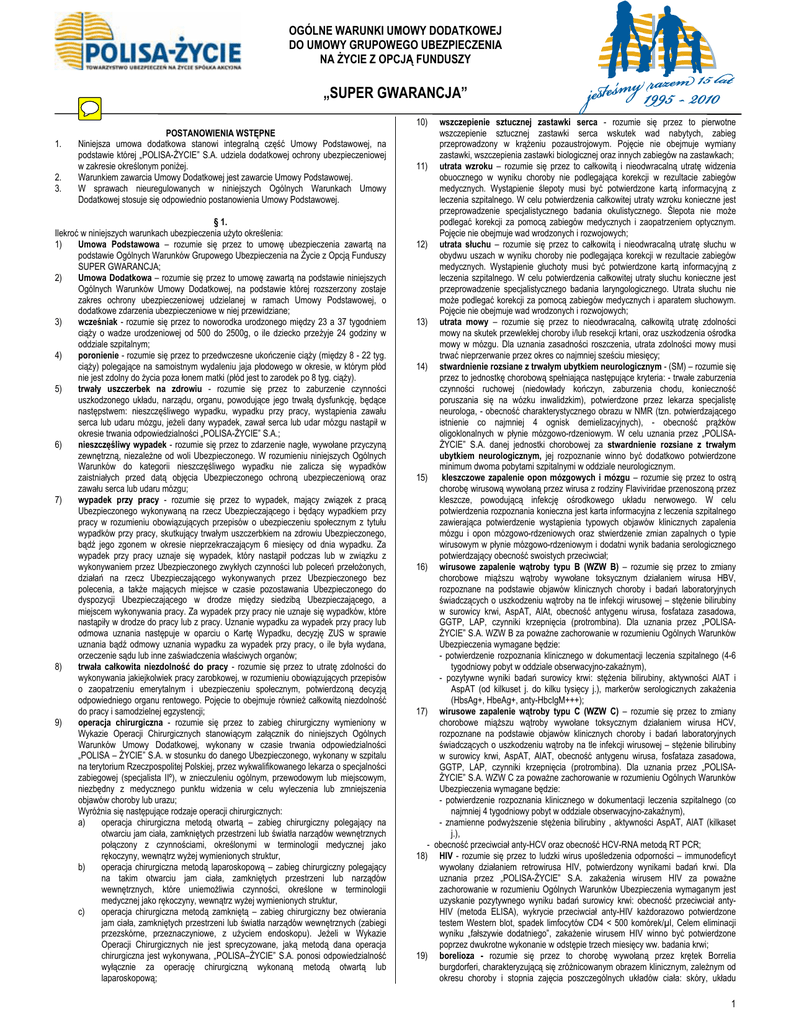 OGÓLNE WARUNKI UMOWY DODATKOWEJ DO UMOWY GRUPOWEGO UBEZPIECZENIA NA ŻYCIE Z OPCJĄ FUNDUSZY „SUPER GWARANCJA” SUPER GWARANCJA 1. 2. 3. POSTANOWIENIA WSTĘPNE Niniejsza umowa dodatkowa stanowi integralną część Umowy Podstawowej, na podstawie której „POLISA-ŻYCIE” S.A. udziela dodatkowej ochrony ubezpieczeniowej w zakresie określonym poniżej. Warunkiem zawarcia Umowy Dodatkowej jest zawarcie Umowy Podstawowej. W sprawach nieuregulowanych w niniejszych Ogólnych Warunkach Umowy Dodatkowej stosuje się odpowiednio postanowienia Umowy Podstawowej. § 1. Ilekroć w niniejszych warunkach ubezpieczenia użyto określenia: 1) Umowa Podstawowa – rozumie się przez to umowę ubezpieczenia zawartą na podstawie Ogólnych Warunków Grupowego Ubezpieczenia na Życie z Opcją Funduszy SUPER GWARANCJA; 2) Umowa Dodatkowa – rozumie się przez to umowę zawartą na podstawie niniejszych Ogólnych Warunków Umowy Dodatkowej, na podstawie której rozszerzony zostaje zakres ochrony ubezpieczeniowej udzielanej w ramach Umowy Podstawowej, o dodatkowe zdarzenia ubezpieczeniowe w niej przewidziane; 3) wcześniak - rozumie się przez to noworodka urodzonego między 23 a 37 tygodniem ciąży o wadze urodzeniowej od 500 do 2500g, o ile dziecko przeżyje 24 godziny w oddziale szpitalnym; 4) poronienie - rozumie się przez to przedwczesne ukończenie ciąży (między 8 - 22 tyg. ciąży) polegające na samoistnym wydaleniu jaja płodowego w okresie, w którym płód nie jest zdolny do życia poza łonem matki (płód jest to zarodek po 8 tyg. ciąży). 5) trwały uszczerbek na zdrowiu - rozumie się przez to zaburzenie czynności uszkodzonego układu, narządu, organu, powodujące jego trwałą dysfunkcję, będące następstwem: nieszczęśliwego wypadku, wypadku przy pracy, wystąpienia zawału serca lub udaru mózgu, jeżeli dany wypadek, zawał serca lub udar mózgu nastąpił w okresie trwania odpowiedzialności „POLISA-ŻYCIE” S.A.; 6) nieszczęśliwy wypadek - rozumie się przez to zdarzenie nagłe, wywołane przyczyną zewnętrzną, niezależne od woli Ubezpieczonego. W rozumieniu niniejszych Ogólnych Warunków do kategorii nieszczęśliwego wypadku nie zalicza się wypadków zaistniałych przed datą objęcia Ubezpieczonego ochroną ubezpieczeniową oraz zawału serca lub udaru mózgu; 7) wypadek przy pracy - rozumie się przez to wypadek, mający związek z pracą Ubezpieczonego wykonywaną na rzecz Ubezpieczającego i będący wypadkiem przy pracy w rozumieniu obowiązujących przepisów o ubezpieczeniu społecznym z tytułu wypadków przy pracy, skutkujący trwałym uszczerbkiem na zdrowiu Ubezpieczonego, bądź jego zgonem w okresie nieprzekraczającym 6 miesięcy od dnia wypadku. Za wypadek przy pracy uznaje się wypadek, który nastąpił podczas lub w związku z wykonywaniem przez Ubezpieczonego zwykłych czynności lub poleceń przełożonych, działań na rzecz Ubezpieczającego wykonywanych przez Ubezpieczonego bez polecenia, a także mających miejsce w czasie pozostawania Ubezpieczonego do dyspozycji Ubezpieczającego w drodze między siedzibą Ubezpieczającego, a miejscem wykonywania pracy. Za wypadek przy pracy nie uznaje się wypadków, które nastąpiły w drodze do pracy lub z pracy. Uznanie wypadku za wypadek przy pracy lub odmowa uznania następuje w oparciu o Kartę Wypadku, decyzję ZUS w sprawie uznania bądź odmowy uznania wypadku za wypadek przy pracy, o ile była wydana, orzeczenie sądu lub inne zaświadczenia właściwych organów; 8) trwała całkowita niezdolność do pracy - rozumie się przez to utratę zdolności do wykonywania jakiejkolwiek pracy zarobkowej, w rozumieniu obowiązujących przepisów o zaopatrzeniu emerytalnym i ubezpieczeniu społecznym, potwierdzoną decyzją odpowiedniego organu rentowego. Pojęcie to obejmuje również całkowitą niezdolność do pracy i samodzielnej egzystencji; 9) operacja chirurgiczna - rozumie się przez to zabieg chirurgiczny wymieniony w Wykazie Operacji Chirurgicznych stanowiącym załącznik do niniejszych Ogólnych Warunków Umowy Dodatkowej, wykonany w czasie trwania odpowiedzialności „POLISA – ŻYCIE” S.A. w stosunku do danego Ubezpieczonego, wykonany w szpitalu na terytorium Rzeczpospolitej Polskiej, przez wykwalifikowanego lekarza o specjalności zabiegowej (specjalista IIº), w znieczuleniu ogólnym, przewodowym lub miejscowym, niezbędny z medycznego punktu widzenia w celu wyleczenia lub zmniejszenia objawów choroby lub urazu; Wyróżnia się następujące rodzaje operacji chirurgicznych: a) operacja chirurgiczna metodą otwartą – zabieg chirurgiczny polegający na otwarciu jam ciała, zamkniętych przestrzeni lub światła narządów wewnętrznych połączony z czynnościami, określonymi w terminologii medycznej jako rękoczyny, wewnątrz wyżej wymienionych struktur, b) operacja chirurgiczna metodą laparoskopową – zabieg chirurgiczny polegający na takim otwarciu jam ciała, zamkniętych przestrzeni lub narządów wewnętrznych, które uniemożliwia czynności, określone w terminologii medycznej jako rękoczyny, wewnątrz wyżej wymienionych struktur, c) operacja chirurgiczna metodą zamkniętą – zabieg chirurgiczny bez otwierania jam ciała, zamkniętych przestrzeni lub światła narządów wewnętrznych (zabiegi przezskórne, przeznaczyniowe, z użyciem endoskopu). Jeżeli w Wykazie Operacji Chirurgicznych nie jest sprecyzowane, jaką metodą dana operacja chirurgiczna jest wykonywana, „POLISA–ŻYCIE” S.A. ponosi odpowiedzialność wyłącznie za operację chirurgiczną wykonaną metodą otwartą lub laparoskopową; 10) 11) 12) 13) 14) 15) 16) 17) 18) 19) wszczepienie sztucznej zastawki serca - rozumie się przez to pierwotne wszczepienie sztucznej zastawki serca wskutek wad nabytych, zabieg przeprowadzony w krążeniu pozaustrojowym. Pojęcie nie obejmuje wymiany zastawki, wszczepienia zastawki biologicznej oraz innych zabiegów na zastawkach; utrata wzroku – rozu