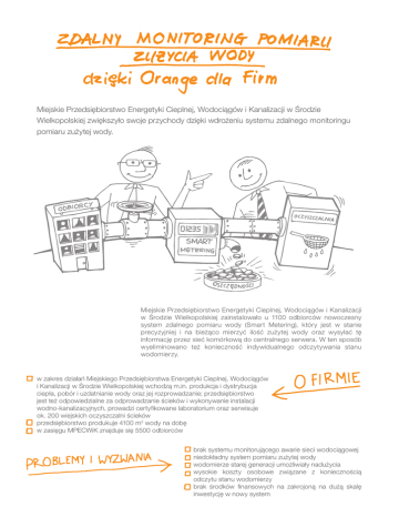 Miejskie Przedsiębiorstwo Energetyki Cieplnej, Wodociągów i Kanalizacji w Środzie Wielkopolskiej zwiększyło swoje przychody dzięki wdrożeniu systemu zdalnego monitoringu pomiaru zużytej wody. Miejskie Przedsiębiorstwo Energetyki Cieplnej, Wodociągów i Kanalizacji w Środzie Wielkopolskiej zainstalowało u 1100 odbiorców nowoczesny system zdalnego pomiaru wody (Smart Metering), który jest w stanie precyzyjniej i na bieżąco mierzyć ilość zużytej wody oraz wysyłać tę informację przez sieć komórkową do centralnego serwera. W ten sposób wyeliminowano też konieczność indywidualnego odczytywania stanu wodomierzy. w zakres działań Miejskiego Przedsiębiorstwa Energetyki Cieplnej, Wodociągów i Kanalizacji w Środzie Wielkopolskiej wchodzą m.in. produkcja i dystrybucja ciepła, pobór i uzdatnianie wody oraz jej rozprowadzanie; przedsiębiorstwo jest też odpowiedzialne za odprowadzanie ścieków i wykonywanie instalacji wodno-kanalizacyjnych, prowadzi certyfikowane laboratorium oraz serwisuje ok. 200 wiejskich oczyszczalni ścieków przedsiębiorstwo produkuje 4100 m3 wody na dobę w zasięgu MPECWiK znajduje się 5500 odbiorców brak systemu monitorującego awarie sieci wodociągowej niedokładny system pomiaru zużytej wody wodomierze starej generacji umożliwiały nadużycia wysokie koszty osobowe związane z koniecznością odczytu stanu wodomierzy brak środków finansowych na zakrojoną na dużą skalę inwestycję w nowy system instalacja systemu zdalnego monitoringu (Smart Metering) składającego się z wysokiej klasy wodomierzy (1100 szt.) wyposażonych w nakładki umożliwiające bieżący odczyt danych i zdalną komunikację z serwerem poprzez sieć komórkową Miejskie Przedsiębiorstwo Energetyki Cieplnej, Wodociągów i Kanalizacji w Środzie Wielkopolskiej – jak każda tego typu instytucja – borykało się z problemem strat wody, która była pobierana ze źródła, ale nie była sprzedawana. Fakt ten wynikał z kilku czynników – długiego czasu wykrywania i usuwania awarii w sieci wodociągowej, niedoskonałości urządzeń pomiarowych oraz zdarzającego się nielegalnego poboru wody przez odbiorców poprzez ingerencję w pracę wodomierzy. MPECWiK zdecydował się skorzystać z rozwiązania Smart Meteringu oferowanego przez firmę GPM wspólnie z konsorcjum firm Orange i Pronal. U 1100 odbiorców zainstalowano specjalne, nowoczesne wodomierze wyposażone w nakładkę pozwalającą na precyzyjny odczyt parametrów pracy wodomierza oraz rejestrowanie wszelkich zdarzeń, a także wysyłanie tych informacji do centralnego serwera w celu ich analizy. Wdrożone rozwiązanie przyniosło korzyść w dwóch obszarach. Uszczelniono system odczytu wody, dzięki czemu zwiększono sprzedaż i przychody o ok. 11%. Już w pierwszych miesiącach funkcjonowania systemu udało się zidentyfikować i usunąć kilka nieszczelności w infrastrukturze użytkowników. Wyeliminowano także konieczność indywidualnego odczytu stanów wodomierzy, co było szczególnie czasochłonne w rejonie gospodarstw jednorodzinnych. Dla MPECWiK bardzo korzystny jest też model rozliczenia za kupioną usługę. Oferenci systemu pobierają opłatę abonamentową od każdego zainstalowanego wodomierza, na którą składają się płatność za obsługę systemu, wodomierz z nakładką oraz opłata za usługi komórkowej transmisji danych z wodomierza do centralnego serwera. Dzięki temu przedsiębiorstwo uniknęło wysokich kosztów instalacyjnych, które stanowiłyby pokaźną kwotę w rocznym budżecie i uniemożliwiły dalszy rozwój. wzrost sprzedaży o 11% uszczelnienie systemu minimalizujące niekontrolowane wycieki wody eliminacja nadużyć ze strony użytkowników eliminacja konieczności indywidualnego odczytywania stanu wodomierzy możliwość szybkiego reagowania na awarie sieci wodociągowej bądź nieprawidłowości w jej pracy utrzymanie stabilności finansowej MPECWiK dzięki płatności za usługę w abonamencie opieka serwisowa i konfiguracyjna utrzymywana przez oferentów systemu Analiza wyników pierwszego kwartału 2012 r. wskazuje, że w rejonie, gdzie zainstalowaliśmy 1100 pkt z systemem Smart Metering (spójny system informatyczny, wodomierze, nakładki z kartami SIM), sprzedaż wzrosła o ok. 11% względem tego samego okresu w 2011 r. Jest to bardzo duży wzrost, który nie tylko od razu pozwala na inwestycję w nowy system, ale także skłania nas do objęcia tym systemem coraz większych grup odbiorców w naszym rejonie. Ponadto dobra współpraca z firmami GPM, Pronal i Orange gwarantuje osiągnięcie zakładanych efektów w skali całego przedsiębiorstwa. Jan Buczkowski, prezes zarządu MPECWiK w Środzie Wielkopolskiej