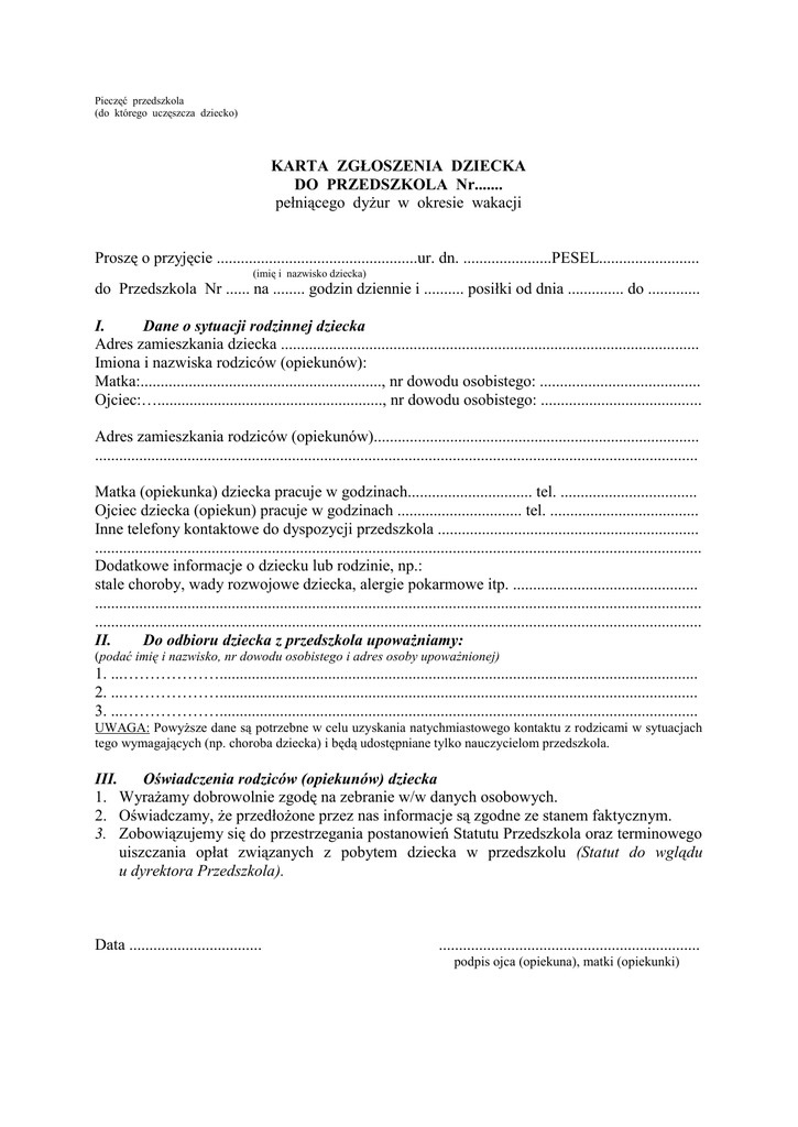 Pieczęć przedszkola (do którego uczęszcza dziecko) KARTA ZGŁOSZENIA DZIECKA DO PRZEDSZKOLA Nr....... pełniącego dyżur w okresie wakacji Proszę o przyjęcie ..................................................ur. dn. ......................PESEL......................... (imię i nazwisko dziecka) do Przedszkola Nr ...... na ........ godzin dziennie i .......... posiłki od dnia .............. do ............. I. Dane o sytuacji rodzinnej dziecka Adres zamieszkania dziecka ........................................................................................................ Imiona i nazwiska rodziców (opiekunów): Matka:............................................................, nr dowodu osobistego: ........................................ Ojciec:…........................................................, nr dowodu osobistego: ........................................ Adres zamieszkania rodziców (opiekunów)................................................................................. ...................................................................................................................................................... Matka (opiekunka) dziecka pracuje w godzinach............................... tel. .................................. Ojciec dziecka (opiekun) pracuje w godzinach ............................... tel. ..................................... Inne telefony kontaktowe do dyspozycji przedszkola ................................................................. ....................................................................................................................................................... Dodatkowe informacje o dziecku lub rodzinie, np.: stale choroby, wady rozwojowe dziecka, alergie pokarmowe itp. .............................................. ....................................................................................................................................................... ....................................................................................................................................................... II. Do odbioru dziecka z przedszkola upoważniamy: (podać imię i nazwisko, nr dowodu osobistego i adres osoby upoważnionej) 1. ...………………....................................................................................................................... 2. ...………………....................................................................................................................... 3. ...………………....................................................................................................................... UWAGA: Powyższe dane są potrzebne w celu uzyskania natychmiastowego kontaktu z rodzicami w sytuacjach tego wymagających (np. choroba dziecka) i będą udostępniane tylko nauczycielom przedszkola. III. Oświadczenia rodziców (opiekunów) dziecka 1. Wyrażamy dobrowolnie zgodę na zebranie w/w danych osobowych. 2. Oświadczamy, że przedłożone przez nas informacje są zgodne ze stanem faktycznym. 3. Zobowiązujemy się do przestrzegania postanowień Statutu Przedszkola oraz terminowego uiszczania opłat związanych z pobytem dziecka w przedszkolu (Statut do wglądu u dyrektora Przedszkola). Data ................................. ................................................................. podpis ojca (opiekuna), matki (opiekunki) IV. Wysokość opłaty stałej wnoszonej w macierzystym Przedszkolu Nr ................ …………………………………………………………………………………………………... Data ................................. ................................................................. podpis dyrektora przedszkola