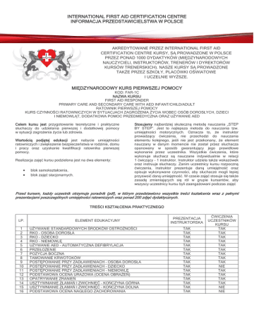 INTERNATIONAL FIRST AID CERTIFICATION CENTRE INFORMACJA PRZEDSTAWICIELSTWA W POLSCE AKREDYTOWANE PRZEZ INTERNATIONAL FIRST AID CERTIFICATION CENTRE KURSY, SĄ PROWADZONE W POLSCE PRZEZ PONAD 1000 DYDAKTYKÓW (MIĘDZYNARODOWYCH NAUCZYCIELI, INSTRUKTORÓW, TRENERÓW I DYREKTORÓW KURSÓW TRENERSKICH). NASZE KURSY SĄ PROWADZONE TAKŻE PRZEZ SZKOŁY, PLACÓWKI OŚWIATOWE I UCZELNIE WYŻSZE. MIĘDZYNARODOWY KURS PIERWSZEJ POMOCY KOD: FAR-1C NAZWA KURSU FIRST AID RESPONDER PRIMARY CARE AND SECONDARY CARE WITH AED INFANT/CHILD/ADULT RATOWNIK PIERWSZEJ POMOCY KURS CZYNNOŚCI RATOWNICZYCH W SYTUACJACH ZAGROŻENIA ŻYCIA WOBEC OSÓB DOROSŁYCH, DZIECI I NIEMOWLĄT, DODATKOWA POMOC PRZEDMEDYCZNA ORAZ UŻYWANIE AED Celem kursu jest przygotowanie teoretyczne i praktyczne słuchaczy do udzielania pierwszej i dodatkowej pomocy w sytuacji zagrożenia życia lub zdrowia. Wartością podjętej edukacji jest nabycie umiejętności ratowniczych i zwiększenie bezpieczeństwa w rodzinie, domu i pracy oraz uzyskanie kwalifikacji ratownika pierwszej pomocy. Realizacja zajęć kursu podzielona jest na dwa elementy: blok samokształcenia, blok zajęć stacjonarnych. Stosujemy najbardziej skuteczną metodę nauczania „STEP BY STEP”. Jest to najlepsza metoda do nauczania tzw. umiejętności motorycznych. Oznacza to, że instruktor prowadzący ćwiczenia, nie przechodzi do nauczania elementu kolejnego, jeśli nie jest przekonany, że element nauczany w danym momencie nie został przez słuchacza opanowany w sposób gwarantujący jego prawidłowe wykonanie przez uczestnika. Wszystkie ćwiczenia, które wykonuje słuchacz są nauczane indywidualnie w relacji 1 ćwiczący – 1 instruktor. Instruktor udziela także wskazówek oraz instruuje słuchaczy. Zanim uczestnicy kursu rozpoczną ćwiczenia, instruktor prezentuje daną umiejętność oraz opisuje wykonywane czynności, aby słuchacze mogli lepiej przyswoić daną umiejętność. W czasie zajęć stosuje się także zasadę zmieniających się ról w grupie kursantów, aby wszyscy uczestnicy kursu byli zaangażowani podczas zajęć Przed kursem, każdy uczestnik otrzymuje poradnik (pdf), w którym przedstawiono wszystkie treści kształcenia wraz z pełnymi prezentacjami poszczególnych umiejętności ratowniczych oraz ponad 200 zdjęć dydaktycznych. TREŚCI KSZTAŁCENIA PRAKTYCZNEGO LP. 1 2 3 4 5 6 7 8 9 10 11 12 13 14 15 16 ELEMENT EDUKACYJNY UŻYWANIE STANDARDOWYCH ŚRODKÓW OSTROŻNOŚCI RKO – OSOBA DOROSŁA RKO - DZIECKO RKO - NIEMOWLĘ UŻYWANIE AED - AUTOMATYCZNA DEFIBRYLACJA PRZEŁOŻENIE POZYCJA BOCZNA TAMOWANIE KRWOTOKÓW POSTĘPOWANIE PRZY ZADŁAWIENIACH – OSOBA DOROSŁA POSTĘPOWANIE PRZY ZADŁAWIENIACH - DZIECKO POSTĘPOWANIE PRZY ZADŁAWIENIACH - NIEMOWLĘ PODSTAWOWA OCENA URAZOWA (OCENA OBRAŻEŃ) OPATRYWANIE ZRANIEŃ USZTYWNIANIE ZŁAMAŃ I ZWICHNIĘĆ – KOŃCZYNA GÓRNA USZTYWNIANIE ZŁAMAŃ I ZWICHNIĘĆ – KOŃCZYNA DOLNA PODSTAWOWA OCENA NAGŁEGO ZACHOROWANIA PREZENTACJA INSTRUKTORSKA TAK TAK TAK TAK TAK TAK TAK TAK TAK TAK TAK TAK TAK TAK TAK TAK ĆWICZENIA UCZESTNIKÓW KURSU TAK TAK TAK TAK TAK TAK TAK TAK TAK NIE TAK TAK TAK TAK NIE NIE