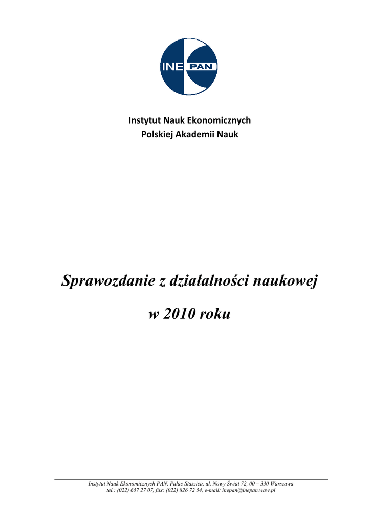 Instytut Nauk Ekonomicznych Polskiej Akademii Nauk Sprawozdanie z działalności naukowej w 2010 roku Instytut Nauk Ekonomicznych PAN, Pałac Staszica, ul. Nowy Świat 72, 00 – 330 Warszawa tel.: (022) 657 27 07, fax: (022) 826 72 54, e-mail: [email protected] Sprawozdanie z działalności INE PAN w 2010 roku SPRAWOZDANIE Z DZIAŁALNOŚCI INE PAN W 2010 ROKU 2 Sprawozdanie z działalności INE PAN w 2010 roku SPRAWOZDANIE Z DZIAŁALNOŚCI INSTYTUTU NAUK EKONOMICZNYCH PAN W 2010 ROKU DYREKTOR: Prof. dr hab. Leszek Jasiński PRZEWODNICZĄCY RADY NAUKOWEJ: Prof. dr hab. Jerzy Osiatyński Instytut posiada uprawnienia do nadawania stopnia naukowego doktora i doktora habilitowanego oraz do wnioskowania o nadawanie tytułu naukowego profesora nauk ekonomicznych. W roku sprawozdawczym w INE PAN nadano jeden tytuł doktora. ZATRUDNIENIE Zatrudnienie średnioroczne w przeliczeniu na pełne etaty, zgodnie z obowiązującymi przepisami GUS wyniosło w 2010 roku 30,20 pracowników, w tym 20,25 naukowych. DZIAŁALNOŚĆ NAUKOWA Opublikowano łącznie 234 prace, wśród nich 6 monografii i opracowań indywidualnych, 131 fragmentów publikacji podręcznikowych, 47 publikacji w recenzowanych czasopismach naukowych oraz 50 innych publikacji. W 2010 roku działalność INE PAN koncentrowała się na następujących problemach badawczych: − Gospodarka globalna i międzynarodowe stosunki gospodarcze − Struktura i kierunki rozwoju gospodarki polskiej − Idee i modele ekonomiczne − Uwarunkowania instytucjonalne i społeczne wzrostu gospodarczego − Ryzyko i stabilność w gospodarce współczesnej − Kapitał ludzki oraz uwarunkowania instytucjonalne rozwoju gospodarki − Systemy gospodarcze. Gospodarka oparta na wiedzy − Podstawy rozwoju i konkurencyjności przedsiębiorstw W ramach tej problematyki wykonano w Instytucie 33 prace statutowe. Realizowano dwa granty własne sponsorowane przez Ministerstwo Nauki i Szkolnictwa WyŜszego: − Liberalizacja sektora elektroenergetycznego i gazu a bezpieczeństwo dostaw. Wnioski dla polityki energetycznej i regulacyjnej, − Wpływ funduszy strukturalnych z Unii Europejskiej na transfer wiedzy z sektora B+R do przedsiębiorstw. Realizowano jeden grant promotorski: 3 Sprawozdanie z działalności INE PAN w 2010 roku − WspółzaleŜności pomiędzy nierównościami społecznymi, kapitałem ludzkim i kapitałem społecznym. W 2010 roku prowadzono badania związane z Raportem INE PAN Gospodarka Polski – Prognozy i Opinie. Prace te, kończące się publikacją kolejnych numerów Raportów, mają charakter ciągły i trwają permanentnie od 2002 roku. Raport przedstawia sytuację gospodarczą Polski, zawiera analizy kondycji poszczególnych sektorów tworzących dochód narodowy, między innymi: gospodarstw domowych, przedsiębiorstw, sektora rządowego i instytucji finansowych, jak równieŜ analizy międzynarodowych uwarunkowań wzrostu gospodarczego Polski oraz ocenę polskiego członkostwa w Unii Europejskiej. Istotnym elementem występującym w raporcie są krótkookresowe prognozy najwaŜniejszych wskaźników makroekonomicznych. W roku sprawozdawczym wydano dwie publikacje z tej serii, a ich promocja i upowszechnienie spotkało się z wysoką oceną kręgów gospodarczych i środowisk akademickich. INE PAN jest koordynatorem Sieci Naukowej pt. „Ocena wpływu działalności badawczorozwojowej (B+R) i innowacji na rozwój społeczno-gospodarczy”. Uruchomienie w lipcu 2003 r. sieci naukowej miało na celu rozpoczęcie działań na rzecz zmniejszenia dystansu Polski do najbardziej rozwiniętych krajów świata w sferze badań, rozwoju i innowacyjności. Podjęcie tych działań w formie sieci naukowej miało doprowadzić do znalezienia obszarów, w których działania kooperacyjne mogłyby przyczynić się do przyspieszenia procesu zmniejszania tego dystansu. W skład sieci wchodzą placówki o róŜnych profilach działalności naukowej. Obecnie są to cztery jednostki: Instytut Wysokich Ciśnień Polskiej Akademii Nauk, Instytut Biochemii i Biofizyki Polskiej Akademii Nauk, Instytut Nauk Ekonomicznych Polskiej Akademii Nauk, Wydział Zarządzania Politechniki Warszawskiej. W 2010 roku członkowie Sieci MSN współuczestniczyli w badaniach nad innowacyjnością gospodarki Polski. Ich wyniki zostały zawarte w Raporcie o innowacyjności gospodarki Polski w 2009 roku. W 2010 r. zorganizowana została seria seminariów, które dotyczyły strategii, znaczenia w niej własności intelektualnej, inwestycji w badania i rozwój przedsiębiorstw, wyzwań międzynarodowych, innowacji popytowych oraz instrumentów podatkowych wspierania innowacyjności. W ramach seminariów przedstawiono rezultaty najnowszych badań dotyczących firm patentujących, największych inwestorów w B+R. Wszystkie te wyniki były prezentowane w formie rankingów z udziałem wyróŜniających się firm. W ramach międzynarodowej konferencji poświęconej innowacyjności i kreatywności kobiet zaprezentowany został ranking firm, w których przy opracowywaniu patentu uczestniczyły kobiety. W maju 2010 r. zorganizowana została Gala Innowacyjności połączona z seminarium, na którym został zaprezentowany „Raport o innowacyjności gospodarki Polski w 2009 roku”. Przedstawione zostały równieŜ wyniki rankingów najbardziej innowacyjnych firm w grupach duŜych, małych i średnich przedsiębiorstw oraz po raz pierwszy rankingi sektorowe. Prezentacja rankingów sektorowych została poprzedzona dyskusjami panelowymi z udziałem środowisk naukowych i biznesowych. Odbyły się panele dotyczące sektora komunikacyjnego, medycznego i teleinformatycznego. Końcowym akcentem seminarium była debata 4 Sprawozdanie z działalności INE PAN w 2010 roku pięciolecia, w której uczestniczyli liderzy rankingów innowacyjności z lat 2004-2009 oraz wybitni eksperci ze świata naukowego zajmujący się problematyką innowacyjności. Dorobek badań oraz wyniki dyskusji z tego seminarium spotka