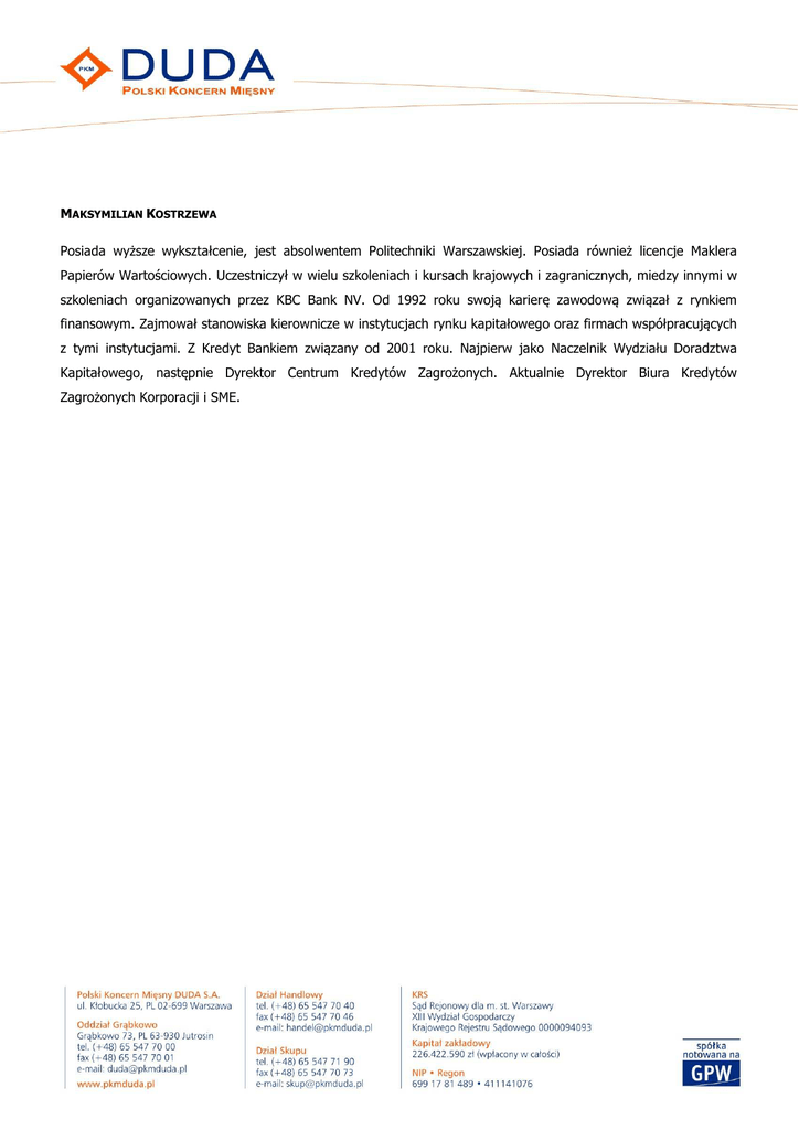 MAKSYMILIAN KOSTRZEWA Posiada wyższe wykształcenie, jest absolwentem Politechniki Warszawskiej. Posiada również licencje Maklera Papierów Wartościowych. Uczestniczył w wielu szkoleniach i kursach krajowych i zagranicznych, miedzy innymi w szkoleniach organizowanych przez KBC Bank NV. Od 1992 roku swoją karierę zawodową związał z rynkiem finansowym. Zajmował stanowiska kierownicze w instytucjach rynku kapitałowego oraz firmach współpracujących z tymi instytucjami. Z Kredyt Bankiem związany od 2001 roku. Najpierw jako Naczelnik Wydziału Doradztwa Kapitałowego, następnie Dyrektor Centrum Kredytów Zagrożonych. Aktualnie Dyrektor Biura Kredytów Zagrożonych Korporacji i SME.