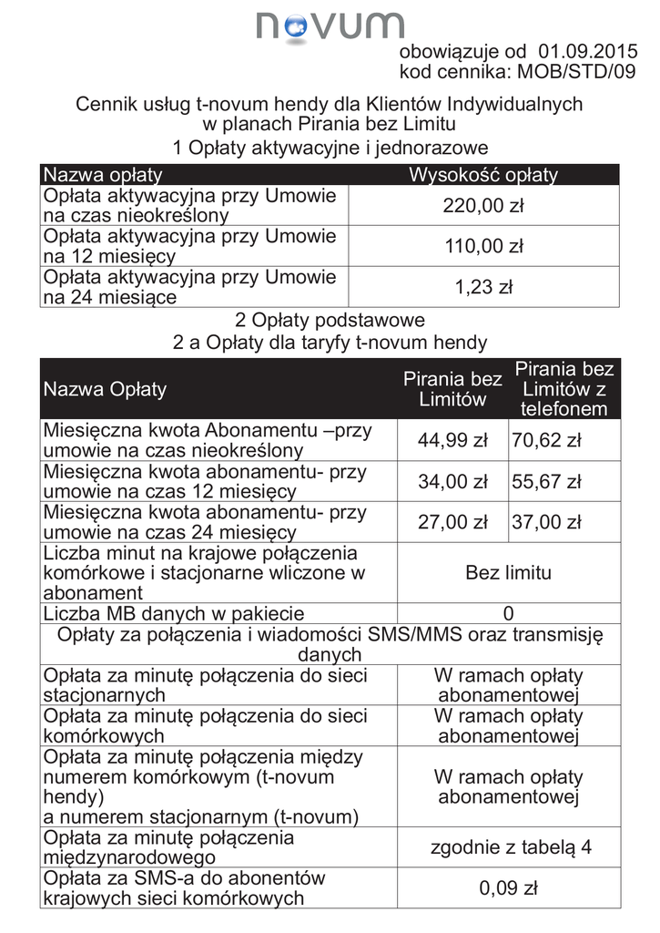 obowiązuje od 01.09.2015 kod cennika: MOB - t
