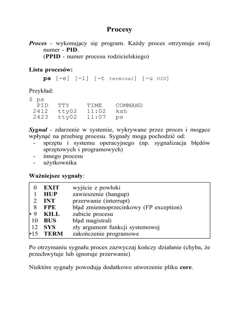 Procesy Proces - wykonuja˛cy sie˛ program. Każdy proces otrzymuje swój numer - PID. (PPID - numer procesu rodzicielskiego) Lista procesów: ps [-e] [-l] [-t terminal] [-u UID] Przykład: $ ps PID TTY 2412 tty02 2423 tty02 TIME 11:02 11:07 COMMAND ksh ps Sygnał - zdarzenie w systemie, wykrywane przez proces i moga˛ce wpłyna˛ć na przebieg procesu. Sygnały moga˛ pochodzić od: - sprze˛tu i systemu operacyjnego (np. sygnalizacja błe˛dów sprze˛towych i programowych) - innego procesu - użytkownika Ważniejsze sygnały: 0 1 2 8 •9 10 12 •15 EXIT HUP INT FPE KILL BUS SYS TERM wyjście z powłoki zawieszenie (hangup) przerwanie (interrupt) bła˛d zmiennoprzecinkowy (FP exception) zabicie procesu bła˛d magistrali zły argument funkcji systemowej zakończenie programowe Po otrzymaniu sygnału proces zazwyczaj kończy działanie (chyba, że przechwytuje lub ignoruje przerwanie) Niektóre sygnały powoduja˛ dodatkowo utworzenie pliku core. Wysłanie sygnału do procesu: kill [-sygnał] PID Przykłady: kill kill kill kill -9 2314 -SIGKILL 2314 2314 -TERM 2314 (sygnał KILL nie może zostać przechwycony) (sygnał TERM może zostać przechwycony) Określenie reakcji powłoki na sygnał trap [akcja] [sygnał ...] Przykłady trap "echo Sygnal nr 2" SIGINT trap ’rm /tmp/xxxx ; exit’ 15 trap "$HOME/.logout" EXIT Zadanie (job) powstaje w chwili rozpocze˛ cia wykonywania komendy lub potoku. Zadaniu przyporza˛ dkowywany jest numer zadania (mała liczba całkowita). Lista zadań jobs Przykłady: jobs [1] + Running [2] - Done lp results compile_big_prog& Uruchomienie zadania w tle: komenda ... & lub Ctrl-Z (zawieszenie zadania) bg (wznowienie zadania w tle) (powłoka w obu przypadkach poda numer zadania i numer procesu) Przeniesienie zadania z tła na pierwszy plan: fg %nr_zadania Zabicie zadania kill %nr_zadania Uzupełnienia • • • Użytkownik może narzucić ograniczenie na wielkość zapisanego obszaru na dysku dla procesów potomnych (ulimit) Zadania wykonywane sa˛ likwidowane w chwili zakończenia pracy powłoki macierzystej. Użytkownik może wydać polecenie kontynuowania zadania po komendzie logout uruchamiaja˛ c je po komendzie nohup komenda [argumenty] Urza˛ dzenia W systemie UNIX urza˛ dzenia sa˛ doste˛ pne jako pliki specjalne. Odwołanie do pliku specjalnego jest odsyłane do driver’a urza˛ dzenia (programu steruja˛ cego urza˛ dzeniem). Rodzaje urza˛ dzeń: • znakowe, niebuforowane - doste˛ p w sposób szeregowy, np. terminal, drukarka, nape˛ d taśmowy • blokowe, buforowane - doste˛ p swobodny, np. dysk Z jednym urza˛ dzeniem fizycznym może być zwia˛ zanych kilka plików specjalnych - pozwala to na doste˛ p do urza˛ dzenia na różne sposoby: blokowy i znakowy (raw). Pliki specjalne reprezentuja˛ ce urza˛ dzenia umieszczane sa˛ w podkatalogu /dev (lub jego podkatalogach), np. /dev/console /dev/tty01 /dev/tty /dev/lp /dev/null /dev/mem /dev/swap /dev/rmt0a /dev/fd0 /dev/rdsk/0s0 i-we˛ zeł pliku specjalnego zawiera informacje˛ o: • rodzaju urza˛ dzenia (blokowe, znakowe) • numerach: głównym (major) i podrze˛ dnym (minor) urza˛ dzenia Nr główny: określa driver urza˛ dzenia Nr podrze˛ dny: może określać: nr urza˛ dzenia (gdy jest ich kilka), parametr urza˛ dzenia (np. rodzaj dyskietki, ge˛ stość zapisu taśmy) Cze˛ sto nr podrze˛ dny jest zakodowany w nazwie pliku specjalnego i niesie dodatkowa˛ informacje˛ o urza˛ dzeniu, np. /dev/dsk/f05h (dyskietka 5 " 1.2MB, nape˛ d A:) /dev/dsk/f13ht (dyskietka 3 " 1.44MB, nape˛ d B:) /dev/dsk/f13d (dyskietka 3 " 720KB, nape˛ d B:) /dev/dsk/f0 (dyskietka A:) Przykład: cd /dev/rdsk crw-r----- 2 cd /dev/dsk brw-r----- 2 ; ls root ... 47,0x201600 ... c201d0s0 ; ls root ... 7,0x201000 ... c201d0s0 Uzupełnienia 1. Urza˛ dzenie blokowe powinno zostać sformatowane (komendy formatowania sa˛ zależne od implementacji systemu UNIX, np. format, fdformat) 2. Na urza˛ dzeniach typu pamie˛ ci masowych należy dodatkowo: • utworzyć system plików (np. komenda˛ /etc/mkfs /dev/pl_specj parametry ... • zamontować ten system plików komenda˛ : /etc/mount /dev/pl_specj /katalog 3. System plików na nośniku wymiennym (dyskietka, kaseta z taśma˛ ) winien zostać przed wyje˛ ciem z nape˛ du zdemontowany: /etc/umount /dev/pl_specj (inaczej nie da sie˛ go powtórnie zamontować bez czasochłonnego sprawdzenia spójności programem fsck)