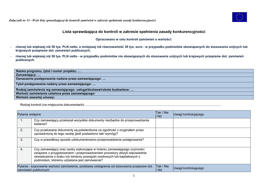 Załącznik nr 13 - Wzór listy sprawdzającej do kontroli zamówień w zakresie spełnienia zasady konkurencyjności Lista sprawdzająca do kontroli w zakresie spełnienia zasady konkurencyjności Opracowano w celu kontroli zamówień o wartości: − równej lub większej niż 50 tys. PLN netto, a mniejszej niż równowartość 30 tys. euro - w przypadku podmiotów obowiązanych do stosowania unijnych lub krajowych przepisów dot. zamówień publicznych; − równej lub większej niż 50 tys. PLN netto - w przypadku podmiotów nie obowiązanych do stosowania unijnych lub krajowych przepisów dot. zamówień publicznych. Nazwa programu, tytuł i numer projektu: … Zamawiający: … Oznaczenie postępowania nadane przez zamawiającego: … Tytuł postępowania nadany przez zamawiającego: … Rodzaj zamówienia wg zamawiającego: usługa/dostawa/robota budowlana: … Wartość zamówienia ustalona przez zamawiającego: Wartość zawartej umowy: Rodzaj kontroli (na miejscu/na dokumentach): ......................................................................................................................................................... Tak / Nie / Nd Uwagi kontrolującego Pytania - szacowanie wartości zamówienia, podstawa odstąpienia od stosowania przepisów dot. Tak / Nie zamówień publicznych / Nd Uwagi kontrolującego Pytania wstępne 1. Czy zamawiający przekazał wszystkie dokumenty niezbędne do przeprowadzenia badania? 2. Czy przekazane dokumenty są potwierdzone za zgodność z oryginałem przez upoważnioną do tego osobę (jeśli postawiono taki wymóg)? 3. Czy w prawidłowy sposób udokumentowano przeprowadzenie postępowania? 4. Czy zamawiający oraz osoby wykonujące w imieniu zamawiającego czynności związane z przygotowaniem i przeprowadzeniem procedury złożyli odpowiednie oświadczenia o braku lub istnieniu powiązań osobowych lub kapitałowych z podmiotem, któremu udzielane jest zamówienie? 1 Załącznik nr 13 - Wzór listy sprawdzającej do kontroli zamówień w zakresie spełnienia zasady konkurencyjności 5. Czy ustalenia wartości zamówienia dokonano w sposób prawidłowy, w tym czy nie zostało zaniżone poprzez jego podział celem ominięcia programowej zasady ofertowania, oraz czy zostało ono udokumentowane przez zamawiającego? 6. Czy udzielenia zamówienia dokonano w oparciu o prawidłową przesłankę zawartą w katalogu wyłączeń podmiotowych bądź przedmiotowych określonych w art. 3 i 4 12 ustawy Prawo Zamówień Publicznych ? Pytania - upublicznienie informacji o zamówieniu, zapytanie ofertowe 7. Tak / Nie / Nd Uwagi kontrolującego (czy zapytanie ofertowe zostało upublicznione na właściwym portalu albo na właściwych stronach internetowych i skierowane do prawidłowej liczby potencjalnych wykonawców) Czy zapytanie ofertowe zawiera wymagane informacje? (m.in. opis przedmiotu, kryteria oceny ofert, informację o sposobie oceny ofert, termin składania, informacje na temat zakresu wykluczenia, warunki zmian umowy, warunki udzielenia wykonawcy zamówień tego samego rodzaju) Czy termin składania ofert wyznaczono w sposób zgodny z procedurą? 9. Pytania - procedura wyłonienia wykonawcy, wybór oferty, zawarcie umowy z wykonawcą 1. Czy wszystkie rozpatrzone oferty wpłynęły w terminie wyznaczonym przez zamawiającego ? 2. Czy wyboru najkorzystniejszej oferty dokonano w sposób zgodny z kryteriami ustalonymi w zapytaniu ofertowym? 3. Czy zamówienie zostało udzielone podmiotowi nie powiązanemu z beneficjentem osobowo lub kapitałowo? 4. Czy wybór najkorzystniejszej oferty został udokumentowany pisemnym protokołem oraz czy dołączono do niego wymagane załączniki? 5. 2 Uwagi kontrolującego Czy zapewniony został odpowiedni dostęp do informacji dot. danego zamówienia? 8. 1 Tak / Nie / Nd Czy w prawidłowy sposób upubliczniono informację o wyniku postępowania? Dz. U. z 2013 r. poz. 907, z późn. zm. Z uwzględnieniem wyłączeń w zakresie obowiązku stosowania zasady programowej 2 Załącznik nr 13 - Wzór listy sprawdzającej do kontroli zamówień w zakresie spełnienia zasady konkurencyjności 6. 7. 8. 9. Czy zakres świadczenia w umowie jest zgodny z ofertą? Czy umowa/zmiana umowy została zawarta w formie pisemnej? Czy umowa/ zmiana umowy została zawarta przez osobę do tego umocowaną? Czy w przypadku zmiany umowy zamawiający przewidział możliwość dokonania takiej zmiany w zapytaniu ofertowym oraz określił warunki takiej zmiany? Podsumowanie Tak/Nie/Nd 1. Zamówienie zostało ocenione pozytywnie 2. W przypadku negatywnej oceny zamówienia - w konsekwencji wykrytych nieprawidłowości wymagane jest uznanie całości lub części wydatków za niekwalifikowalne Metoda ustalenia kwoty wydatków niekwalifikowalnych:……….. Kwota wydatków niekwalifikowalnych: ………….. Zweryfikował: Imię Nazwisko Data Podpis Sprawdził: Imię Nazwisko Data Podpis Zatwierdził: Imię Nazwisko Data Podpis 3