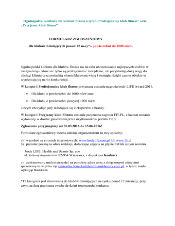 Ogólnopolski konkurs dla klubów fitness o tytuł „Profesjonalny klub fitness” oraz „Przyjazny klub fitness” FORMULARZ ZGŁOSZENIOWY dla klubów działających ponad 12 m-cy*o powierzchni do 1000 mkw. Ogólnopolski konkurs dla klubów fitness ma na celu uhonorowanie najlepszych klubów w naszym kraju, które nie tylko są profesjonalnie zarządzane, ale przykładają dużą wagę do obsługi klienta oraz posiadają własną klarowną wizję i strategię, dzięki czemu obiekty te wyróżniają się na tle konkurencji. W kategorii Profesjonalny klub fitness przyznana zostanie nagroda body LIFE Award 2014, Dla klubu o powierzchni do 1000 mkw oraz Dla klubu o powierzchni powyżej 1000 mkw o czym zdecyduje jury składające się z ekspertów z branży. W kategorii Przyjazny klub Fitness zostanie przyznana nagroda FIT.PL, a laureat zostanie wyłoniony w drodze głosowania przez użytkowników portalu Fit.pl Zgłoszenia przyjmujemy od 30.03.2016 do 15.06.2016! Formularz zgłoszeniowy można odesłać organizatorom na trzy sposoby: a) wypełnić na stronach internetowych: www.bodylife.com.pl lub www.fit.pl b) przesłać pocztą na adres redakcji, dołączając zdjęcia na płycie Cd lub innym nośniku body LIFE, Health and Beauty Sp. zoo ul. Królowej Marysieńki 9/10 02-954 Warszawa, z dopiskiem Konkurs c) zeskanowany mailem przesłać na poniższy adres wraz z dołączonymi zdjęciami spakowanymi w pliku zip [email protected], w tytule maila wpisując Konkurs *Ta kategoria jest skierowana do klubów działających na rynku ponad 12 miesięcy, przy czym za datę graniczną uważa się dzień rozpoczęcia konkursu Wymagane dane Opisy powinny być klarowne i konkretne, a dołączane zdjęcia w wysokiej rozdzielczości (300 DPI) UWAGA ! Tylko spośród klubów, które podadzą wszystkie informacje wymagane w zgłoszeniach, jury wyłoni kluby nominowane do poszczególnych kategorii. Nazwa klubu: Miejscowość: Data zgłoszenia: 1. Dokładna data otwarcia klubu: 2. Wielkość powierzchni: 3. Profil klubu - jaki? (typowy klub fitness, klub wellness, klub dla kobiet itp.) 4. Oferta klubu – opis a) zajęcia grupowe b) wyposażenie sprzęt siłowy sprzęt cardio c) dodatkowe usługi (jakie? np.: barek, masaże, sauna, basen itp.:) 5. Wystrój klubu - opis 6. Filozofia klubu - co odróżnia Państwa klub od konkurencji? 7. Liczba członków: 8. Struktura zatrudnienia, liczba pracowników: w tym a) kadra zarządzająca: b) instruktorzy/trenerzy: 9. Opis zespołu oraz kadry zarządzającej w telegraficznym skrócie - krótkie portrety 10. Szkolenie personelu – w zakresie obsługi klienta finansowane/współfinansowane przez klub w 2012 r. Tematyka i daty szkoleń, liczba uczestników. 11. Szkolenie instruktorów/trenerów w roku 2012 finansowane/współfinansowane przez klub. Tematyka i daty szkoleń, liczba uczestników 12. Sposób i częstotliwość komunikacji z klientem – opis 13. Specjalistyczne oprogramowanie komputerowe – czy klub używa specjalnego programu do obsługi klienta? Tak/Nie, Jakie? 14. Strategia promocyjna i marketingowa - opis 15. Największe atuty Państwa klubu – dlaczego Państwa klub zasługuje na nagrodę body LIFE Award 2016 i miano Profesjonalnego klubu fitness? 16. Dane adresowe Adres korespondencyjny klubu E- mailowy Strona www Dane do faktury: Nazwa firmy: Adres (ulica, kod pocztowy, miejscowość) : NIP: 17. Prosimy o dołączenie 5-7 zdjęć klubu oraz kadry w dobrej rozdzielczości 300 DPI (tif lub jpg) w formie ZIP (spakowane) 18. E-mail oraz telefon osoby wypełniającej zgłoszenie Oświadczam, że zapoznałem/łam się z regulaminem konkursu dla klubów fitness i akceptuję warunki konkursu Pieczątka Podpis Zgoda na otrzymywanie informacji handlowej droga elektroniczną: Wyrażam zgodę na przysyłanie mi przez spółkę Health and Beauty Media Sp. z o.o. z siedzibą w Warszawie (kod 02-954) przy ul. Królowej Marysieńki 9/10 na mój adres elektroniczny informacji handlowej Spółki Health and Beauty Media Sp. z o.o. w Warszawie i podmiotów z nią współpracujących oraz Fit.PL z siedzibą przy ul. Toruńskiej 9, 26-600 w Radomiu i podmiotów z nią współpracujących. Data Podpis Zgoda na przetwarzanie danych osobowych: Wyrażam zgodę na przetwarzanie przez spółkę Health and Beauty Media Sp. z o.o. z siedzibą w Warszawie (kod 02-954) przy ul. Królowej Marysieńki 9/10 moich danych osobowych w celach handlowych i marketingowych spółki Health and Beauty Media Sp. z o.o. w Warszawie oraz Fit.PL z siedzibą przy ul. Toruńskiej 9, 26-600 w Radomiu i podmiotów z nim współpracujących zgodnie z przepisami ustawy z dnia 29.08.1997 r. o ochronie danych osobowych (tj. DzU z 2002 r., nr 101, poz. 926 ze zm.). Mam świadomość dobrowolności podania danych osobowych oraz o przysługującym mi prawie dostępu do treści moich danych oraz ich poprawiania. Administratorem pobranych ode mnie danych osobowych jest spółka Health and Beauty Media Sp. z o.o. z siedzibą w Warszawie (kod 02-954) przy ul. Królowej Marysieńki 9/10. Data Podpis Organizatorami konkursu są: Health and Beauty Media Sp. z o.o. wydawca branżowego magazynu „body LIFE” z siedzibą na ul. Królowej Marysieńki 9/10, 02-954 Warszawa, Tel. +48 (22) 858 79 52, 858 79 54 - 55 oraz portal FIT.PL z siedzibą na ul. Toruńskiej 9, 26-600, Radom, tel. 48 362 8904, fax 48 331 72 30/