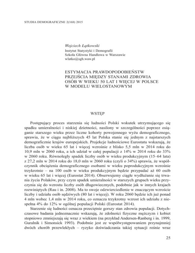 STUDIA DEMOGRAFICZNE 2(168) 2015 Wojciech Łątkowski Instytut Statystyki i Demografii Szkoła Główna Handlowa w Warszawie [email protected] ESTYMACJA PRAWDOPODOBIEŃSTW PRZEJŚCIA MIĘDZY STANAMI ZDROWIA OSÓB W WIEKU 50 LAT I WIĘCEJ W POLSCE W MODELU WIELOSTANOWYM WSTĘP Postępujący proces starzenia się ludności Polski wskutek utrzymującego się spadku umieralności i niskiej dzietności, nasilony w szczególności poprzez osiąganie starszego wieku przez liczne kohorty powojennego wyżu demograficznego, sprawia, że w ciągu najbliższych 45 lat Polska stanie się jednym z najstarszych demograficznie krajów europejskich. Projekcje ludnościowe Eurostatu wskazują, że liczba osób w wieku 65 lat i więcej wzrośnie z blisko 5,5 mln w 2014 roku do 10,9 mln w 2060 roku, a ich udział w całej populacji z 14% w 2014 roku do 33% w 2060 roku. Równoległy spadek liczby osób w wieku produkcyjnym (15–64 lata) z 27,2 mln w 2014 roku do 18,0 mln w 2060 roku (czyli o 34%) sprawia, że współczynnik obciążenia demograficznego osobami w wieku poprodukcyjnym wzrośnie trzykrotnie – na 100 osób w wieku produkcyjnym będzie przypadać aż 60 osób w wieku 65 lat i więcej (Eurostat 2014). Obserwujemy ciągłe wydłużanie się trwania życia Polaków, przy czym spadek umieralności w starszych grupach wieku przyczynia się do wzrostu liczby osób długowiecznych, podobnie jak w innych krajach rozwiniętych (Rau i in. 2008). Ma to swoje odzwierciedlenie w znaczącym wzroście liczby i udziału osób sędziwych (80 lat i więcej). W roku 2060 będzie ich już ponad 4 mln wobec 1,4 mln w 2014 roku, co oznacza trzykrotny wzrost ich udziału z niespełna 4% do 12% w ogólnej populacji Polski (Eurostat 2014). Starzenie się ludności oznacza przeciętnie gorszy stan zdrowia populacji. Dotychczasowe badania jednoznacznie wskazują, że zdolności fizyczne mężczyzn i kobiet stopniowo zmniejszają się wraz z wiekiem (na przykład Andersen-Ranberg i in. 1999, Guralnik i Simonsick 1993). Podobnie jest ze współwystępowaniem przynajmniej dwóch chorób przewlekłych – ryzyko doświadczania takiej sytuacji rośnie wraz 25 Wojciech Łątkowski z wiekiem (Salive 2013). W kontekście przewidywania stanu zdrowia populacji warto więcej uwagi poświęcić dyskusji o rozwoju zachorowalności osób starszych w przyszłości. Dotychczas główna oś sporu przebiega między hipotezą o kompresji zachorowalności (compression of morbidity), głoszącą o zmniejszaniu się liczby lat spędzanych w niepełnosprawności jako następstwie rektangularyzacji krzywej przeżycia (Fries 1980), a hipotezą o ekspansji zachorowalności (Olshansky i in. 1991). Zwolennicy hipotezy o ekspansji dostrzegają spadek umieralności z powodu chorób śmiertelnych w starszym wieku. Uważają jednak, że odbywa się to kosztem wydłużenia okresu spędzanego w złym zdrowiu z powodu utrzymywania się stopnia progresji chorób przewlekłych na tym samym poziomie. Dyskutowana jest jeszcze hipoteza dynamicznej równowagi, która sugeruje wzajemne znoszenie się efektów tych dwóch zjawisk, wskutek czego proporcja dodatkowych lat życia spędzonych w dobrym i złym zdrowiu pozostaje na tym samym poziomie (Manton 1982). Dotychczasowe badania empiryczne dostarczają niejednoznacznych argumentów. Na przykład Rosen i Haglund (2005) kwestionują hipotezę kompresji zachorowalności donosząc, że występowanie długotrwałych chorób wśród osób starszych w Szwecji wzrasta. Z drugiej strony, Schoeni i in. (2001) podają, że zakres niepełnosprawności wśród osób starszych w Stanach Zjednoczonych spada. Christensen i in. (2009) powołują się na dane z kilku ostatnich dekad dla Stanów Zjednoczonych, Japonii i Francji, które świadczą o spadku odsetka osób z ograniczeniami w życiu codziennym. Analiza danych ze spisów powszechnych dla Polski wskazuje natomiast na wzrost deklaracji o występowaniu niepełnosprawności wśród osób starszych w okresie 1978–2002 (Szukalski 2008). Proces starzenia się i związane z nim ryzyka zgonu i pogorszenia stanu zdrowia przebiega inaczej u kobiet i mężczyzn. W literaturze od dawna znany jest paradoks polegający na tym, że kobiety charakteryzują się dłuższym przeciętnym trwaniem życia od mężczyzn, ale dodatkowe lata, których dożywają, są relatywnie częściej przeżywane w gorszym zdrowiu (male-female health-survival paradox) (Verbrugge 1984, Newman i Brach 2001, Oksuzyan i in. 2009, Vaupel 2010). Przyczyny paradoksu nie są jednoznacznie zidentyfikowane, ale wśród potencjalnych wyjaśnień wskazuje się na czynniki biologiczne i behawioralne (Oksuzyan i in. 2008). W Polsce obserwuje się występowanie różnicy w długości przeciętnego trwania życia na korzyść kobiet, przy czym od początku lat dziewięćdziesiątych ubiegłego wieku luka ta zmniejsza się (Muszyńska 2011). Jednak patrząc na miarę Lat Przeżytych w Zdrowiu (Healthy Life Years – HLY), widać, że kobiety mniejszą część swego dłuższego życia przeżywają bez długotrwałego ograniczenia aktywności fizycznej. W Polsce w 2012 roku kobiety i mężczyźni w wieku 65 lat mogli oczekiwać, że odpowiednio 39% i 48% dalszych lat życia będzie wolne od opartego na samoocenie długotrwałego ograniczenia aktywności fizycznej (EHLEIS 2015). Celem artykułu jest analiza dynamiki stanu zdrowia osób w wieku 50 lat i więcej w Polsce, przy czym chodzi o sprawdzenie, jak kształtuje się ryzyko zmiany stanu zdrowia w zależności od wieku oraz jaki jest wpływ płci. Sformułowano zatem nastę26 Estymacja prawdopodobieństw przejścia między stanami zdrowia osób w wieku 50 lat… pujące hipotezy: 1) wraz z wiekiem ryzyko pogorszenia stanu zdrowia zwiększa się, natomiast prawdopodobieństwo poprawy stanu zdrowia maleje; 2) ryzyko pogorszenia stanu zdrowia wraz z wiekiem jest wyższe dla kobiet niż dla mężczyzn. Do przeprowadzenia analizy zastosowana będzie nieparametryczna metoda