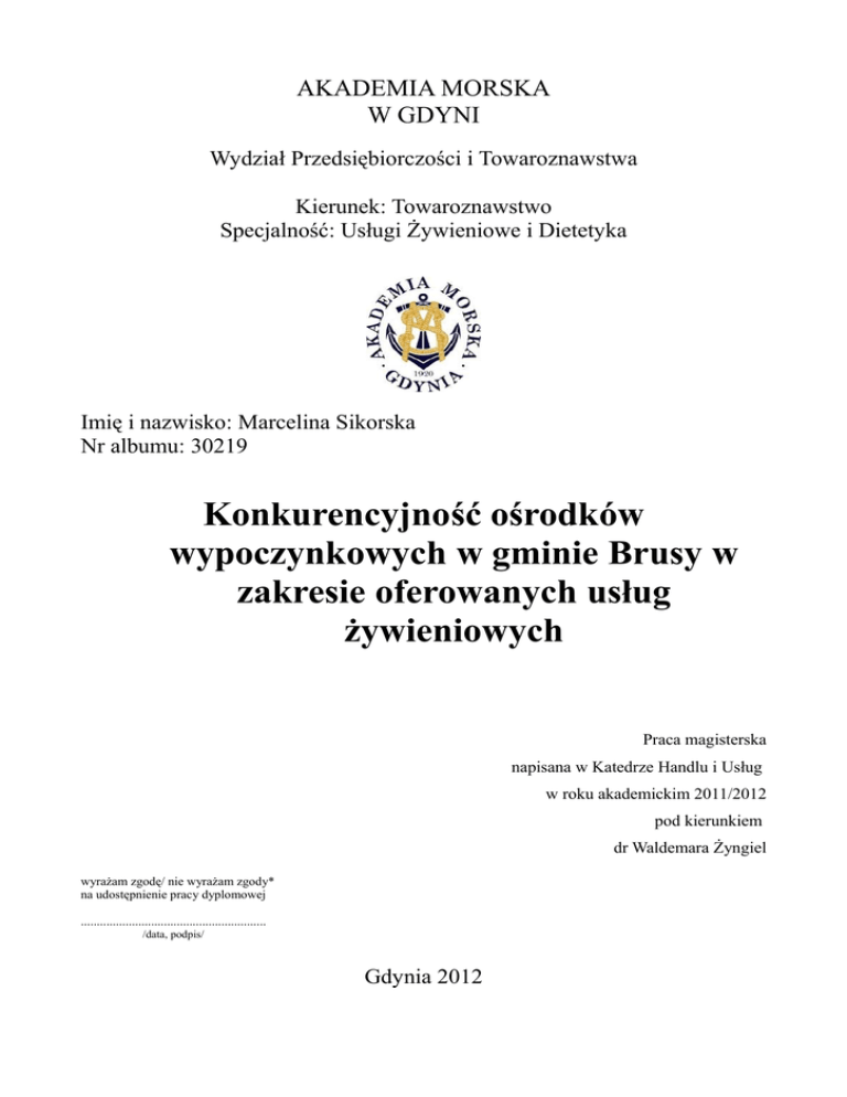 AKADEMIA MORSKA W GDYNI Wydział Przedsiębiorczości i Towaroznawstwa Kierunek: Towaroznawstwo Specjalność: Usługi Żywieniowe i Dietetyka Imię i nazwisko: Marcelina Sikorska Nr albumu: 30219 Konkurencyjność ośrodków wypoczynkowych w gminie Brusy w zakresie oferowanych usług żywieniowych Praca magisterska napisana w Katedrze Handlu i Usług w roku akademickim 2011/2012 pod kierunkiem dr Waldemara Żyngiel wyrażam zgodę/ nie wyrażam zgody* na udostępnienie pracy dyplomowej .......................................................... /data, podpis/ Gdynia 2012 1. WSTĘP W czasach gdzie ciągle brakuje czasu, a pieniądz nadaje rytm każdemu dniu ogromne znaczenie w życiu społeczeństwa ma gastronomia i celebrowanie wolnego czasu. Gastronomia to świadczenie nie tylko usług żywieniowych, ale zapewnienie rozrywki i stwarzanie atmosfery sprzyjającej rodzinnym i towarzyskim spotkaniom. Usługami o takim charakterze zajmuje się wiele placówek gastronomicznych. Gastronomia przynosi co raz większe dochody dla budżetu państwa i jest co raz większym determinantem w sektorze gospodarki. Ze wzrostem liczby placówek gastronomicznych wiąże się zwiększona konkurencja w tym zakresie, co zmusza przedsiębiorców do rozszerzania swojej oferty. Przedsiębiorcy starają się podnosić jakość oferowanych usług i sprostać wymaganiom co raz bardziej wymagających klientów. Właściciele placówek gastronomicznych aby przyciągnąć do swoich lokali jak największą rzesze klientów prześcigają się w tworzeniu wyszukanego menu, dodatkowych usług towarzyszących, profesjonalnej obsługi. Osiągnięcie jak najwyższej jakości nie jest sprawą prostą. Klient który nabywa daną usługę oczekuje pewnego standardu do którego jest przyzwyczajony lub oczekuje czegoś nowego, co zapewni mu pozytywne doznania. W związku z ciągle rosnącą konkurencją na rynku przedsiębiorcy muszą stale poszerzać swoją wiedze o zachowaniach i preferencjach potencjalnych klientów w zakresie proponowanych usług. Wiedza ta jest również potrzebna do ewentualnej poprawy jakości proponowanych usług. Również miejsce, otoczenie w jakim znajduje się dany lokal posiada duże znaczenie w wyborze danej placówki przez klienta. Ocena dokonywana przez nabywców jest najważniejszym kryterium mimo, że jest to ocena subiektywna. To od postawy klientów zależy czy zdecydują się skorzystać ponownie z oferowanej usługi. Konsumenci oceniają przede wszystkim jakość proponowanych usług i potraw, estetykę podania i wystroju wnętrz oraz otoczenie i okolicę w której znajduję się dany lokal. Analiza zagadnień związanych z konkurencyjnością przedsiębiorstw stanowi obecnie ważne zadanie, ale jednocześnie stanowi duże wyzwanie ze względu na złożoność pojęcia konkurencyjności oraz zróżnicowanie sposobów jej kreowania. Wyznacznikiem konkurencyjności może być aktualny rezultat lub możliwość efektywnych zmian w niedalekiej przyszłości. Do oceny satysfakcji klienta wykorzystuje się wiele metod pośrednich i bezpośrednich, które pozwalają na poznanie oceny konsumentów na temat oczekiwanych przez nich form jakości usług. 2. USŁUGI GASTRONOMICZNE JAKO ELEMENT W ROZWOJU GOSPODARKI 2.1. ROZWÓJ GASTRONOMII Rozwój gastronomii jest ściśle związany z ewolucją środków transportu i rozwojem gospodarki, które doprowadziły do powstania nowej gałęzi gospodarki. Początki gastronomii sięgają dwóch tysięcy lat, kiedy to rolnicy z Bliskiego Wschodu udawali się do miejscowości, w których był targ, aby tam sprzedać nadwyżki ziarna i inne produkty. Gastronomia to rodzaj działalności gospodarczej polegającej na świadczeniu usług żywieniowych. Inne znaczenie tego słowa definiuje gastronomię jako sztukę przyrządzania oraz podawania potraw na podstawie wiedzy kulinarnej. Przez ostatnie lata rynek gastronomiczny nie przynosił dużych dochodów, lecz stopniowo zauważa się wzrost popytu na usługi gastronomiczne. Wynika to z polepszenia warunków finansowych społeczeństwa, a także ze zwiększania się oferty gastronomicznej. Rozwój jaki obserwuje się w tej branży napawa optymizmem na przyszłość. Osoby zamierzające otworzyć własną restaurację czy kawiarnię mają wciąż szerokie pole do popisu. Dlatego też polski rynek gastronomiczny jest nadal dość mały w konfrontacji z gastronomią w krajach europejskich. Należy również wspomnieć, że rynek gastronomiczny jest jednym z najważniejszych alternatywnych kanałów sprzedaży produktów spożywczych. Właśnie producentom żywności zależy na rozwoju polskiej gastronomii, ponieważ liczą na zwiększenie sprzedaży swoich produktów. Polacy coraz częściej spożywają posiłki poza domem np. w restauracjach, barach itd., dlatego też powstaje coraz większa liczba lokali gastronomicznych dla przeciętnego „Kowalskiego”. Poza tym nowo powstałe lokale wypełniają niszę rynkową, który w Polsce odnosi się do nadal zbyt małej liczby placówek gastronomicznych. Największy wzrost obserwuje się w placówkach gastronomicznych należących do określonych sieci sprzedaży, które w określony sposób tworzą podobny standard menu oraz obsługi. Mimo wszystko rynek gastronomiczny jest nadal dość rozproszony, ponieważ tylko ok. 10% placówek gastronomicznych należy do sieci gastronomicznych. Zwyczaje społeczeństwa polskiego ulegają stopniowym zmianom i coraz częściej spożywa się posiłki poza domem. Automatycznie przekłada się to na wzrost przychodów placówek gastronomicznych, a co za tym idzie rozwój całego rynku gastronomicznego. Rynek gastronomiczny w Polsce bardzo dynamicznie się rozwija. Obecnie Polacy wydają tylko ok. 5% swojego budżetu na konsumpcję w placówkach gastronomicznych. Przewiduje się, że z roku na rok wydatki te będą wzrastać. Rozwojowi gastronomii sprzyja dobra koniunktura, wzrost stopnia zamożności i dochodów społeczeństwa oraz nasilen