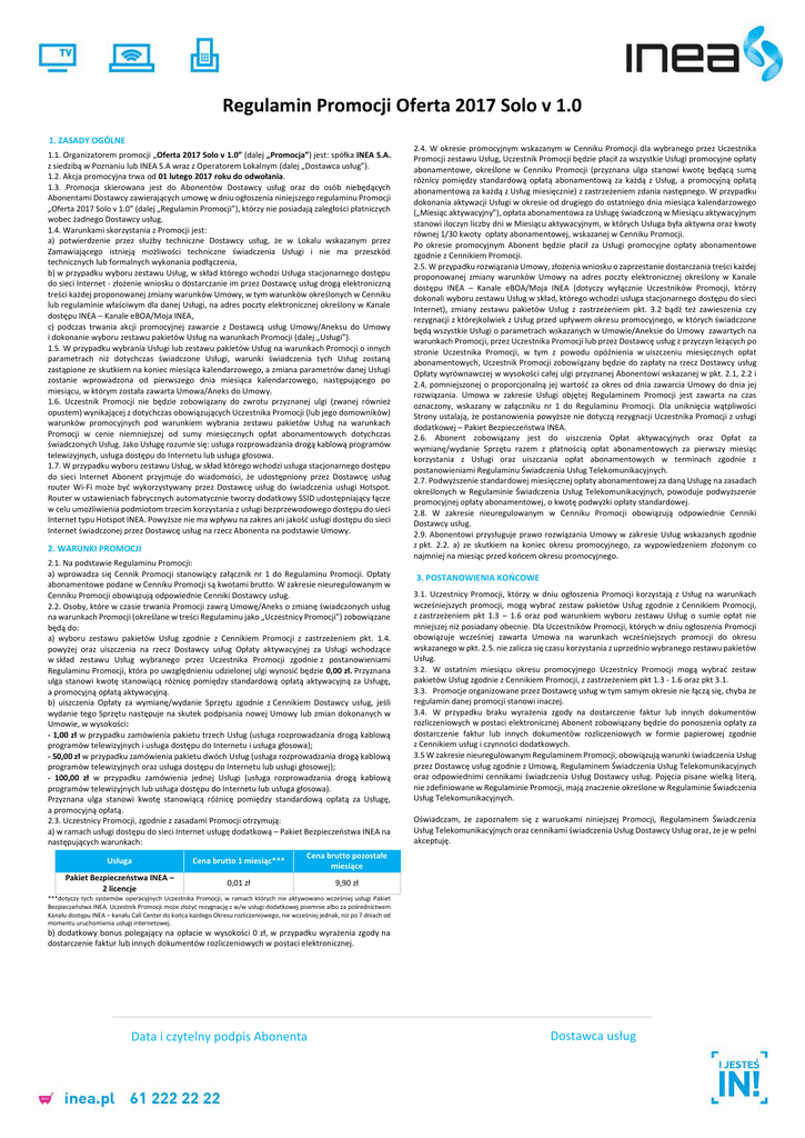 Regulamin Promocji Oferta 2017 Solo v 1.0 1. ZASADY OGÓLNE 1.1. Organizatorem promocji „Oferta 2017 Solo v 1.0” (dalej „Promocja”) jest: spółka INEA S.A. z siedzibą w Poznaniu lub INEA S.A wraz z Operatorem Lokalnym (dalej „Dostawca usług”). 1.2. Akcja promocyjna trwa od 01 lutego 2017 roku do odwołania. 1.3. Promocja skierowana jest do Abonentów Dostawcy usług oraz do osób niebędących Abonentami Dostawcy zawierających umowę w dniu ogłoszenia niniejszego regulaminu Promocji „Oferta 2017 Solo v 1.0” (dalej „Regulamin Promocji”), którzy nie posiadają zaległości płatniczych wobec żadnego Dostawcy usług. 1.4. Warunkami skorzystania z Promocji jest: a) potwierdzenie przez służby techniczne Dostawcy usług, że w Lokalu wskazanym przez Zamawiającego istnieją możliwości techniczne świadczenia Usługi i nie ma przeszkód technicznych lub formalnych wykonania podłączenia, b) w przypadku wyboru zestawu Usług, w skład którego wchodzi Usługa stacjonarnego dostępu do sieci Internet - złożenie wniosku o dostarczanie im przez Dostawcę usług drogą elektroniczną treści każdej proponowanej zmiany warunków Umowy, w tym warunków określonych w Cenniku lub regulaminie właściwym dla danej Usługi, na adres poczty elektronicznej określony w Kanale dostępu INEA – Kanale eBOA/Moja INEA, c) podczas trwania akcji promocyjnej zawarcie z Dostawcą usług Umowy/Aneksu do Umowy i dokonanie wyboru zestawu pakietów Usług na warunkach Promocji (dalej „Usługi”). 1.5. W przypadku wybrania Usługi lub zestawu pakietów Usług na warunkach Promocji o innych parametrach niż dotychczas świadczone Usługi, warunki świadczenia tych Usług zostaną zastąpione ze skutkiem na koniec miesiąca kalendarzowego, a zmiana parametrów danej Usługi zostanie wprowadzona od pierwszego dnia miesiąca kalendarzowego, następującego po miesiącu, w którym została zawarta Umowa/Aneks do Umowy. 1.6. Uczestnik Promocji nie będzie zobowiązany do zwrotu przyznanej ulgi (zwanej również opustem) wynikającej z dotychczas obowiązujących Uczestnika Promocji (lub jego domowników) warunków promocyjnych pod warunkiem wybrania zestawu pakietów Usług na warunkach Promocji w cenie niemniejszej od sumy miesięcznych opłat abonamentowych dotychczas świadczonych Usług. Jako Usługę rozumie się: usługa rozprowadzania drogą kablową programów telewizyjnych, usługa dostępu do Internetu lub usługa głosowa. 1.7. W przypadku wyboru zestawu Usług, w skład którego wchodzi usługa stacjonarnego dostępu do sieci Internet Abonent przyjmuje do wiadomości, że udostępniony przez Dostawcę usług router Wi-Fi może być wykorzystywany przez Dostawcę usług do świadczenia usługi Hotspot. Router w ustawieniach fabrycznych automatycznie tworzy dodatkowy SSID udostępniający łącze w celu umożliwienia podmiotom trzecim korzystania z usługi bezprzewodowego dostępu do sieci Internet typu Hotspot INEA. Powyższe nie ma wpływu na zakres ani jakość usługi dostępu do sieci Internet świadczonej przez Dostawcę usług na rzecz Abonenta na podstawie Umowy. 2. WARUNKI PROMOCJI 2.1. Na podstawie Regulaminu Promocji: a) wprowadza się Cennik Promocji stanowiący załącznik nr 1 do Regulaminu Promocji. Opłaty abonamentowe podane w Cenniku Promocji są kwotami brutto. W zakresie nieuregulowanym w Cenniku Promocji obowiązują odpowiednie Cenniki Dostawcy usług. 2.2. Osoby, które w czasie trwania Promocji zawrą Umowę/Aneks o zmianę świadczonych usług na warunkach Promocji (określane w treści Regulaminu jako „Uczestnicy Promocji”) zobowiązane będą do: a) wyboru zestawu pakietów Usług zgodnie z Cennikiem Promocji z zastrzeżeniem pkt. 1.4. powyżej oraz uiszczenia na rzecz Dostawcy usług Opłaty aktywacyjnej za Usługi wchodzące w skład zestawu Usług wybranego przez Uczestnika Promocji zgodnie z postanowieniami Regulaminu Promocji, która po uwzględnieniu udzielonej ulgi wynosić będzie 0,00 zł. Przyznana ulga stanowi kwotę stanowiącą różnicę pomiędzy standardową opłatą aktywacyjną za Usługę, a promocyjną opłatą aktywacyjną. b) uiszczenia Opłaty za wymianę/wydanie Sprzętu zgodnie z Cennikiem Dostawcy usług, jeśli wydanie tego Sprzętu następuje na skutek podpisania nowej Umowy lub zmian dokonanych w Umowie, w wysokości: - 1,00 zł w przypadku zamówienia pakietu trzech Usług (usługa rozprowadzania drogą kablową programów telewizyjnych i usługa dostępu do Internetu i usługa głosowa); - 50,00 zł w przypadku zamówienia pakietu dwóch Usług (usługa rozprowadzania drogą kablową programów telewizyjnych oraz usługa dostępu do Internetu lub usługi głosowej); - 100,00 zł w przypadku zamówienia jednej Usługi (usługa rozprowadzania drogą kablową programów telewizyjnych lub usługa dostępu do Internetu lub usługa głosowa). Przyznana ulga stanowi kwotę stanowiącą różnicę pomiędzy standardową opłatą za Usługę, a promocyjną opłatą. 2.3. Uczestnicy Promocji, zgodnie z zasadami Promocji otrzymują: a) w ramach usługi dostępu do sieci Internet usługę dodatkową – Pakiet Bezpieczeństwa INEA na następujących warunkach: Usługa Cena brutto 1 miesiąc*** Cena brutto pozostałe miesiące Pakiet Bezpieczeństwa INEA – 2 licencje 0,01 zł 9,90 zł 2.4. W okresie promocyjnym wskazanym w Cenniku Promocji dla wybranego przez Uczestnika Promocji zestawu Usług, Uczestnik Promocji będzie płacił za wszystkie Usługi promocyjne opłaty abonamentowe, określone w Cenniku Promocji (przyznana ulga stanowi kwotę będącą sumą różnicy pomiędzy standardową opłatą abonamentową za każdą z Usług, a promocyjną opłatą abonamentową za każdą z Usług miesięcznie) z zastrzeżeniem zdania następnego. W przypadku dokonania aktywacji Usługi w okresie od drugiego do ostatniego dnia miesiąca kalendarzowego („Miesiąc aktywacyjny”), opłata abonamentowa za Usługę świadczoną w Miesi