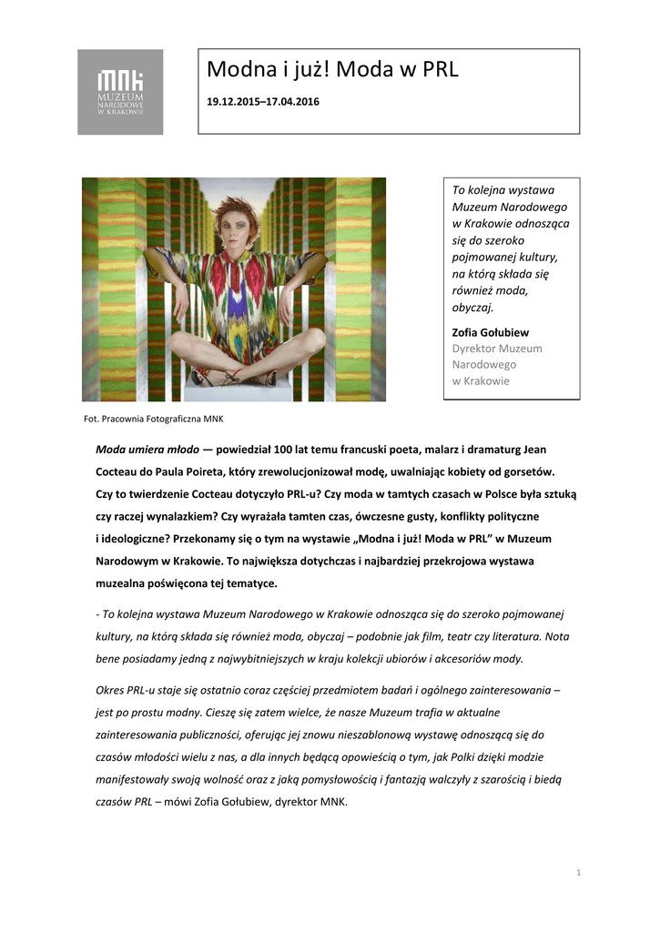 Modna i już! Moda w PRL - Muzeum Narodowe w Krakowie