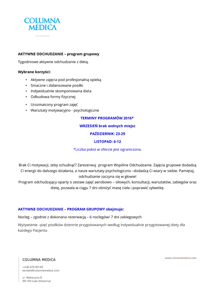 AKTYWNE ODCHUDZANIE – program grupowy Tygodniowe aktywne odchudzanie z dietą. Wybrane korzyści: • Aktywne zajęcia pod profesjonalną opieką • Smaczne i zbilansowane posiłki • Indywidualnie skomponowana dieta • Odbudowa formy fizycznej • Urozmaicony program zajęć • Warsztaty motywacyjno - psychologiczne TERMINY PROGRAMÓW 2016* WRZESIEŃ brak wolnych miejsc PAŹDZIERNIK: 23-29 LISTOPAD: 6-12 *Liczba pokoi w ofercie jest ograniczona. Brak Ci motywacji, żeby schudnąć? Zarezerwuj program Wspólne Odchudzanie. Zajęcia grupowe dodadzą Ci energii do dalszego działania, a nasze warsztaty psychologiczno –dodadzą Ci wiary w siebie. Pamiętaj, odchudzanie zaczyna się w głowie! Program odchudzający oparty o zestaw zajęć aerobowo – siłowych, konsultacji, warsztatów, zabiegów oraz dietę, pozwala w ciągu 7 dni obniżyć masę ciała i poprawić sylwetkę. AKTYWNE ODCHUDZANIE – PROGRAM GRUPOWY obejmuje: Nocleg – zgodnie z dokonana rezerwacją – 6 noclegów/ 7 dni zabiegowych Wyżywienie –pięć posiłków dziennie przygotowanych według indywidualnie przygotowanej diety dla każdego Pacjenta AKTYWNOŚĆ FIZYCZNA 1. Ćwiczenia spalające tkankę tłuszczową (30 min) – 3 x podczas pobytu. 2. Trening na rowerach spinningowych (fat burner) (40 min) – 3 x podczas pobytu. 3. Aqua-aerobik (50 min) – 3 x podczas pobytu. 4. Nordic Walking (40 min) – 3 x podczas pobytu. 5. Ćwiczenia poranne (30 min) – 3 x podczas pobytu. 6. Joga (90 min) – 1 x podczas pobytu. 7. Funkcjonalny trening medyczny pod opieką trenera personalnego (40 min) – 1 x podczas pobytu. 8. Funkcjonalny trening medyczny samodzielny – codziennie. DIETA 1. Pięć posiłków dziennie przygotowanych według indywidualnie przygotowanej diety dla każdego Pacjenta. Właściwie zbilansowana dieta, dopasowana do stylu życia, upodobań kulinarnych, ogólnej kondycji, chorób współistniejących oraz nawyków żywieniowych. 2. Woda z cytryną do pokoju – codziennie rano. 3. 1,5 litra wody mineralnej dziennie. KONSULTACJE 1. Specjalistyczna konsultacja lekarska – 1 x podczas pobytu. 2. Konsultacja dietetyczna wraz z analizą składu ciała i ustaleniem indywidualnej diety – 1 x podczas pobytu. 3. Konsultacja z fizjoterapeutą i trenerem personalnym – 1 x podczas pobytu. 4. Konsultacja kosmetologiczna lub podologiczna – 1 x podczas pobytu. DIAGNOSTYKA Test wydolnościowy – pozwala ocenić stopień wytrenowania Pacjenta oraz na uzyskać informację, jak efektywnie spalić tkankę tłuszczową podczas treningu. WARSZTATY Warsztaty z dietetykiem – 2 x podczas pobytu Warsztaty z psychologiem – 3 x podczas pobytu ZABIEGI KOSMETYCZNE WSPOMAGAJĄCE ODCHUDZANIE Peeling ciała – 1 x podczas pobytu ZABIEGI RELAKSACYJNE Masaż suchy na łóżku wodnym(30 min) – 3 x podczas pobytu. Każdy pacjent na turnusie odchudzającym otrzymuje rabaty na zabiegi wspomagające odchudzanie.