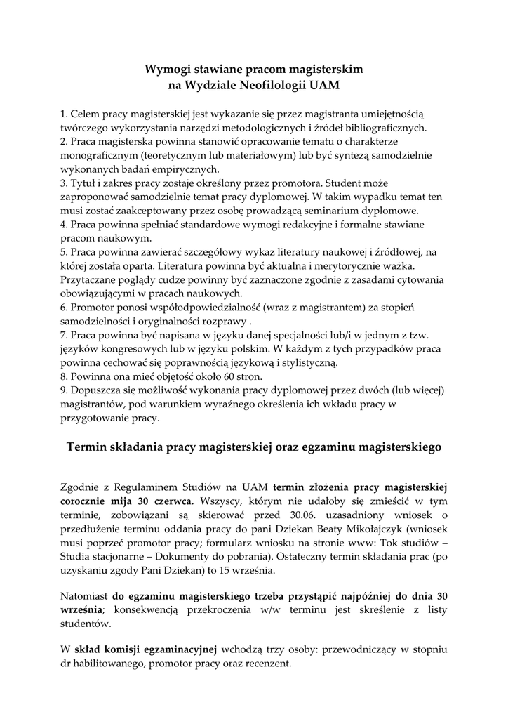 Wymogi stawiane pracom magisterskim na Wydziale Neofilologii UAM 1. Celem pracy magisterskiej jest wykazanie się przez magistranta umiejętnością twórczego wykorzystania narzędzi metodologicznych i źródeł bibliograficznych. 2. Praca magisterska powinna stanowić opracowanie tematu o charakterze monograficznym (teoretycznym lub materiałowym) lub być syntezą samodzielnie wykonanych badań empirycznych. 3. Tytuł i zakres pracy zostaje określony przez promotora. Student może zaproponować samodzielnie temat pracy dyplomowej. W takim wypadku temat ten musi zostać zaakceptowany przez osobę prowadzącą seminarium dyplomowe. 4. Praca powinna spełniać standardowe wymogi redakcyjne i formalne stawiane pracom naukowym. 5. Praca powinna zawierać szczegółowy wykaz literatury naukowej i źródłowej, na której została oparta. Literatura powinna być aktualna i merytorycznie ważka. Przytaczane poglądy cudze powinny być zaznaczone zgodnie z zasadami cytowania obowiązującymi w pracach naukowych. 6. Promotor ponosi współodpowiedzialność (wraz z magistrantem) za stopień samodzielności i oryginalności rozprawy . 7. Praca powinna być napisana w języku danej specjalności lub/i w jednym z tzw. języków kongresowych lub w języku polskim. W każdym z tych przypadków praca powinna cechować się poprawnością językową i stylistyczną. 8. Powinna ona mieć objętość około 60 stron. 9. Dopuszcza się możliwość wykonania pracy dyplomowej przez dwóch (lub więcej) magistrantów, pod warunkiem wyraźnego określenia ich wkładu pracy w przygotowanie pracy. Termin składania pracy magisterskiej oraz egzaminu magisterskiego Zgodnie z Regulaminem Studiów na UAM termin złożenia pracy magisterskiej corocznie mija 30 czerwca. Wszyscy, którym nie udałoby się zmieścić w tym terminie, zobowiązani są skierować przed 30.06. uzasadniony wniosek o przedłużenie terminu oddania pracy do pani Dziekan Beaty Mikołajczyk (wniosek musi poprzeć promotor pracy; formularz wniosku na stronie www: Tok studiów – Studia stacjonarne – Dokumenty do pobrania). Ostateczny termin składania prac (po uzyskaniu zgody Pani Dziekan) to 15 września. Natomiast do egzaminu magisterskiego trzeba przystąpić najpóźniej do dnia 30 września; konsekwencją przekroczenia w/w terminu jest skreślenie z listy studentów. W skład komisji egzaminacyjnej wchodzą trzy osoby: przewodniczący w stopniu dr habilitowanego, promotor pracy oraz recenzent.