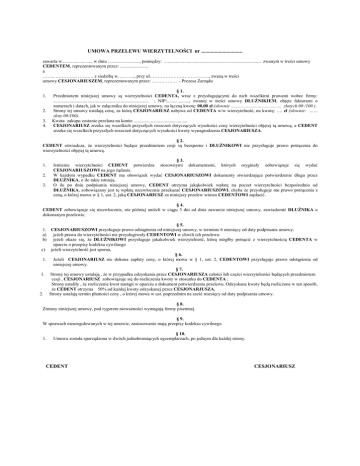 UMOWA PRZELEWU WIERZYTELNOŚCI nr ............................... zawarta w........................., w dniu ..........................., pomiędzy: .................................................................................. zwanym w treści umowy CEDENTEM, reprezentowanym przez: ........................ a …….. ………….. ………. z siedzibą w……….., przy ul…………………. , ………….., zwaną w treści umowy CESJONARIUSZEM, reprezentowanym przez: ……………. - Prezesa Zarządu 1. 2. 3. 4. § 1. Przedmiotem niniejszej umowy są wierzytelności CEDENTA, wraz z przysługującymi do nich wszelkimi prawami wobec firmy: ................................................................................. : NIP:..................., zwanej w treści umowy DŁUśNIKIEM, objęte fakturami o numerach i datach, jak w załączniku do niniejszej umowy, na łączną kwotę: 00,00 zł (słownie ........................................... złotych 00 /100 ). Strony tej umowy ustalają cenę, za którą CESJONARIUSZ nabywa od CEDENTA w/w wierzytelność, na kwotę: …. zł (słownie: …… złoty 00/100). Kwota zakupu zostanie przelana na konto: ............................................. CESJONARIUSZ zrzeka się wszelkich przyszłych roszczeń dotyczących wysokości ceny wierzytelności objętej tą umową, a CEDENT zrzeka się wszelkich przyszłych roszczeń dotyczących wysokości kwoty wynagrodzenia CESJONARIUSZA. § 2. CEDENT oświadcza, Ŝe wierzytelności będące przedmiotem cesji są bezsporne i DŁUśNIKOWI nie przysługuje prawo potrącenia do wierzytelności objętej tą umową. 1. 2. 3. § 3. Istnienie wierzytelności CEDENT potwierdza stosownymi dokumentami, których oryginały zobowiązuje się wydać CESJONARIUSZOWI na jego Ŝądanie. W kaŜdym wypadku CEDENT ma obowiązek wydać CESJONARIUSZOWI dokumenty stwierdzające potwierdzenie długu przez DŁUśNIKA, o ile takie istnieją. O ile po dniu podpisania niniejszej umowy, CEDENT otrzyma jakąkolwiek wpłatę na poczet wierzytelności bezpośrednio od DŁUśNIKA, zobowiązany jest tę wpłatę niezwłocznie przekazać CESJONARIUSZOWI, chyba Ŝe przysługuje mu prawo potrącenia z ceną, o której mowa w § 1, ust. 2, jaką CESJONARIUSZ za niniejszy przelew winien CEDENTOWI zapłacić. § 4. CEDENT zobowiązuje się niezwłocznie, nie później aniŜeli w ciągu 3 dni od dnia zawarcia niniejszej umowy, zawiadomić DŁUśNIKA o dokonanym przelewie. § 5. 1. CESJONARIUSZOWI przysługuje prawo odstąpienia od niniejszej umowy, w terminie 6 miesięcy od daty podpisania umowy: a) jeŜeli prawa do wierzytelności nie przysługiwały CEDENTOWI w chwili ich przelewu b) jeŜeli okaŜe się, Ŝe DŁUśNIKOWI przysługuje jakakolwiek wierzytelność, którą mógłby potrącić z wierzytelnością CEDENTA w oparciu o przepisy kodeksu cywilnego c) jeŜeli wierzytelność jest sporna, § 6. 1. JeŜeli CESJONARIUSZ nie dokona zapłaty ceny, o której mowa w § 1, ust. 2, CEDENTOWI przysługuje prawo odstąpienia od niniejszej umowy. § 7. 1. Strony tej umowy ustalają , Ŝe w przypadku odzyskania przez CESJONARIUSZA całości lub części wierzytelności będących przedmiotem cesji , CESJONARIUSZ zobowiązuje się do rozliczenia kwoty w stosunku do CEDENTA . Strony ustaliły , Ŝe rozliczenie kwot nastąpi w oparciu o dokument potwierdzenia przelewu. Odzyskane kwoty będą rozliczone w ten sposób, Ŝe CEDENT otrzyma 50% od kaŜdej kwoty odzyskanej przez CESJONARJUSZA. 2. Strony ustalają termin płatności ceny , o której mowa w ust. poprzednim na sześć miesięcy od daty podpisania umowy. § 8. Zmiany niniejszej umowy, pod rygorem niewaŜności wymagają formy pisemnej. § 9. W sprawach nieuregulowanych w tej umowie, zastosowanie mają przepisy kodeksu cywilnego. 1. § 10. Umowa została sporządzona w dwóch jednobrzmiących egzemplarzach, po jednym dla kaŜdej strony. CEDENT CESJONARIUSZ
