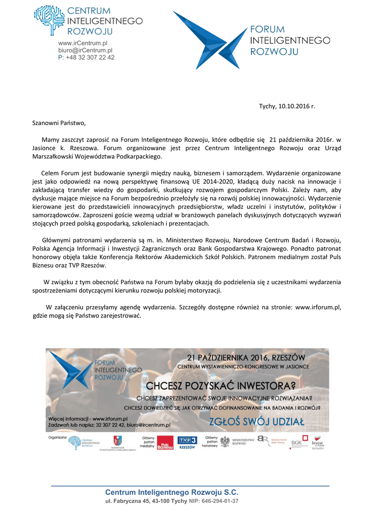 www.irCentrum.pl [email protected] P: +48 32 307 22 42 Tychy, 10.10.2016 r. Szanowni Państwo, Mamy zaszczyt zaprosić na Forum Inteligentnego Rozwoju, które odbędzie się 21 października 2016r. w Jasionce k. Rzeszowa. Forum organizowane jest przez Centrum Inteligentnego Rozwoju oraz Urząd Marszałkowski Województwa Podkarpackiego. Celem Forum jest budowanie synergii między nauką, biznesem i samorządem. Wydarzenie organizowane jest jako odpowiedź na nową perspektywę finansową UE 2014-2020, kładącą duży nacisk na innowacje i zakładającą transfer wiedzy do gospodarki, skutkujący rozwojem gospodarczym Polski. Zależy nam, aby dyskusje mające miejsce na Forum bezpośrednio przełożyły się na rozwój polskiej innowacyjności. Wydarzenie kierowane jest do przedstawicieli innowacyjnych przedsiębiorstw, władz uczelni i instytutów, polityków i samorządowców. Zaproszeni goście wezmą udział w branżowych panelach dyskusyjnych dotyczących wyzwań stojących przed polską gospodarką, szkoleniach i prezentacjach. Głównymi patronami wydarzenia są m. in. Ministerstwo Rozwoju, Narodowe Centrum Badań i Rozwoju, Polska Agencja Informacji i Inwestycji Zagranicznych oraz Bank Gospodarstwa Krajowego. Ponadto patronat honorowy objęła także Konferencja Rektorów Akademickich Szkół Polskich. Patronem medialnym został Puls Biznesu oraz TVP Rzeszów. W związku z tym obecność Państwa na Forum byłaby okazją do podzielenia się z uczestnikami wydarzenia spostrzeżeniami dotyczącymi kierunku rozwoju polskiej motoryzacji. W załączeniu przesyłamy agendę wydarzenia. Szczegóły dostępne również na stronie: www.irforum.pl, gdzie mogą się Państwo zarejestrować. ___________________________________________________________________ Centrum Inteligentnego Rozwoju S.C. ul. Fabryczna 45, 43-100 Tychy NIP: 646-294-01-37