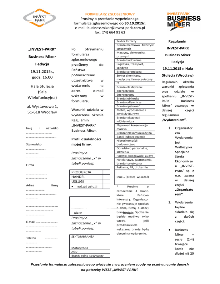 FORMULARZ ZGŁOSZENIOWY Prosimy o przesłanie wypełnionego formularza zgłoszeniowego do 30.10.2015r.: e-mail: [email protected] fax: (74) 664 91 62 „INVEST-PARK” Business Mixer I edycja 19.11.2015r., godz. 16.00 Hala Stulecia (Sala Wielofunkcyjna) ul. Wystawowa 1, 51-618 Wrocław Imię i nazwisko ……………………….….. ………………………….…….. Stanowisko …………………….. ……………. ………………………………. Firma …………………………….. ………………….….. ……………………… Adres firmy ……………………. ……………..…………………. …………… ………………………………….. .......…………..…………. …………………… E-mail ……………………….. …………………………………. ………………. Telefon …………….. ………….. ……………………………. ………………… Po otrzymaniu formularza zgłoszeniowego prześlemy do Państwa potwierdzenie uczestnictwa w wydarzeniu na adres e-mail wskazany w formularzu. Warunki udziału w wydarzeniu określa Regulamin „INVEST-PARK” Business Mixer. Profil działalności mojej firmy. Prosimy o zaznaczenie „x” w tabeli poniżej: PRODUKCJA HANDEL USŁUGI rodzaj usługi ..…………… data Prosimy o zaznaczenie „x” w tabeli poniżej: SEKTOR/BRANŻA Motoryzacja AGD Branża rolno-spożywczy Sektor lotniczy Branża metalowa i tworzyw sztucznych Maszyny, elektronika, przemysł Branża budowlana Logistyka, transport, spedycja Branża ceramiczna Sektor chemiczny, medyczny, farmaceutyczny IT Branża elektryczna i energetyczna Energetyczny Branża jubilerska Branża odlewnicza Branża opakowań Meble, wyposażenie i artykuły biurowe Branża tekstylna i włókiennicza Naprawa i konserwacja maszyn Branża telekomunikacyjna Banki i ubezpieczenia Nieruchomości i budownictwo Doradztwo personalne, szkolenia Podatki, księgowość, audyt Hotelarstwo, gastronomia, branża turystyczna Reklama, PR, drukarnie Regulamin INVEST-PARK Business Mixer I edycja 19.11.2015 r. Hala Stulecia (Wrocław) Regulamin określa warunki zgłoszenia oraz udziału w spotkaniu „INVESTPARK Business Mixer” zwanego w dalszej części regulaminu „Wydarzeniem”. 1. Organizator em Wydarzenia jest Wałbrzyska Specjalna Strefa Ekonomiczn a „INVESTPARK” sp. z o.o. zwana w dalszej części „Organizato rem”. Inne… (proszę wskazać) * Prosimy o zaznaczenie 4 branż, które Państwa interesują. Organizator nie gwarantuje spotkań z daną firmą z danej ….……………………………….. branży. podpis Spotkanie będzie możliwe tylko wtedy, jeśli przedstawiciele wskazanej branży będą obecni na wydarzeniu. 2. Wydarzenie będzie składało się z dwóch części: Business Mixer – sesje (2-4) trwające każda nie dłużej niż 20 Przesłanie formularza zgłoszeniowego wiąże się z wyrażeniem zgody na przetwarzanie danych na potrzeby WSSE „INVEST-PARK”. FORMULARZ ZGŁOSZENIOWY Prosimy o przesłanie wypełnionego formularza zgłoszeniowego do 30.10.2015r.: e-mail: [email protected] fax: (74) 664 91 62 minut; goście zajmują wskazane przez Organizator a miejsca przy kilkuosobow ych stolikach (do 10 osób), gdzie każda z osób dysponuje czasem max. 2 minut na prezentację swojej firmy, po zakończonej sesji uczestnicy przesiadają się do innych stolików wskazanych przez Organizator a, Business Networking – czas na nawiązanie dodatkowyc h kontaktów oraz dalsze rozmowy z poznanymi osobami, tej części będzie towarzyszył poczęstunek . 3. t firmy (za wyjątkiem sponsorów Wydarzenia) , o ile Organizator nie postanowi inaczej. cych firmę spoza strefy biorących udział tylko w Business Networking u – 100 zł netto za 1 osobę. 6. W Business Networking u udział wziąć może od 2 do 3 przedstawici eli każdej firmy. 7. Koszt udziału: dla przedsiębior ców strefowych biorących udział w Wydarzeniu – bezpłatnie, Dane do przelewu wysłane zostaną po wypełnieniu formularza oraz pozytywnej weryfikacji zgłoszenia, nie później niż do 5 listopada 2015 r. na kontaktowy adres e-mail podany w zgłoszeniu. Program Wydarzenia jest zawarty w zaproszeniu. 4. Aby wziąć udział w Wydarzeniu, należy zgłosić swój udział poprzez przesłanie wypełnione go formularza zgłoszeniow ego (załączony do zaproszenia lub dostępny na stronie www.investpark.com.pl w zakładce „BUSINESS MIXER”) na adres businessmix [email protected] do dnia 30.10.2015 r. 5. W Business Mixerze udział wziąć może tylko jeden reprezentan 8. dla osób reprezentują cych firmę spoza strefy biorących udział w pierwszej części Wydarzenia – Business Mixer (tylko 1 osoba) – bezpłatnie, Ze względu na ograniczoną liczbę miejsc, liczy się kolejność zgłoszeń. 9. Osoby niezarejestr owane, nie będą mogły wziąć udziału w Wydarzeniu. dla osób reprezentują 10. Organizator zastrzega Przesłanie formularza zgłoszeniowego wiąże się z wyrażeniem zgody na przetwarzanie danych na potrzeby WSSE „INVEST-PARK”. FORMULARZ ZGŁOSZENIOWY Prosimy o przesłanie wypełnionego formularza zgłoszeniowego do 30.10.2015r.: e-mail: [email protected] fax: (74) 664 91 62 sobie prawo do ograniczeni a liczby uczestników Wydarzenia - do 30% wszystkich uczestników Wydarzenia stanowić mogą przedstawici ele firm usługowych i 70% przedstawici ele firm produkcyjny ch. 11. Podczas wydarzenia Organizator będzie zbierał wizytówki. Przekazanie wizytówki Organizator owi oznacza zgodę na przekazanie kontaktu innym uczestnikom Wydarzenia. 12. Istnieje możliwość ustawienia podczas Wydarzenia przez każdą firmę, której przedstawici ele biorą w nim udział, 1 roll-upu w miejscu wskazanym przez Organizator a. ..…………… data ….…………………….. podpis 13. Wydarzenie prowadzone będzie w języku polskim. Przesłanie formularza zgłoszeniowego wiąże się z wyrażeniem zgody na