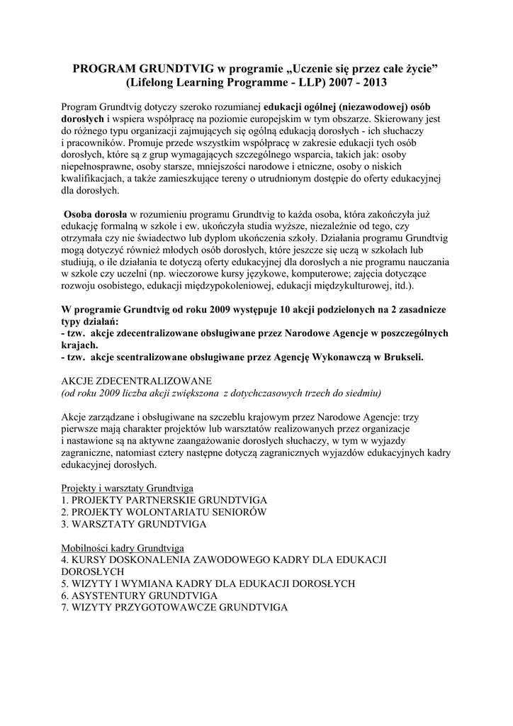 PROGRAM GRUNDTVIG w programie „Uczenie się przez całe życie” (Lifelong Learning Programme - LLP) 2007 - 2013 Program Grundtvig dotyczy szeroko rozumianej edukacji ogólnej (niezawodowej) osób dorosłych i wspiera współpracę na poziomie europejskim w tym obszarze. Skierowany jest do różnego typu organizacji zajmujących się ogólną edukacją dorosłych - ich słuchaczy i pracowników. Promuje przede wszystkim współpracę w zakresie edukacji tych osób dorosłych, które są z grup wymagających szczególnego wsparcia, takich jak: osoby niepełnosprawne, osoby starsze, mniejszości narodowe i etniczne, osoby o niskich kwalifikacjach, a także zamieszkujące tereny o utrudnionym dostępie do oferty edukacyjnej dla dorosłych. Osoba dorosła w rozumieniu programu Grundtvig to każda osoba, która zakończyła już edukację formalną w szkole i ew. ukończyła studia wyższe, niezależnie od tego, czy otrzymała czy nie świadectwo lub dyplom ukończenia szkoły. Działania programu Grundtvig mogą dotyczyć również młodych osób dorosłych, które jeszcze się uczą w szkołach lub studiują, o ile działania te dotyczą oferty edukacyjnej dla dorosłych a nie programu nauczania w szkole czy uczelni (np. wieczorowe kursy językowe, komputerowe; zajęcia dotyczące rozwoju osobistego, edukacji międzypokoleniowej, edukacji międzykulturowej, itd.). W programie Grundtvig od roku 2009 występuje 10 akcji podzielonych na 2 zasadnicze typy działań: - tzw. akcje zdecentralizowane obsługiwane przez Narodowe Agencje w poszczególnych krajach. - tzw. akcje scentralizowane obsługiwane przez Agencję Wykonawczą w Brukseli. AKCJE ZDECENTRALIZOWANE (od roku 2009 liczba akcji zwiększona z dotychczasowych trzech do siedmiu) Akcje zarządzane i obsługiwane na szczeblu krajowym przez Narodowe Agencje: trzy pierwsze mają charakter projektów lub warsztatów realizowanych przez organizacje i nastawione są na aktywne zaangażowanie dorosłych słuchaczy, w tym w wyjazdy zagraniczne, natomiast cztery następne dotyczą zagranicznych wyjazdów edukacyjnych kadry edukacyjnej dorosłych. Projekty i warsztaty Grundtviga 1. PROJEKTY PARTNERSKIE GRUNDTVIGA 2. PROJEKTY WOLONTARIATU SENIORÓW 3. WARSZTATY GRUNDTVIGA Mobilności kadry Grundtviga 4. KURSY DOSKONALENIA ZAWODOWEGO KADRY DLA EDUKACJI DOROSŁYCH 5. WIZYTY I WYMIANA KADRY DLA EDUKACJI DOROSŁYCH 6. ASYSTENTURY GRUNDTVIGA 7. WIZYTY PRZYGOTOWAWCZE GRUNDTVIGA AKCJE SCENTRALIZOWANE Akcje zarządzane przez Agencję Wykonawczą w Brukseli (Executive Agency) działającą przy Komisji Europejskiej. 8. PROJEKTY WIELOSTRONNE - Multilateral Projects 9. SIECI GRUNDTVIGA - Grundtvig Networks 10. DZIAŁANIA TOWARZYSZĄCE - Accompanying Measures Kto może korzystać z programu: • • • • • • • • dorośli słuchacze (osoby dorosłe uczące się) za pośrednictwem organizacji prowadzących edukację dorosłych; organizacje oferujące możliwości edukacji dorosłych oraz kadra tych organizacji; organizacje non-profit, organizacje wolontariackie i pozarządowe (NGOs) prowadzące edukację dorosłych; placówki zajmujące się kształceniem lub doskonaleniem kadry edukacji dorosłych; podmioty świadczące usługi doradztwa zawodowego i poradnictwa oraz usługi informacyjne dotyczące dowolnych aspektów edukacji dorosłych; osoby i podmioty odpowiedzialne za systemy i strategie dotyczące dowolnych aspektów edukacji dorosłych na poziomie lokalnym, regionalnym i krajowym; stowarzyszenia i przedstawiciele osób związanych z edukacją dorosłych, w tym stowarzyszenia osób uczących się i nauczycieli/edukatorów dorosłych; ośrodki badawcze, szkoły wyższe, przedsiębiorstwa i inne podmioty zajmujące się kwestiami edukacji dorosłych. Prosimy również o zapoznanie się z odpowiedziami na najczęściej zadawane pytania (szczególnie pyt. nr 1 i 2). Główne cele programu Grundtvig: • • odpowiadanie na wyzwania edukacyjne związane ze starzeniem się populacji w Europie pomoc w zapewnianiu osobom dorosłym ścieżek poprawy ich wiedzy i kompetencji Cele operacyjne programu Grundtvig: • • • • poprawa pod względem jakościowym i ilościowym oraz pod względem dostępności ogólnoeuropejskiej mobilności osób biorących udział w edukacji dorosłych, tak by wesprzeć mobilność co najmniej 7000 tych osób rocznie do końca 2013 r. poprawa pod względem jakościowym i ilościowym współpracy pomiędzy organizacjami zajmującymi się edukacją dorosłych w Europie zapewnienie alternatywnych możliwości dostępu do edukacji dorosłych osobom z grup wymagających szczególnego wsparcia oraz z defaworyzowanych grup społecznych, w szczególności osobom starszym oraz osobom, które zaniechały kształcenia bez osiągnięcia podstawowych kwalifikacji ułatwienie rozwoju innowacyjnych praktyk w dziedzinie edukacji dorosłych, a także ich transferu, w tym z kraju uczestniczącego do innych krajów • • wspieranie tworzenia innowacyjnych i opartych na TIK (technologie informacyjnokomunikacyjne) treści, usług, metodologii nauczania oraz praktyk w zakresie uczenia się przez całe życie poprawa metod dydaktycznych oraz zarządzania organizacjami edukacji dorosłych. Kraje uprawnione w programie: 27 krajów UE: Austria, Belgia, Bułgaria, Cypr, Czechy, Dania, Estonia, Finlandia, Francja, Grecja, Hiszpania, Holandia, Irlandia, Litwa, Luksemburg, Łotwa, Malta, Niemcy, Polska, Portugalia, Rumunia, Słowacja, Słowenia, Szwecja, Węgry, Włochy, Zjednoczone Królestwo oraz: Islandia, Lichtenstein, Norwegia i Turcja W latach następnych pula krajów uprawnionych może się rozszerzyć o kraje bałkańskie i Szwajcarię - trwają ustalenia. Budżet akcji zdecentralizowanych programu Grundtvig w Polsce: rok 2009 - spodziewamy się budżetu w wysokości ok. 2 271 000 euro rok 2008 - budżet zakontraktowany: 1 513 000 euro rok 2007 - budżet zakontraktowany: 1 297 146 euro Kontakt: Adresy i telefony: Fundacja Rozwoju Systemu Ed