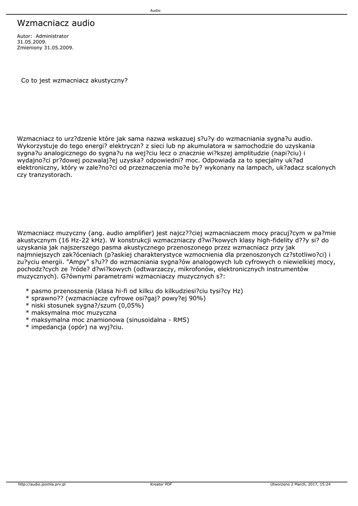 Audio Wzmacniacz audio Autor: Administrator 31.05.2009. Zmieniony 31.05.2009. Co to jest wzmacniacz akustyczny? Wzmacniacz to urz?dzenie które jak sama nazwa wskazuej s?u?y do wzmacniania sygna?u audio. Wykorzystuje do tego energi? elektryczn? z sieci lub np akumulatora w samochodzie do uzyskania sygna?u analogicznego do sygna?u na wej?ciu lecz o znacznie wi?kszej amplitudzie (napi?ciu) i wydajno?ci pr?dowej pozwalaj?ej uzyska? odpowiedni? moc. Odpowiada za to specjalny uk?ad elektroniczny, który w zale?no?ci od przeznaczenia mo?e by? wykonany na lampach, uk?adacz scalonych czy tranzystorach. Wzmacniacz muzyczny (ang. audio amplifier) jest najcz??ciej wzmacniaczem mocy pracuj?cym w pa?mie akustycznym (16 Hz-22 kHz). W konstrukcji wzmaczniaczy d?wi?kowych klasy high-fidelity d??y si? do uzyskania jak najszerszego pasma akustycznego przenoszonego przez wzmacniacz przy jak najmniejszych zak?óceniach (p?askiej charakterystyce wzmocnienia dla przenoszonych cz?stotliwo?ci) i zu?yciu energii. "Ampy" s?u?? do wzmacniania sygna?ów analogowych lub cyfrowych o niewielkiej mocy, pochodz?cych ze ?róde? d?wi?kowych (odtwarzaczy, mikrofonów, elektronicznych instrumentów muzycznych). G?ównymi parametrami wzmacniaczy muzycznych s?: * * * * * * pasmo przenoszenia (klasa hi-fi od kilku do kilkudziesi?ciu tysi?cy Hz) sprawno?? (wzmacniacze cyfrowe osi?gaj? powy?ej 90%) niski stosunek sygna?/szum (0,05%) maksymalna moc muzyczna maksymalna moc znamionowa (sinusoidalna - RMS) impedancja (opór) na wyj?ciu. http://audio.joomla.prv.pl Kreator PDF Utworzono 2 March, 2017, 15:24