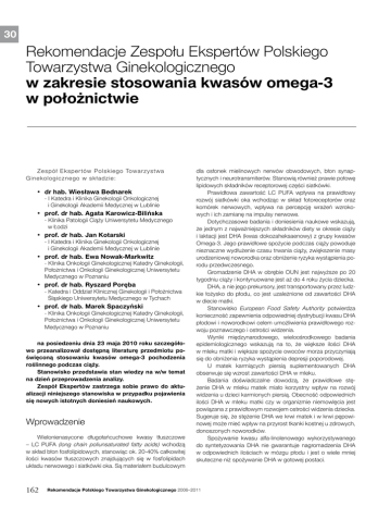 30 Rekomendacje Zespołu Ekspertów Polskiego Towarzystwa Ginekologicznego w zakresie stosowania kwasów omega-3 w położnictwie Zespół Ekspertów Polskiego Towarzystwa Ginekologicznego w składzie: • dr hab. Wiesława Bednarek - I Katedra i Klinika Ginekologii Onkologicznej i Ginekologii Akademii Medycznej w Lublinie • prof. dr hab. Agata Karowicz-Bilińska - Klinika Patologii Ciąży Uniwersytetu Medycznego w Łodzi • prof. dr hab. Jan Kotarski - I Katedra i Klinika Ginekologii Onkologicznej i Ginekologii Akademii Medycznej w Lublinie • prof. dr hab. Ewa Nowak-Markwitz - Klinika Onkologii Ginekologicznej Katedry Ginekologii, Położnictwa i Onkologii Ginekologicznej Uniwersytetu Medycznego w Poznaniu • prof. dr hab. Ryszard Poręba - Katedra i Oddział Klinicznej Ginekologii i Położnictwa Śląskiego Uniwersytetu Medycznego w Tychach • prof. dr hab. Marek Spaczyński - Klinika Onkologii Ginekologicznej Katedry Ginekologii, Położnictwa i Onkologii Ginekologicznej Uniwersytetu Medycznego w Poznaniu na posiedzeniu dnia 23 maja 2010 roku szczegółowo przeanalizował dostępną literaturę przedmiotu poświęconą stosowaniu kwasów omega-3 pochodzenia roślinnego podczas ciąży. Stanowisko przedstawia stan wiedzy na w/w temat na dzień przeprowadzenia analizy. Zespół Ekspertów zastrzega sobie prawo do aktualizacji niniejszego stanowiska w przypadku pojawienia się nowych istotnych doniesień naukowych. Wprowadzenie Wielonienasycone długołańcuchowe kwasy tłuszczowe – LC PUFA (long chain poliunsaturated fatty acids) wchodzą w skład błon fosfolipidowych, stanowiąc ok. 20-40% całkowitej ilości kwasów tłuszczowych znajdujących się w fosfolipidach układu nerwowego i siatkówki oka. Są materiałem budulcowym 162 dla osłonek mielinowych nerwów obwodowych, błon synap tycznych i neurotransmiterów. Stanowią również prawie połowę lipidowych składników receptorowej części siatkówki. Prawidłowa zawartość LC PUFA wpływa na prawidłowy rozwój siatkówki oka wchodząc w skład fotoreceptorów oraz komórek nerwowych, wpływa na percepcję wrażeń wzroko wych i ich zamianę na impulsy nerwowe. Dotychczasowe badania i doniesienia naukowe wskazują, że jednym z najważniejszych składników diety w okresie ciąży i laktacji jest DHA (kwas dokozaheksaenowy) z grupy kwasów Omega-3. Jego prawidłowe spożycie podczas ciąży powoduje nieznaczne wydłużenie czasu trwania ciąży, zwiększenie masy urodzeniowej noworodka oraz obniżenie ryzyka wystąpienia po rodu przedwczesnego. Gromadzenie DHA w obrębie OUN jest najwyższe po 20 tygodniu ciąży i kontynuowane jest aż do 4 roku życia dziecka. DHA, a nie jego prekursory, jest transportowany przez ludz kie łożysko do płodu, co jest uzależnione od zawartości DHA w diecie matki. Stanowisko European Food Safety Authority potwierdza konieczność zapewnienia odpowiedniej dystrybucji kwasu DHA płodowi i noworodkowi celem umożliwienia prawidłowego roz woju poznawczego i ostrości widzenia. Wyniki międzynarodowego, wieloośrodkowego badania epidemiologicznego wskazują na to, że większe ilości DHA w mleku matki i większe spożycie owoców morza przyczyniają się do obniżenia ryzyka wystąpienia depresji poporodowej. U matek karmiących piersią suplementowanych DHA obserwuje się wzrost zawartości DHA w mleku. Badania doświadczalne dowodzą, że prawidłowe stę żenie DHA w mleku matek miało korzystny wpływ na rozwój widzenia u dzieci karmionych piersią. Obecność odpowiednich ilości DHA w mleku matki czy w organizmie niemowlęcia jest powiązana z prawidłowym rozwojem ostrości widzenia dziecka. Sugeruje się, że stężenie DHA we krwi matek i w krwi pępowi nowej może mieć wpływ na przyrost tkanki kostnej u zdrowych, donoszonych noworodków. Spożywanie kwasu alfa-linolenowego wykorzystywanego do syntetyzowania DHA nie gwarantuje nagromadzenia DHA w odpowiednich ilościach w mózgu płodu i jest o wiele mniej skuteczne niż spożywanie DHA w gotowej postaci. Rekomendacje Polskiego Towarzystwa Ginekologicznego 2006–2011 Rekomendacje PTG w zakresie stosowania kwasów omega-3 w położnictwie. Według badania przeprowadzonego w 2008 roku podawa nie dawki 200mg DHA dziennie nie zwiększało stężenia DHA we krwi pępowinowej. Dopiero dzienna dawka 500mg DHA po wodowała podniesienie stężenia DHA we krwi pępowinowej. Głównym źródłem DHA w diecie są tłuste ryby morskie, owoce morza oraz algi morskie. Spożycie DHA w Polsce Badania przeprowadzone wśród osób dorosłych w Polsce wskazują, że spożycie ryb morskich i owoców morza jest wyjątkowo niskie. Kobiety w Polsce średnio spożywają 15 gramów ryb dzien nie, gdzie zalecane dzienne spożycie wynosi 30g. W województwach takich jak: świętokrzyskie, śląskie, pod karpackie, lubuskie, kujawsko-pomorskie średnie spożycie ryb przez kobiety wynosi poniżej 10g dziennie, co może wskazy wać na niedobór DHA. W organizmie człowieka naturalna synteza DHA, która może zachodzić z prekursorów takich jak: ALA (kwas alfa li nolenowy obecny np. w oleju lnianym) i EPA (kwas eikozapen taenowy) jest niewystarczająca dla pokrycia zapotrzebowania organizmu. Wydajność tego procesu jest znikoma i uwarun kowana osobniczo, dlatego też DHA powinno być podawane wraz z pożywieniem. Polskie Towarzystwo Pediatryczne (PTP) wspólnie z Polskim Towarzystwem Badań nad Miażdżycą (PTBnM) wydało zalecenia w celu przeciwdziałania stanom niedoborowym wielonienasyconych kwasów tłuszczowych omega-3 w żywieniu kobiet w ciąży, niemowląt i dzieci w Polsce. Należy jednak zalecać ostrożność w spożywaniu ryb mor skich kobietom w ciąży i dzieciom do lat 7. Państwowy Zakład Higieny w październiku 2007 roku wskazuje, że „wskutek zanieczyszczenia środowiska, łososie i śledzie bałtyckie mogą zawierać podwyższone poziomy dioksyn oraz polichlorowanych bifenyli (PCB), które gromadzą się w tłuszczu tych ryb.