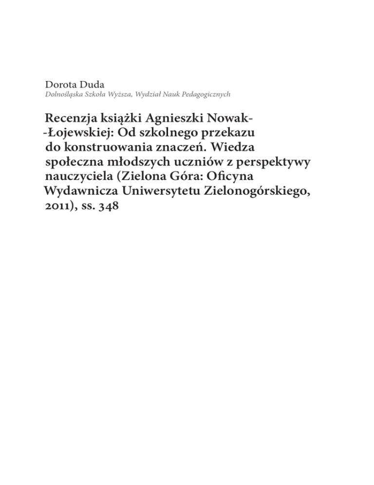 Dorota Duda Dolnośląska Szkoła Wyższa, Wydział Nauk Pedagogicznych Recenzja książki Agnieszki Nowak-Łojewskiej: Od szkolnego przekazu do konstruowania znaczeń. Wiedza społeczna młodszych uczniów z perspektywy nauczyciela (Zielona Góra: Oficyna Wydawnicza Uniwersytetu Zielonogórskiego, 2011), ss. 348 Kontakt: Dorota Duda e-mail: [email protected] Jak cytować: Duda, D. (2016). Recenzja książki Agnieszki Nowak-Łojewskiej: Od szkolnego przekazu do konstruowania znaczeń: wiedza społeczna młodszych uczniów z perspektywy nauczyciela (Zielona Góra: Oficyna Wydawnicza Uniwersytetu Zielonogórskiego, 2011), ss. 348. Forum Oświatowe, 28(1), … Pobrano z: http:// forumoswiatowe.pl/index.php/czasopismo/article/view/435 How to cite: Duda, D. (2016). Recenzja książki Agnieszki Nowak-Łojewskiej: Od szkolnego przekazu do konstruowania znaczeń: wiedza społeczna młodszych uczniów z perspektywy nauczyciela (Zielona Góra: Oficyna Wydawnicza Uniwersytetu Zielonogórskiego, 2011), ss. 348. Forum Oświatowe, 28(1), … Retrieved from http:// forumoswiatowe.pl/index.php/czasopismo/article/view/435 Po książkę Agnieszki Nowak-Łojewskiej sięgnęłam z uwagi na zainteresowania zagadnieniem wiedzy społecznej, zwłaszcza jej wymiarem, odnoszącym się do edukacji globalnej i międzykulturowej (edukacja międzykulturowa obejmuje dla mnie szerokie rozumienie relacji międzykulturowych, nie tylko w aspekcie etnicznym, religijnym, ale i społecznym). Do przyjęcia takiej perspektywy zainspirował mnie tekst Szkudlarka (2011), którą rozpatruję pod kątem edukacji przedszkolnej. Publikacja Nowak-Łojewskiej (2011) składa się z dwóch części. Pierwsza porusza ogólne rozumienie wiedzy, osadzone w różnych paradygmatach, przedstawia również kulturowe, polityczne oraz społeczne uwikłania wiedzy i edukacji. Druga część koncentruje się na badaniach i właściwym przedmiocie zainteresowań autorki (oraz moich), wiedzy społecznej. Wiedza społeczna jest pojmowana w książce jako element wiedzy szkolnej, który, na drodze interakcji z innymi, „stwarza warunki do budowania [przez jednostkę] obrazu siebie, innych i otaczającego świata w realnym kontekście społeczno-kulturowym” (Nowak-Łojewska, 2011, s. 6). Rozpatrywana jest w dwóch, nieodłącznych od siebie (według autorki i mnie) paradygmatach konstrukcjonizmu poznawczego i społecznego. Badaczkę interesują zatem treści wiedzy społecznej, jakie są omawiane z dziećmi, czyli co nauczycielki rozumieją? Jaką tematykę mają na myśli? Kiedy mowa jest o wiedzy społecznej oraz to, w jaki sposób tę wiedzę konstruują? Wyniki badań nie są zaskakujące. Wyłania się z nich obraz szkoły i nauczycielskich działań, którego jesteśmy świadomi i który dobrze znamy, o którym już wiele napisano. Zdajemy sobie zatem sprawę ze sposobu konstruowania wiedzy w szkole, w której dominuje „edukacja bankowa”, podający model nauczania, nieadekwatność kulturowa, brak miejsca na interpretację i krytyczne myślenie; z tego, że dziecko postrzega się jako „System z Deficytami”, okazjonalnie jako „Słodkiego Elfa” (Klus-Stańska, 2005). Tym, co najbardziej interesuje mnie w recenzowanej pozycji, są treści wiedzy społecznej i pojmowanie ich przez badane nauczycielki i autorkę. Wypowiedzi nauczycielek wobec tematyki, jaką poruszają na zajęciach z dziećmi również, z jednej strony, nie budzą zaskoczenia (wystarczy przejrzeć szkolne podręczniki); zagadnienia te prezentują treści „legalne”, „bezpieczne”, „nieproblematyczne”, a wręcz nierealne. Z drugiej strony, sposób argumentowania nauczycielek tego, 250 Forum Oświatowe 28(1) Recenzje że pewne treści nie są w szkole, polskim dzieciom, potrzebne, okazały się wstrząsające. Nowak-Łojewska stara się zwrócić naszą uwagę na problem zaniedbywania i pomijania wielu treści, uznawanych jako, m.in. nieodpowiednie dla dzieci w tym wieku czy też niewystępujące w oficjalnych materiałach, a więc uważane za niepotrzebne. Nauczycielki tym samym prowokują do wypowiedzenia opinii o ich bezrefleksyjności, znieczulicy, o braniu udziału w systematycznym usuwaniu człowieka (i jego różnorodnych doświadczeń i historii) ze szkoły. Z tego też względu materiał, który udostępnia nam Nowak-Łojewska, jest cenny i prowokujący do pytań o edukację krytyczną dzieci, edukację krytyczną (przyszłych i podnoszących swoje kwalifikacje) nauczycieli, o miejsce człowieka w szkole, o miejsce człowieka w świecie. Książkę tę rozpatruję jednak na dwóch poziomach. Pierwszy poziom odnosi się do badań autorki, do rozpoznania przez nią obszaru, który wymaga sproblematyzowania, i do prezentowanych wypowiedzi nauczycielek, które burzą spokój. Drugi poziom odnoszę do warstwy językowej tekstu, który może wskazywać na małą krytyczność autorki wobec niektórych poruszanych przez nią zagadnień, a przez to może prowadzić do uproszczeń i powielania uprzedzeń. Interesuje mnie także (niepogłębione) zwrócenie uwagi na system kształcenia nauczycieli oraz na nagłe, dla mnie, zakończenie badań. stereotypy w języku i niekonsekwencja w stawianych wnioskach Kiedy zapoznałam się z częścią badawczą książki, w pierwszym odruchu uznałam ją za taką, którą powinien przeczytać każdy, kto jest odpowiedzialny za edukację dzieci lub się do tego przymierza (z powodów, o których pisałam powyżej). W dalszych rozważaniach zrodziły się we mnie pewne zastrzeżenia. Autorka w swoich badaniach wyróżnia dwie grupy tematyczne, odnoszące się możliwie bezpośrednio do codziennego życia dziecka, sfery rodzinnej, sfery intymnej, bliskiej terytorialnie, oraz zwracające uwagę na dziecko i jego relacje ze światem, postrzeganiem innych kultur, świadomością bieżących problemów i sytuacji na świecie. Do pierwszego obszaru nie mam wielu zastrzeżeń, choć w podejmowanych przez autorkę wątkach nie pojawi