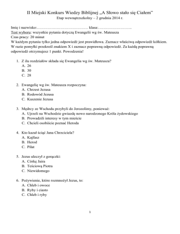 II Miejski Konkurs Wiedzy Biblijnej „A Słowo stało się Ciałem” Etap wewnątrzszkolny – 2 grudnia 2014 r. Imię i nazwisko:………………………………… klasa:…………………….. Test wyboru: wszystkie pytania dotyczą Ewangelii wg św. Mateusza Czas pracy: 20 minut W każdym pytaniu tylko jedna odpowiedź jest prawidłowa. Zaznacz właściwą odpowiedź kółkiem. W razie pomyłki przekreśl znakiem X i zaznacz poprawną odpowiedź. Za każdą poprawną odpowiedź otrzymujesz 1 punkt. Powodzenia! 1. Z ilu rozdziałów składa się Ewangelia wg św. Mateusza? A. 26 B. 30 C. 28 2. Ewangelię wg św. Mateusza rozpoczyna: A. Chrzest Jezusa B. Rodowód Jezusa C. Kuszenie Jezusa 3. Mędrcy ze Wschodu przybyli do Jerozolimy, ponieważ: A. Ujrzeli na Wschodzie gwiazdę nowo narodzonego Króla żydowskiego B. Prowadzili interesy w tym mieście C. Chcieli osobiście poznać Heroda 4. Kto kazał ściąć Jana Chrzciciela? A. Kajfasz B. Herod C. Piłat 5. Jezus uleczył z gorączki: A. Córkę Jaira B. Teściową Piotra C. Niewidomego 6. Pożywienie, które rozmnożył Jezus, to: A. Chleb i owoce B. Ryby i ciasto C. Chleb i ryby 1 7. Jezus przyjął chrzest: A. Od Piotra B. Od Jana Chrzciciela C. Od arcykapłanów 8. Jako pierwszych na swoich uczniów Jezus powołał: A. Filipa i Bartłomieja B. Jakuba i Jana C. Szymona zwanego Piotrem i Andrzeja 9. Człowiek roztropny z przypowieści Jezusa zbudował swój dom: A. Na piasku B. Na skale C. Na trawie 10. Józef z Maryją i Dzieckiem uciekli do Egiptu, ponieważ: A. Chcieli tam szukać pracy B. Taki nakaz otrzymał Józef we śnie od anioła C. Chcieli głosić słowo Boże w Egipcie 11. Józef z Maryją i Dzieckiem po powrocie z Egiptu zamieszkali: A. W Nazarecie B. W Betlejem C. W Jerozolimie 12. Miejscowość, w której narodził się Jezus, to: A. Betlejem B. Nazaret C. Jerozolima 13. Jezus przebywał na pustyni: A. 30 dni i 30 nocy B. 40 dni i 40 nocy C. Tydzień 14. Jezus przyjął chrzest: A. W rzece Jordan B. W Jeziorze Genezaret C. Na pustyni podczas postu 2 15. Jezus porównał Królestwo niebieskie do ziarna: A. Pszenicy B. Żyta C. Gorczycy 16. Ile owiec zostawia pasterz w przypowieści Jezusa, by szukać zabłąkanej? A. 100 B. 99 C. 1 17. W czasie przemienienia Jezusa Jemu i trzem uczniom ukazali się: A. Mojżesz i Eliasz B. Jonasz i Mojżesz C. Abraham i Jakub 18. Jezus obiecał dać klucze Królestwa niebieskiego: A. Józefowi B. Janowi Chrzcicielowi C. Piotrowi 19. Według słów Jezusa, gdy brat zawini względem nas, mamy: A. Przebaczyć 77 razy, czyli zawsze B. Przebaczyć tylko kilka razy C. Domagać się przeprosin 20. Wychodząc z Jerycha, Jezus uzdrowił: A. Opętanego B. Dwóch niewidomych C. Sparaliżowanego 21. Nierozsądne panny z przypowieści Jezusa nie zabrały ze sobą: A. Oliwy B. Lampy C. Oliwy i lampy 22. Arcykapłani dali Judaszowi za zdradę Jezusa: A. 20 srebrników B. 30 srebrników C. 40 srebrników 3 23. Najwyższy kapłan, który sądził Jezusa, to: A. Piłat B. Herod C. Kajfasz 24. Poprosił Piłata o ciało Jezusa: A. Piotr B. Jan C. Józef 25. Podczas przemienienia Jezusa byli z Nim: A. Piotr, Jan i Jakub B. Jan, Filip i Bartłomiej C. Piotr, Andrzej i Mateusz 26. Miejsce, w którym Jezus modlił się przed męką, to: A. Góra błogosławieństw B. Getsemani C. Golgota 27. Do niesienia krzyża Jezusa żołnierze przymusili: A. Szymona z Cyreny B. Setnika C. Jana Apostoła 28. Miejsce, na którym ukrzyżowano Jezusa, to: A. Synaj B. Tabor C. Golgota 29. Ile razy Piotr wyparł się Jezusa: A. Wcale się nie wyparł B. 3 razy C. 2 razy 30. Uczniowie spotkali Jezusa po Jego zmartwychwstaniu w: A. Samarii B. Judei C. Galilei Łącznie uzyskano: ……………………. (wypełnia osoba sprawdzająca) 4 Klucz odpowiedzi: Za każdą poprawną odpowiedź uczeń otrzymuje 1 punkt. Maksymalna liczba punktów za test – 30. Nr pytania 1 2 3 4 5 6 7 8 9 10 11 12 13 14 15 Odpowiedź C B A B B C B C B B A A B A C Nr pytania 16 17 18 19 20 21 22 23 24 25 26 27 28 29 30 Odpowiedź B B A C B C A C A B A B C 5 C A