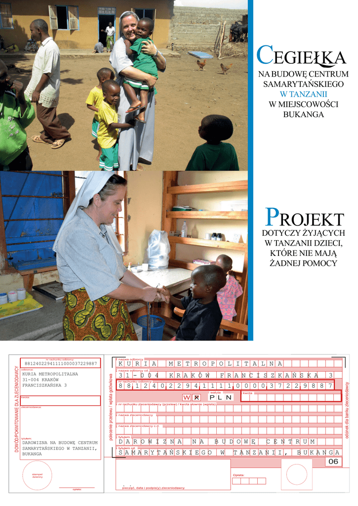 Cegie ka na budowę Centrum Samarytańskiego w Tanzanii w miejscowości BukangA PROJEKT DOTYCZY ŻYJĄCYCH W TANZANII DZIECI, KTÓRE NIE MAJĄ ŻADNEJ POMOCY kuria metropolitalna 31-004 kraków franciszkańska 3 kwota: zleceniodawca: darowizna na budowę centrum samarytańskiego w tanzanii, bukanga m e t r o p o l i t a l n a 3 1 - 0 0 4 k r a k ó w nazwa odbiorcy cd. polecenie przelewu / wpłata gotówkowa DOWÓD/POKWITOWANIE DLA ZLECENIODAWCY odbiorca: k u r i a nr rachunku odbiorcy f r a n c i s z k a ń s k a 3 8 8 1 2 4 0 2 2 9 4 1 1 1 1 0 0 0 0 3 7 2 2 9 8 8 7 W X P waluta P L N kwota nazwa zleceniodawcy nazwa zleceniodawcy c.d. d a r o w i z n a n a samarytańskiego stempel dzienny . . b u d o w ę w c e n t r u m tanzanii, bukanga 06 odcinek dla banku zleceniodawcy nazwa odbiorcy nr rachunku odbiorcy 88124022941111000037229887 Cegie ka na budowę Centrum Samarytańskiego w Tanzanii w miejscowości Bukanga Budowa przyszłości i nadziei dla dzieci porzuconych lub nie mających rodziców. Centrum Samarytańskie Nasz Projekt dotyczy żyjących w Tanzanii dzieci, które nie mają żadnej pomocy od swoich rodziców lub też rodzin. Priorytetem projektu jest budowa przyszłości dla dzieci poprzez edukację oraz otoczenie ich opieką. W całej Tanzanii, jak również w naszym rejonie Mara jest bardzo dużo dzieci, które potrzebują pomocy innych, dlatego też powstała myśl, aby zbudować dla nich Centrum, które zapewni im przyszłość. W Centrum Samarytańskim, bo taką ma przyjąć nazwę, szczególnie będzie zwracało się uwagę na edukację, ale również na rozwój kultury i sportu. Dzieci zamieszkujące ośrodek będą dzieliły się swoim doświadczeniem z dziećmi z pobliskiej wioski. Również dla dzieci z zewnątrz będą prowadzone różne zajęcia wychowawcze. Szczególną uwagę będziemy zwracać na naukę języka angielskiego, który jest niezbędny w budowaniu przyszłości, gdyż wszystkie egzaminy na terenie Tanzanii odbywają się właśnie w tym języku. Pomoc medyczna Ze względu na to, iż w Centrum ma również powstać Ośrodek Zdrowia, dzieci jak i mieszkańcy wioski Bukanga będą korzystać z pomocy medycznej. Będą też przeprowadzane seminaria na tematy medyczne, dotyczące dbania o zdrowie. Zazwyczaj dzieci nie mające wsparcia rodziny są dyskryminowane, wykorzystywane przez niektórych, dlatego dzięki temu Centrum chcemy walczyć z tym negatywnym zjawiskiem, występującym w społeczeństwie. Siostry Samarytanki cały czas będą przebywać z nimi, budując domowe środowisko. Nie mają nikogo Centrum ma powstać w Bukanga. Jest to wioska leżąca ok. 10 km od Musomy, licząca 1900 mieszkańców, którzy w większości są rybakami albo rolnikami. Jest to bardzo biedna społeczność. Na terenie tej wioski jest już 33 dzieci, które nie mają nikogo. Ogólnie Ośrodek pomieści 72 dzieci. Cztery skrzydła Centrum Samarytańskie to budynek składający się z czterech skrzydeł: Pierwszy ma obejmować Ośrodek Zdrowia i pokoje dla chorych, drugie skrzydło to klasy dla dzieci oraz część pokoi sypialnych, trzecie skrzydło to same pokoje sypialne i czwarte skrzydło to część gospodarcza, a więc kuchnia, jadalnia, magazyn na żywność, pralnia, szwalnia. Powierzchnia zabudowy wynosi 1000 m2. Centrum będzie zbudowane na terenie, który otrzymaliśmy od tutejszego Biskupa. Już zaczęliśmy budowę płotu, dzięki pomocy Caritas Polska z siedzibą w Warszawie. Ufamy, że znajdą się Dobroczyńcy, którzy będą chcieli włączyć się razem z nami w budowę przyszłości naszych dzieci. s. Rut Ciesielska, samarytanka z Tanzanii Osoby pragnące pomóc w dziele budowy Centrum Samarytańskiego w Tanzanii prosimy o przesłanie „cegiełki” na podany adres i numer konta: Kuria Metropolitalna 31-004 Kraków ul. Franciszkańska 3 Numer konta: 88 1240 2294 1111 0000 3722 9887 z dopiskiem: Darowizna na budowę Centrum Samarytańskiego w Tanzanii, Bukanga. Zamieszczony blankiet służy do przesłania ofiary na ten cel. Nadmieniamy, że ofiarę złożoną na ten cel można odpisać sobie od podatku. Podstawa prawna: Ustawa z 26 lipca 1991 r. o podatku dochodowym od osób fizycznych – tekst jedn. Dz. U. z 2000 r. Nr 14, poz. 176 z późn. zm. Za wszelkie ofiary składamy serdeczne: Bóg zapłać!