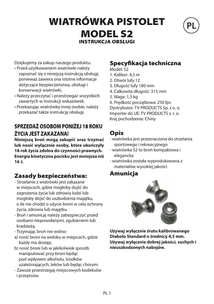 WIATRÓWKA PISTOLET MODEL S2 PL INSTRUKCJA OBSŁUGI Specyfikacja techniczna Dziękujemy za zakup naszego produktu. • Przed użytkowaniem wiatrówki należy zapoznać się z niniejszą instrukcją obsługi, ponieważ zawiera ona istotne informacje dotyczące bezpieczeństwa, obsługi i konserwacji wiatrówki. • Należy przeczytać i przestrzegać wszystkich zawartych w instrukcji wskazówek. • Przekazując wiatrówkę innej osobie, należy przekazać także instrukcję obsługi. Model: S2 1. Kaliber: 4,5 m 2. Otwór lufy 12 3. Długość lufy 180 mm 4. Całkowita długość: 315 mm 5. Waga: 1,3 kg 6. Prędkość początkowa: 250 fps Dystrybutor: TV PRODUCTS Sp. z o. o. Importer do UE: TV PRODUCTS s. r. o. Kraj pochodzenia: Chiny SPRZEDAŻ OSOBOM PONIŻEJ 18 ROKU ŻYCIA JEST ZAKAZANA! Opis Zasady bezpieczeństwa: Amunicja Niniejszą broń mogą zakupić oraz trzymać lub nosić wyłącznie osoby, które ukończyły 18 rok życia zdolna do czynności prawnych. Energia kinetyczna pocisku jest mniejsza niż 16 J. - Strzelanie z wiatrówki jest zakazane w miejscach, gdzie mogłoby dojść do zagrożenia życia lub zdrowia ludzi lub mogłoby dojść do uszkodzenia majątku, o ile nie chodzi o użycie broni w celu ochrony życia, zdrowia lub majątku. - Broń i amunicję należy zabezpieczyć przed osobami niepowołanymi, zgubieniem lub kradzieżą. - Trzymając broń nie wolno: a) nosić broni na widoku w miejscach, gdzie każdy ma dostęp, b) nosić broni lub w jakikolwiek sposób manipulować przy broni będąc pod wpływem alkoholu, środków uzależniających, leków lub będąc chorym. - Zawsze przestrzegaj miejscowych kodeksów i przepisów. - wiatrówka jest przeznaczona do strzelania sportowego i rekreacyjnego - wiatrówka S2 to broń kompaktowa i elegancka - wiatrówka została wyprodukowana z materiałów wysokiej jakości Używaj wyłącznie śrutu kalibrowanego Diabolo Standard o średnicy 4,5 mm. Używaj wyłącznie dobrej jakości, suchych i nieuszkodzonych nabojów. PL 1 Ładowanie śrutu - Nigdy nie używaj broni, która jawi oznaki korozji. W przypadku posługiwania się bronią niezgodnie z jej przeznaczeniem i opisem w instrukcji, sprzedawca ani producent nie biorą odpowiedzialności za ewentualne szkody, obrażenia, uszkodzenia broni lub obrażenia użytkownika. Broń została sprawdzona w fabryce. Dostarczona broń jest nienabita. W przypadku stwierdzenia po zakupieniu jakichkolwiek wad lub uszkodzeń, broni nie należy używać. W takiej sytuacji należy skontaktować się ze sprzedawcą lub autoryzowanym punktem serwisowym. 1. Trzymaj kolbę w prawej ręce a lewą ręka chwyć przednią część lufy. Ruchem w dół złam lufę. 2. Lufę naciągaj do dołu do momentu, kiedy wyraźnie wyczuje się jej zatrzaśnięcie w dolnym położeniu. Lufa zostanie w dolnym położeniu. 3. Lewą ręką włóż śrut do lufy. Następnie trzymając za przednią część lufy ruchem w górę złożyć ją, aż do momentu jej zatrzaśnięcia. Oddanie strzału Podczas strzelania nigdy nie celuj do ludzi ani zwierząt! Upewnij się, że nikt nie wejdzie na linię strzału. 1. Podczas strzelania trzymaj kolbę w prawej ręce, palec wskazujący na spuście. 2. Prawym okiem patrz przez muszkę na cel. Teraz możesz nacisnąć na spust i wystrzelić. Pamiętaj: Ostrzeżenie Nie wywieraj nacisku na sprężynę zbyt długo. Nigdy nie strzelaj z broni na sucho (bez załadowanego śrutu). WAŻNE INFORMACJE DOTYCZĄCE BEZPIECZEŃSTWA OSTRZEŻENIE! NIEPRZESTRZEGANIE NINIEJSZYCH INSTRUKCJI MOŻE DOPROWADZIĆ DO POWAŻNEGO A NAWET ŚMIERTELNEGO ZRANIENIA OSÓB LUB USZKODZENIEM MAJĄTKU! - Niewłaściwe oraz niedbałe obchodzenie się z bronią może skutkować nieumyślnym wystrzałem w niezamierzonym kierunku. Wiatrówka nie jest zabawką. Przy jej eksploatacji zawsze należy zachować szczególną ostrożność. - Broni w żaden sposób nie przerabiaj ani nie naprawiaj. Wszelkie modyfikacje broni mogą być dokonywane tylko i wyłącznie przez specjalistów. Nieumiejętne obchodzenie się z bronią mogą doprowadzić do przypadkowego wystrzału lub spowodować uszkodzenie broni. - Używaj wyłącznie kalibrowanego śrutu Standard o średnicy 4,5 mm. Nigdy nie używaj innej lub uszkodzonej amunicji. - Zawsze traktuj broń jak naładowaną, sprawną i gotową do strzału. - Zawsze kieruj lufę w bezpieczne miejsce. Nigdy nie kieruj broni tam, gdzie nie chcesz strzelać. - Nigdy nie wierz innej osobie, że broń nie jest nabita. - Nigdy nie celuj i nie strzelaj, jeżeli kolba nie znajduje się w prawidłowej pozycji. Nieprzestrzeganie tego zalecenia grozi uszkodzeniem broni oraz obrażeniami. - Nigdy nie zostawiaj broni bez dozoru. Zawsze trzymaj bron w miejscu zabezpieczonym przed kradzieżą, z dala od dzieci. - Nie obsługuj broni, jeżeli jesteś zmęczony, śpiący lub pod wpływem alkoholu, narkotyków lub leków. - Nigdy nie pij alkoholu ani nie zażywaj żadnych narkotyków, jeżeli masz zamiar strzelać. - Nigdy nie kładź palca na spuście, jeżeli nie chcesz strzelać i nie jesteś przygotowany do strzału. - Nigdy nie noś broni trzymając palec na spuście. - Przed naładowaniem broni sprawdź, czy w lufie broni nic nie tkwi. - Zanim wycelujesz w tarczę i oddasz strzał upewnij się, że na drodze strzału ani w jej pobliżu nie ma osób i zwierząt, ani czy nic nie znajdzie się w momencie strzału. Pamiętaj, że amunicja może minąć cel i trafić osoby znajdujące się w pobliżu. - Nigdy nie strzelaj do wody. - Nigdy nie strzelaj w kierunków twardych przedmiotów jak kamień itp. - Chroń broń przez przypadkowym zrzuceniem lub uderzeniem. Jeżeli przez przypadek dojdzie do upuszczenia lub uderzenia wiatrówki, broni nie używaj. W takim przypadku skontaktuj się z autoryzowanym punktem serwisowym. - Wszelkie naprawy mogą być przeprowadzane wyłącznie przez wykwalifikowanych pracowników autoryzowanego punktu serwisowego. PL 2 Konserwacja broni 0 Przed użyciem zetrzyj śr